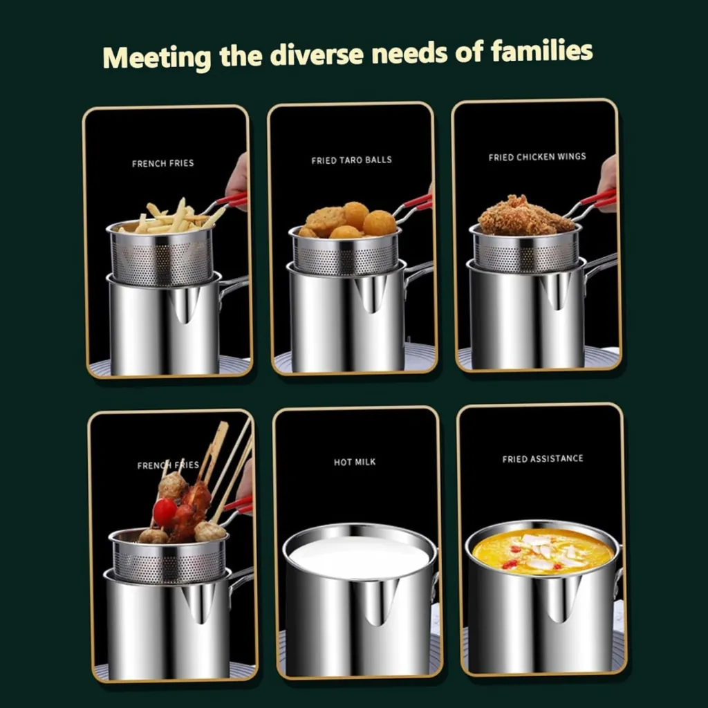Cook your favorite fried foods with ease using this 1.2L Stainless Steel Deep Fryer Pot. Designed for convenience and efficiency, it features a removable strainer basket, heat-resistant handle, and a durable stainless steel body that heats evenly for perfect frying results.This deep fryer pot is ideal for frying snacks like French fries, chicken, samosas, nuggets, and tempura at home. Its compact size is perfect for small kitchens, and the strainer helps drain excess oil, making cooking cleaner and healthier.