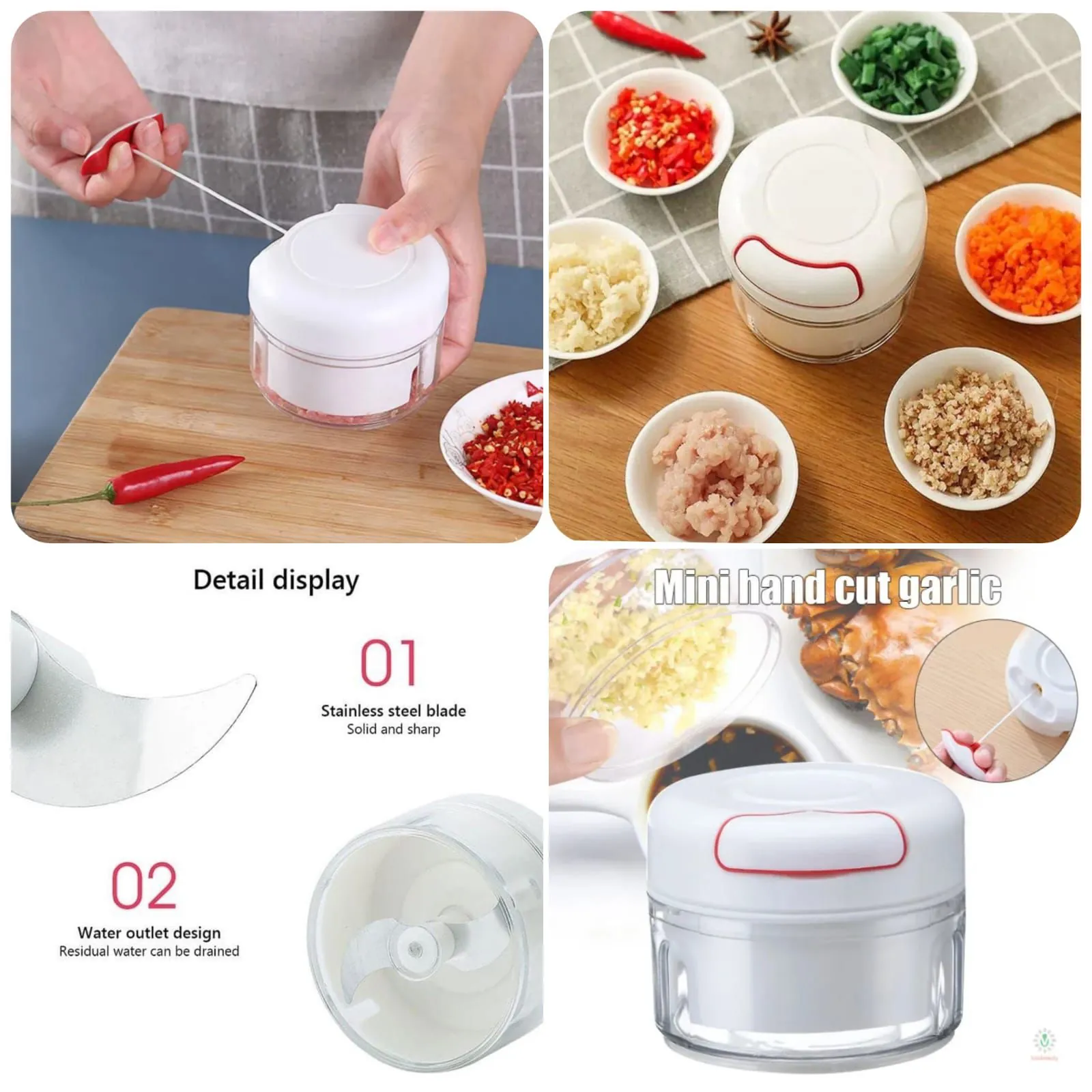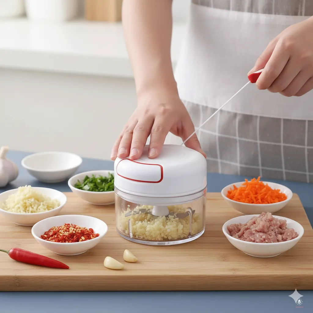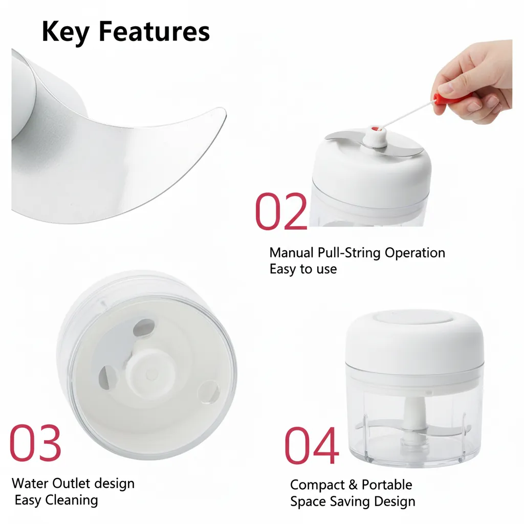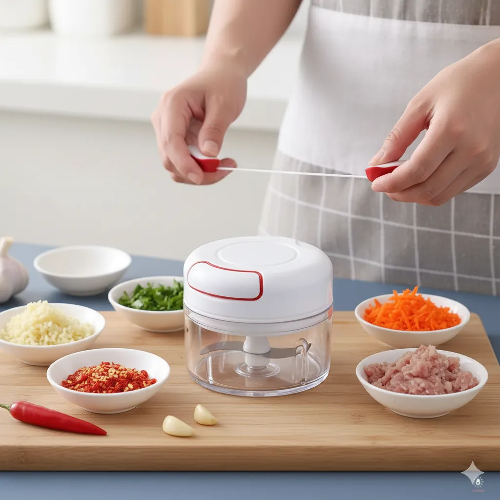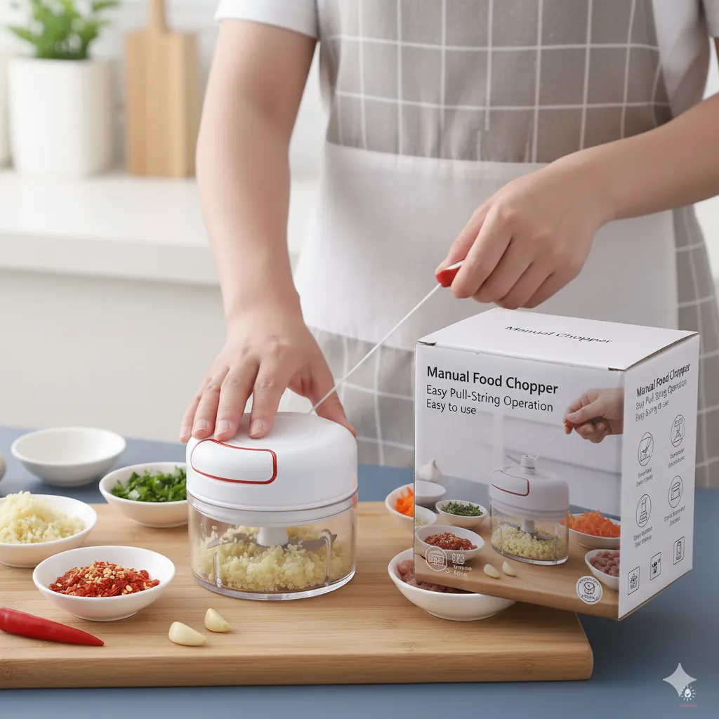 Mini Manual Food Chopper - Pull String Handheld Mincer for Garlic, Veggies, Nuts.Tired of tedious chopping and bulky electric gadgets? The Manual Pull-String Mini Food Chopper is your perfect compact kitchen assistant for preparing small quantities of ingredients. This chopper features a powerful, rotating stainless steel blade system activated by a simple pull-string mechanism—no electricity needed!.It's ideal for mincing garlic, onions, carrots, peppers, nuts, and herbs, making salsa, pesto, hummus, or baby food prep a breeze. The clear, durable container allows you to monitor the consistency, and the lid securely locks, preventing spills. Cleaning is simple—the blade and bowl are easy to rinse. Its compact size makes it perfect for small kitchens, RVs, camping, or for anyone who wants a simple, fast way to chop ingredients without the noise and fuss of a large food processor.