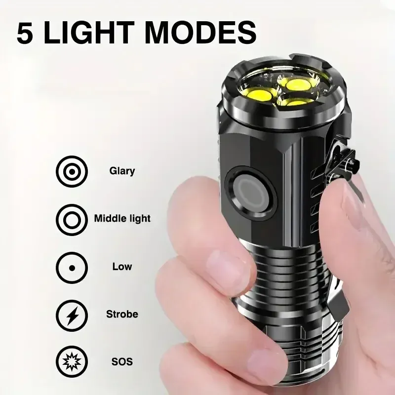 Light up your adventures with the Mini Portable Outdoor LED Flashlight, designed for powerful brightness and ultimate portability. Featuring a three-eyed high-lumen LED design, this rechargeable flashlight delivers strong and wide illumination — perfect for camping, hiking, power outages, and night-time use.