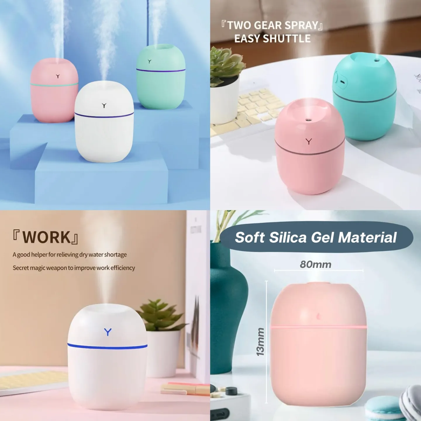 This mini portable USB air humidifier is designed to improve air quality and relieve dryness in small spaces. Its compact size makes it perfect for use on a desk, nightstand, or while traveling. Powered by USB, it can be easily connected to a computer, power bank, or USB adapter. The humidifier features two spray modes for adjustable mist output and operates silently, ensuring it won't disturb your work or sleep. Made from soft silica gel material, it's durable and safe to use.