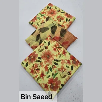 Discover the contemporary charm of Bin Saeed Lawn 2025 with this elegant 3-piece unstitched printed lawn suit for women. The set includes fabric for the shirt, dupatta (scarf), and trousers, all adorned with a stylish geometric print on high-quality, breathable lawn material. This unstitched fabric allows for complete customization to your preferred style and fit, ensuring comfort and elegance in warmer weather. The modern geometric patterns are a signature of Bin Saeed's sophisticated designs .Embrace the beauty of delicate floral artistry with this charming 3-piece unstitched lawn suit from the latest Bin Saeed collection. Perfect for the warm weather in Faisalabad and beyond, this ensemble features a soft color palette and a refreshing print, making it an ideal choice for your everyday style or casual gatherings. The unstitched fabric allows you the flexibility to create a perfectly tailored outfit that reflects your personal taste.