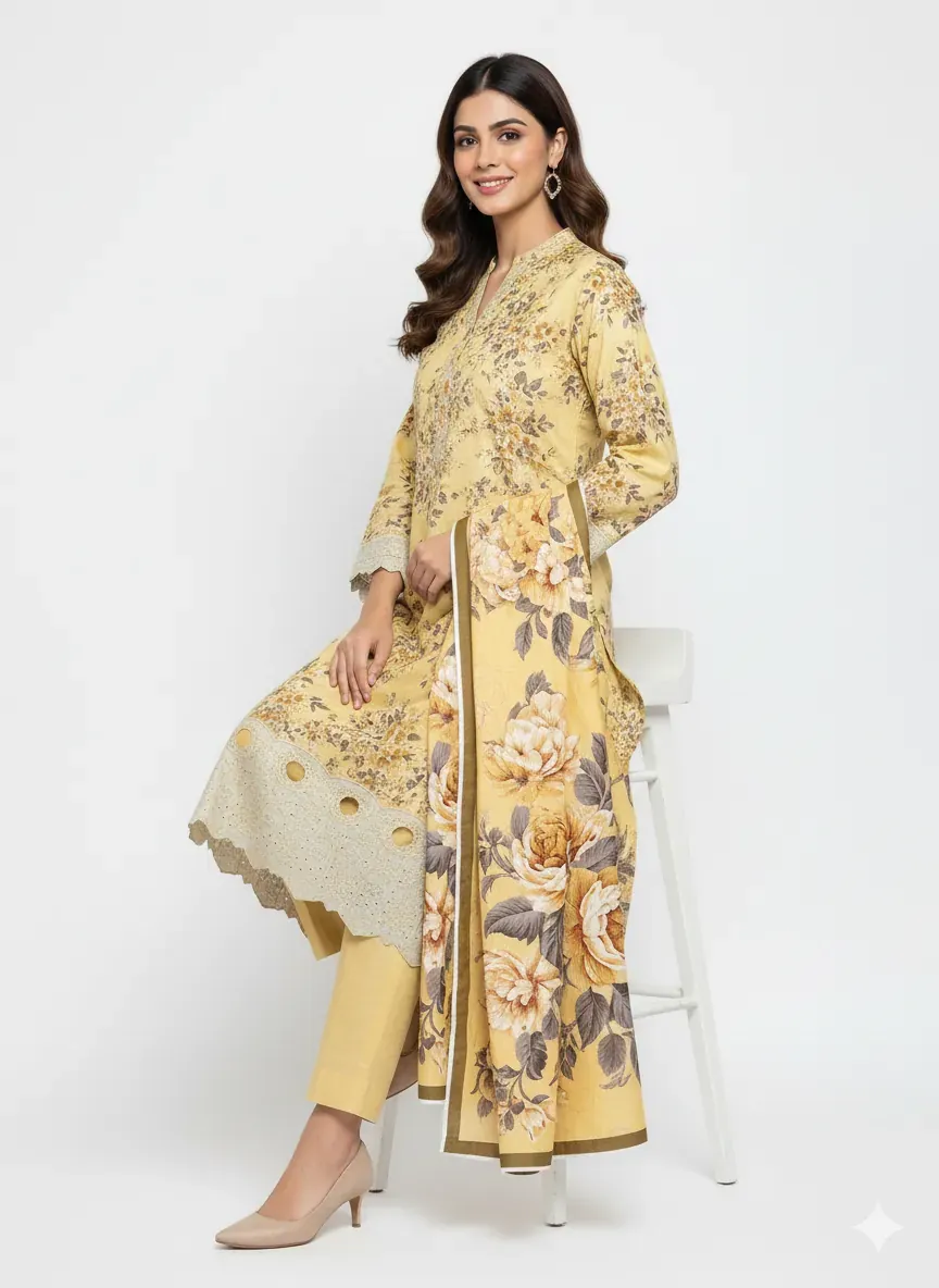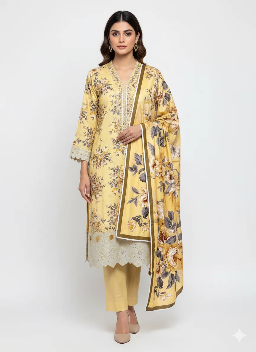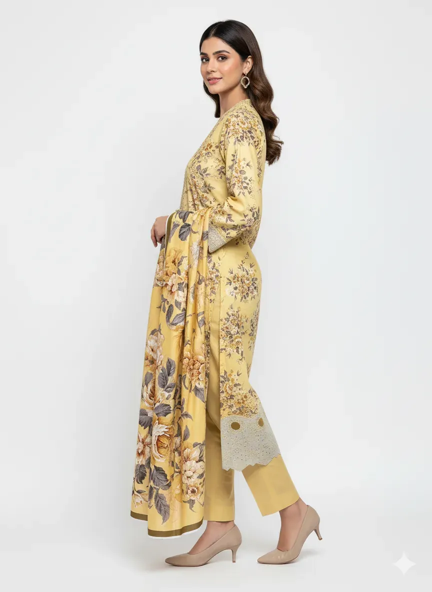 Elevate your winter wardrobe with this highly sought-after Iznik Winter Collection 2025 suit. Crafted from high-quality 72/72 linen, this 3-piece ensemble offers both warmth and elegance. The shirt is adorned with an intricate all-over digital print and features a fully embroidered front. The highlight is the meticulously crafted daman with beautiful applique work and delicate cutwork embroidery, adding a touch of sophistication. A same-stuff linen dupatta with a matching digital print completes the look. The suit comes in beautiful bag packing with an inlay card. We stand by the quality of this product, offering a 100% after-wash and money-back guarantee. Perfect for special occasions or daily wear, this suit promises comfort, durability, and timeless style.