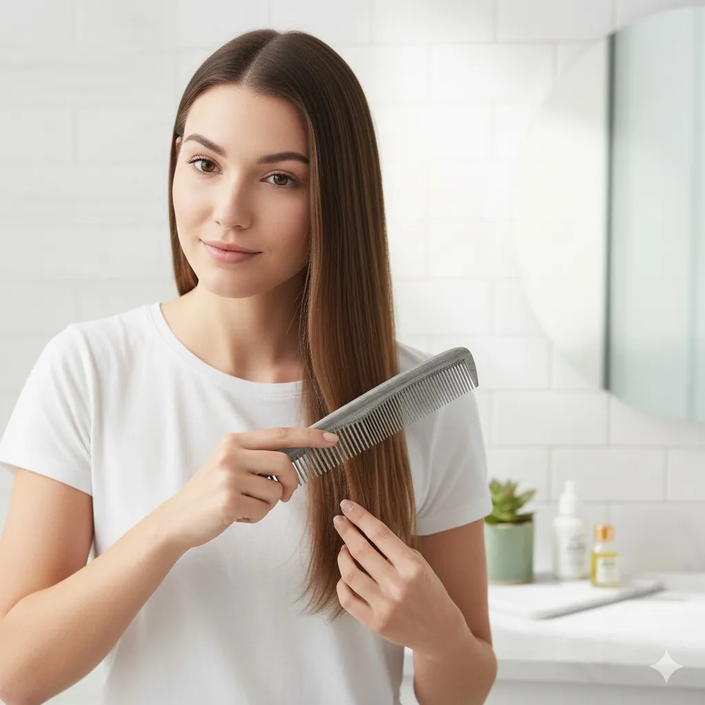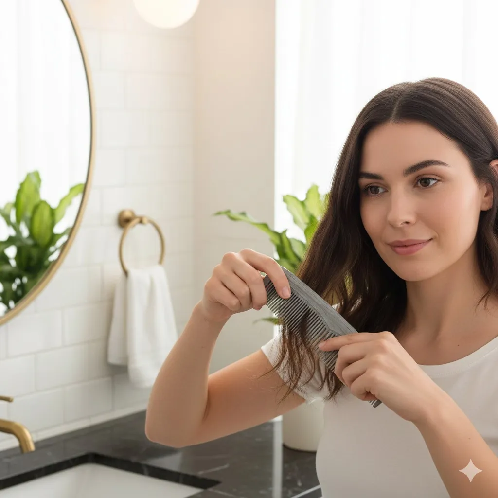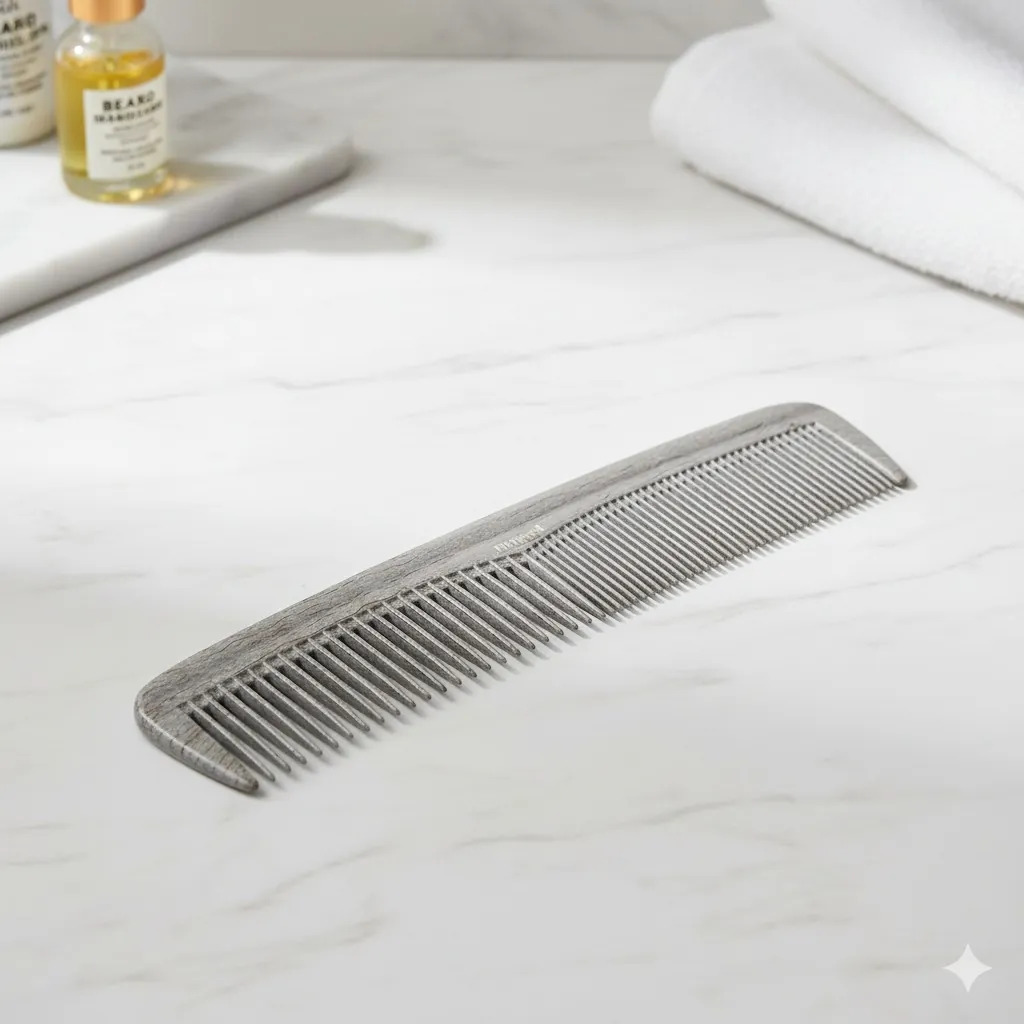 The finely spaced teeth are meticulously rounded to provide a soothing scalp massage with every stroke, which helps improve blood circulation and encourages stronger hair follicles. By evenly distributing your scalp’s natural oils from root to tip, it provides a natural conditioning effect that enhances shine and reduces dryness. Handcrafted for durability and a comfortable grip, this elegant grey wood comb is the perfect sustainable choice for those seeking professional grooming results at home.