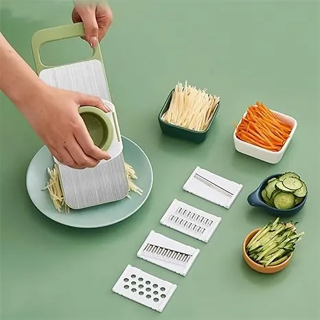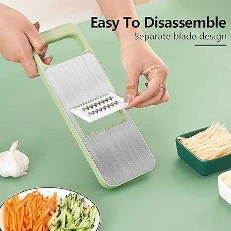 The Multifunctional 5-in-1 Vegetable Cutter Grater with Handle - 5 in 1 Enhanced Green Edition is a cutting-edge kitchen gadget crafted to revolutionize your food preparation process. Constructed from high-quality, rust-resistant stainless steel, this grater boasts a sleek green ergonomic handle that ensures a comfortable grip and seamless operation. It is equipped with 5 interchangeable blades, offering versatile cutting options including slicing, thick silk, fine wire, wavy cutting, and grinding. This tool is perfect for processing an array of ingredients such as carrots, cucumbers, potatoes, cheese, nuts, and even chocolate, allowing you to create uniform slices, delicate shreds, or fine powder effortlessly. The innovative hand crank mechanism reduces hand strain, while the non-slip base with a sturdy suction cup keeps the grater securely in place on any counter surface. Its detachable parts are designed for hassle-free cleaning—fully dishwasher safe—and come with a practical storage box to keep everything organized. Whether you’re cooking at home, managing a restaurant kitchen, or preparing daily meals, this grater saves valuable time, minimizes food waste, and enhances your culinary experience. With its premium build and safety-focused design, it’s a must-have tool for crafting delicious and healthy dishes with professional-grade results.