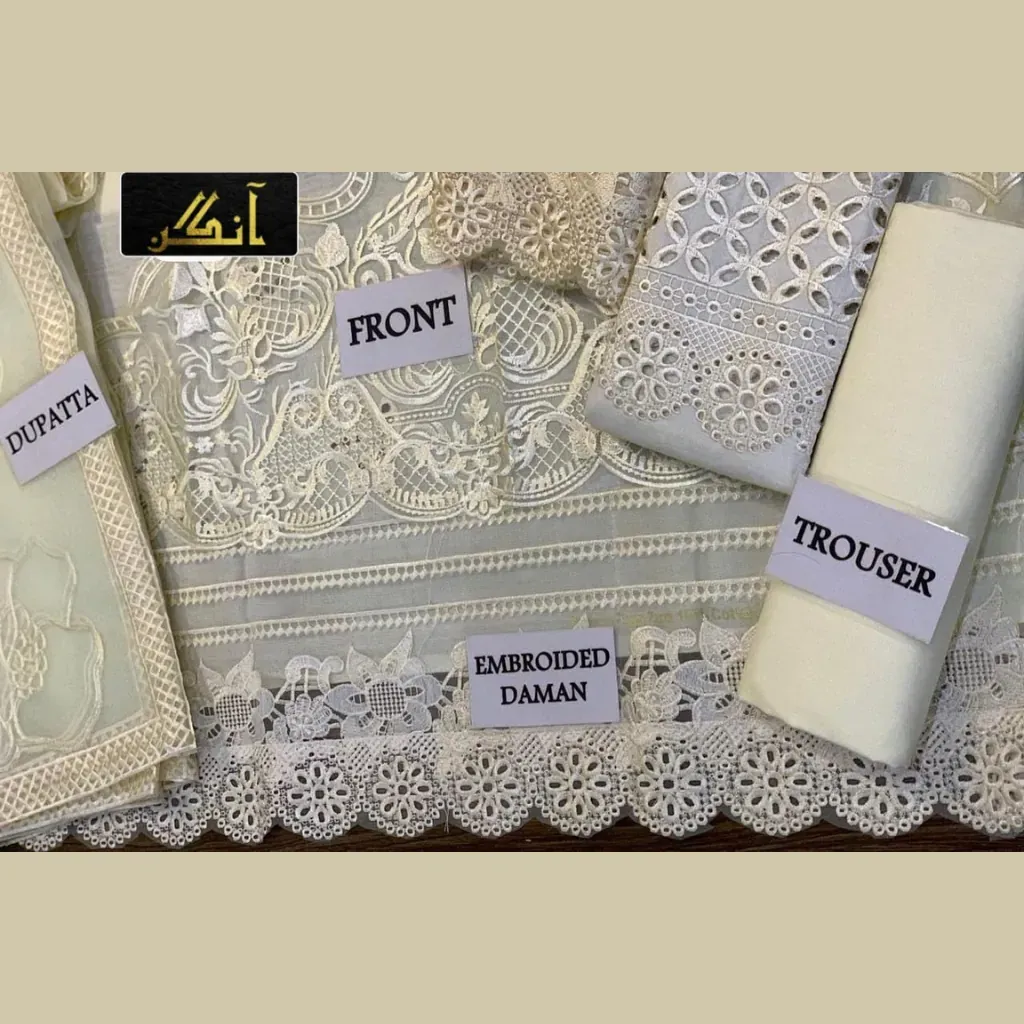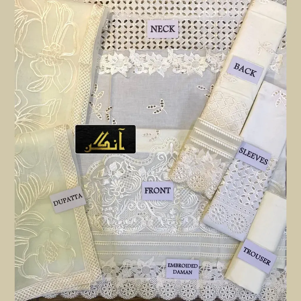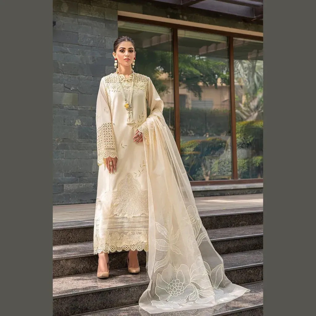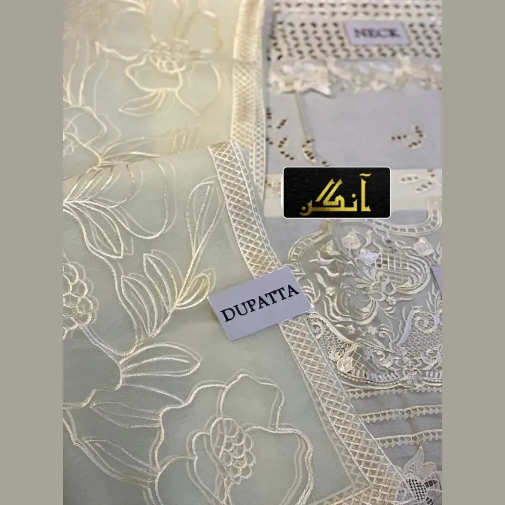 The highlight of this ensemble is the ready-to-wear organza embroidered dupatta, giving a perfect luxury finish to the attire. Paired with a dyed cotton trouser, it strikes the perfect balance of comfort and elegance, making it a wardrobe essential for women who appreciate timeless fashion.