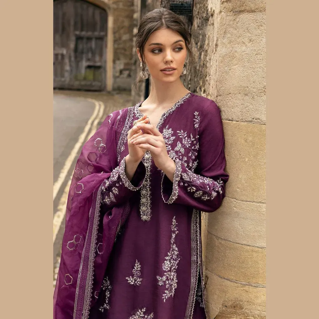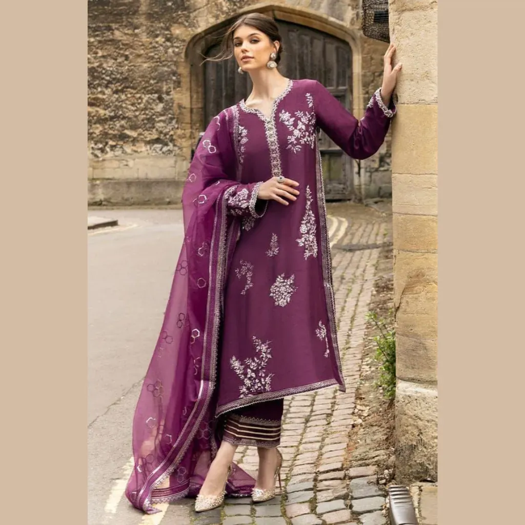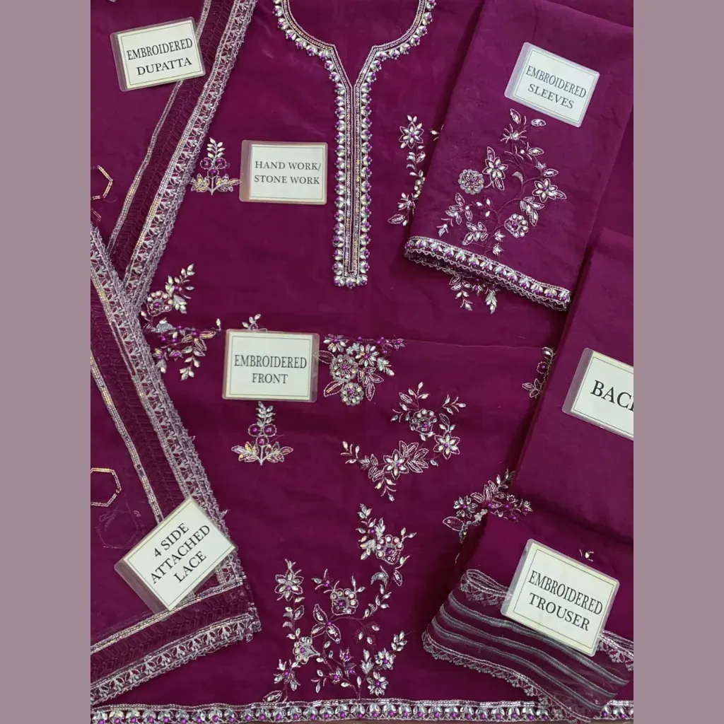 Elevate your style with the Mushq Organza Embroidered Hand-Embellished Luxury 3PC Unstitched Suit. Featuring exquisite hand-embellished stonework on the front and neck, this elegant organza outfit boasts delicate embroidery on the sleeves and a plain dyed organza back for subtle contrast. The malai trouser with embroidered patch adds a touch of refinement, while the ready-to-wear organza dupatta adorned with embroidered sequences completes this luxurious ensemble. Perfect for formal occasions and festive celebrations, this unstitched set offers timeless elegance and customizable comfort.