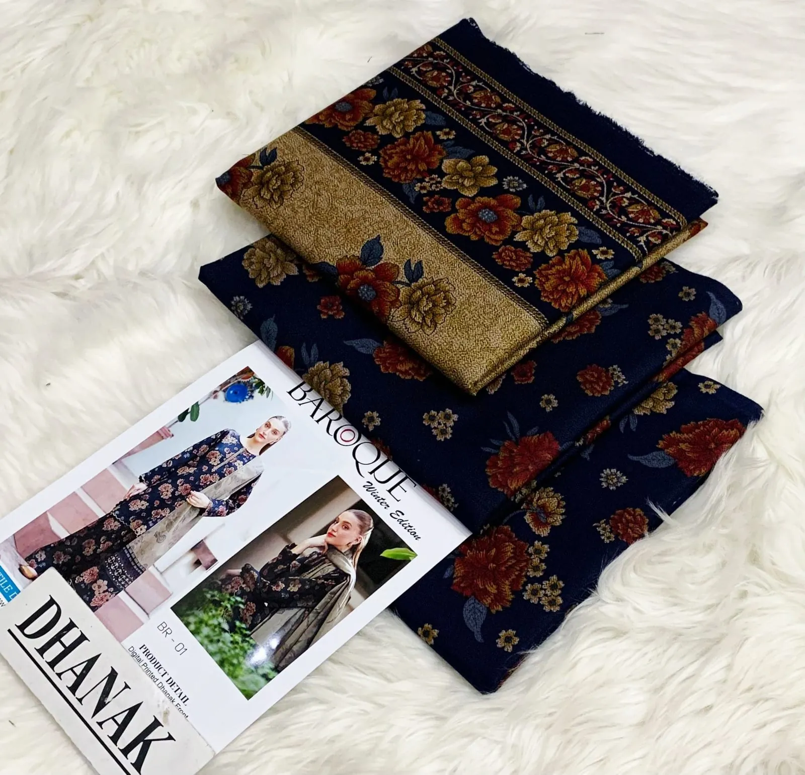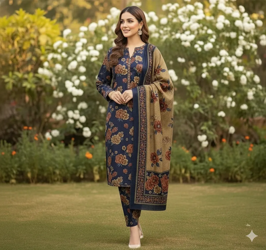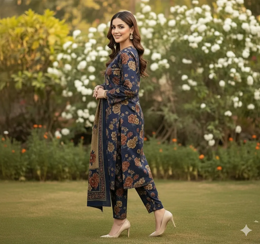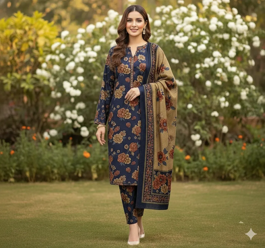 Navy Blue Allover Floral Print Dhank 3 Piece Suit with Coordinated Shawl | Unstitched Winter Collection 2025. Introducing a standout piece from our Winter Collection 2025, this 3-piece navy blue suit is the epitome of grace and contemporary style. Crafted from high-quality Dhank fabric, it provides exceptional warmth and a comfortable drape, making it ideal for the cool weather in Faisalabad and beyond.