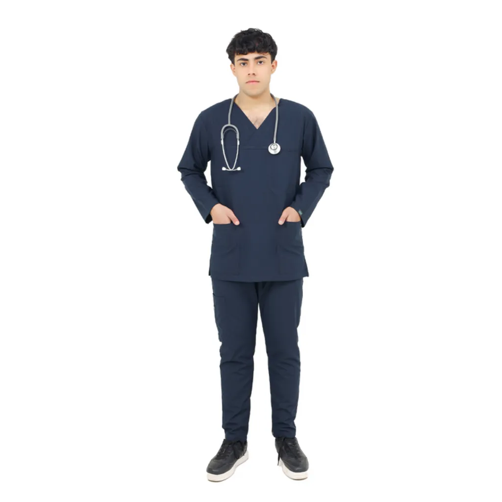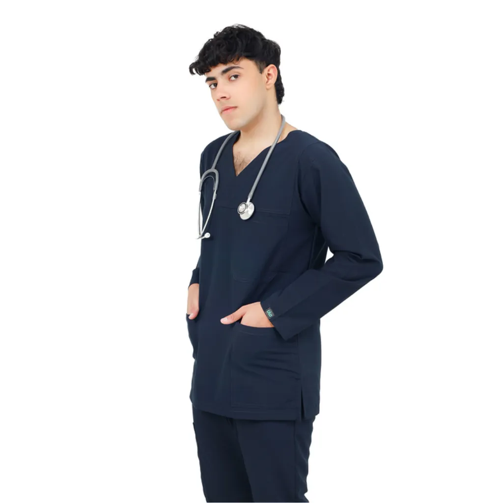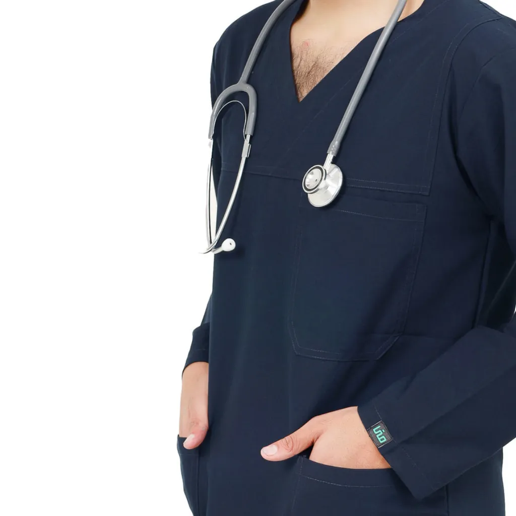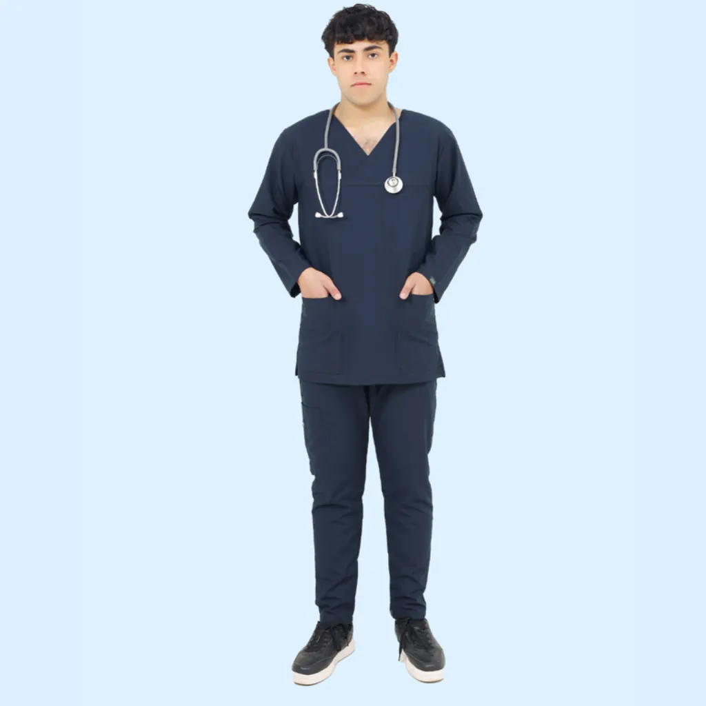 Presenting the Navy Blue Full Sleeves Scrub Suit for Men, thoughtfully designed for modern healthcare professionals who seek comfort, utility, and a sharp professional appearance. With a clean V-neckline, a handy chest pocket, and two deep front pockets, this scrub suit offers everything you need to move confidently through your day.