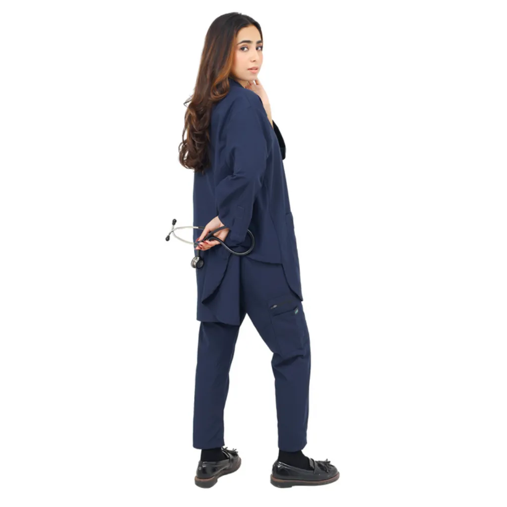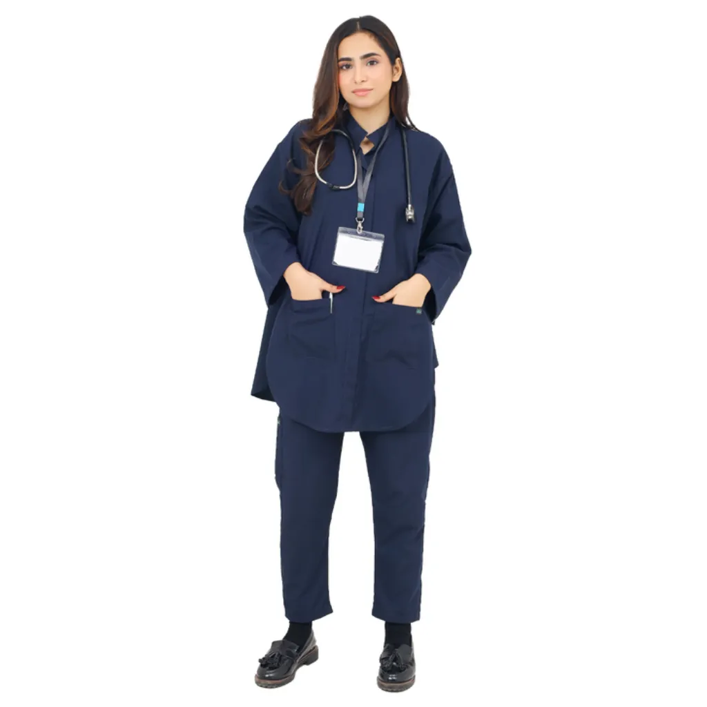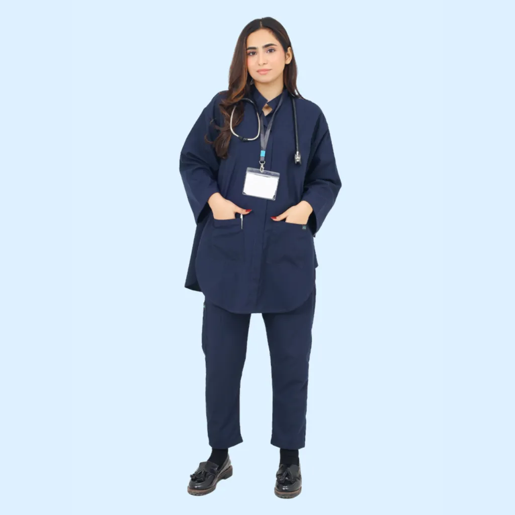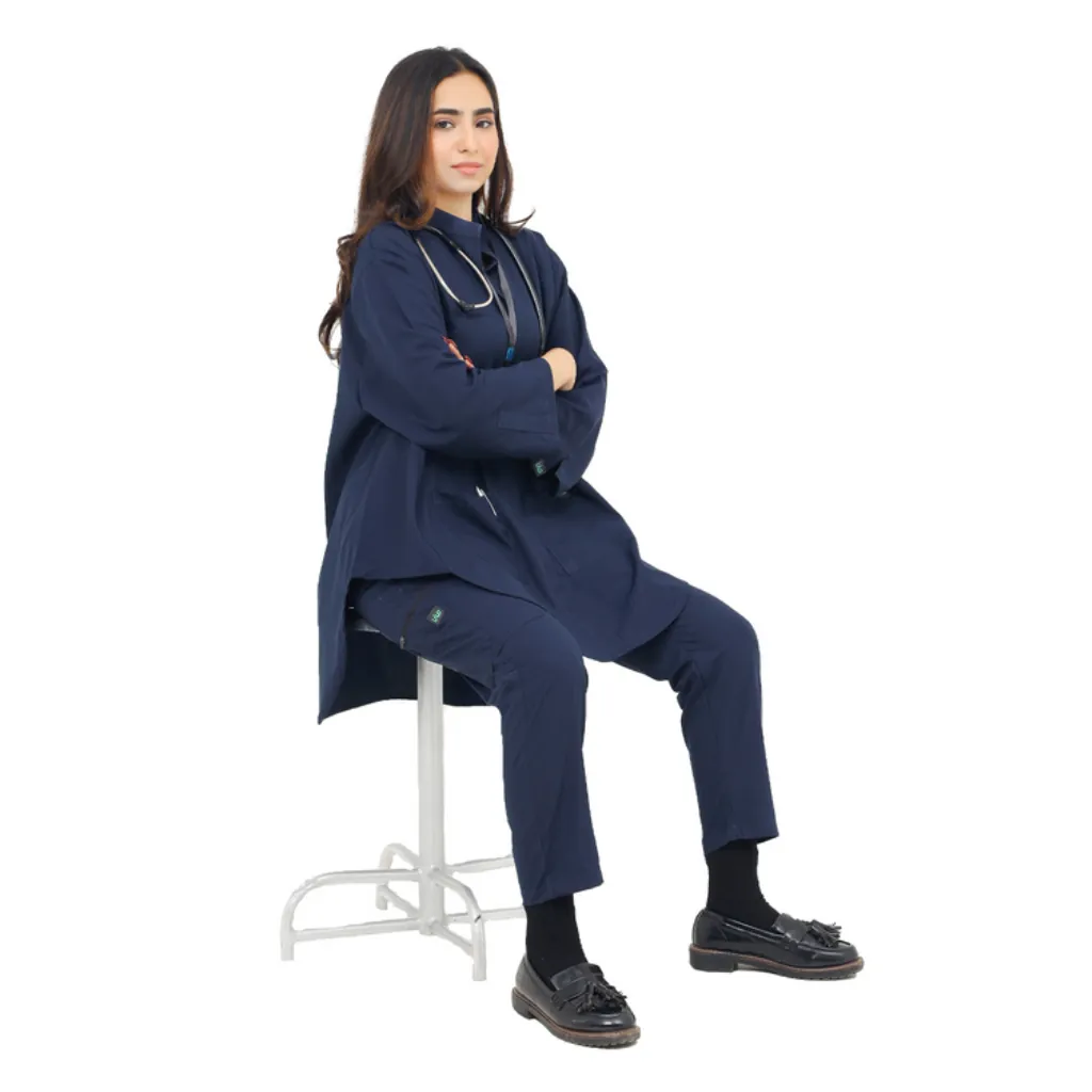 Presenting the Navy Blue Frock Style Scrub Suit for Women, a perfect blend of functionality, modesty, and modern professional wear. This full sleeves scrub suit is thoughtfully tailored for female healthcare workers who prioritize comfort without compromising on appearance.