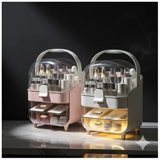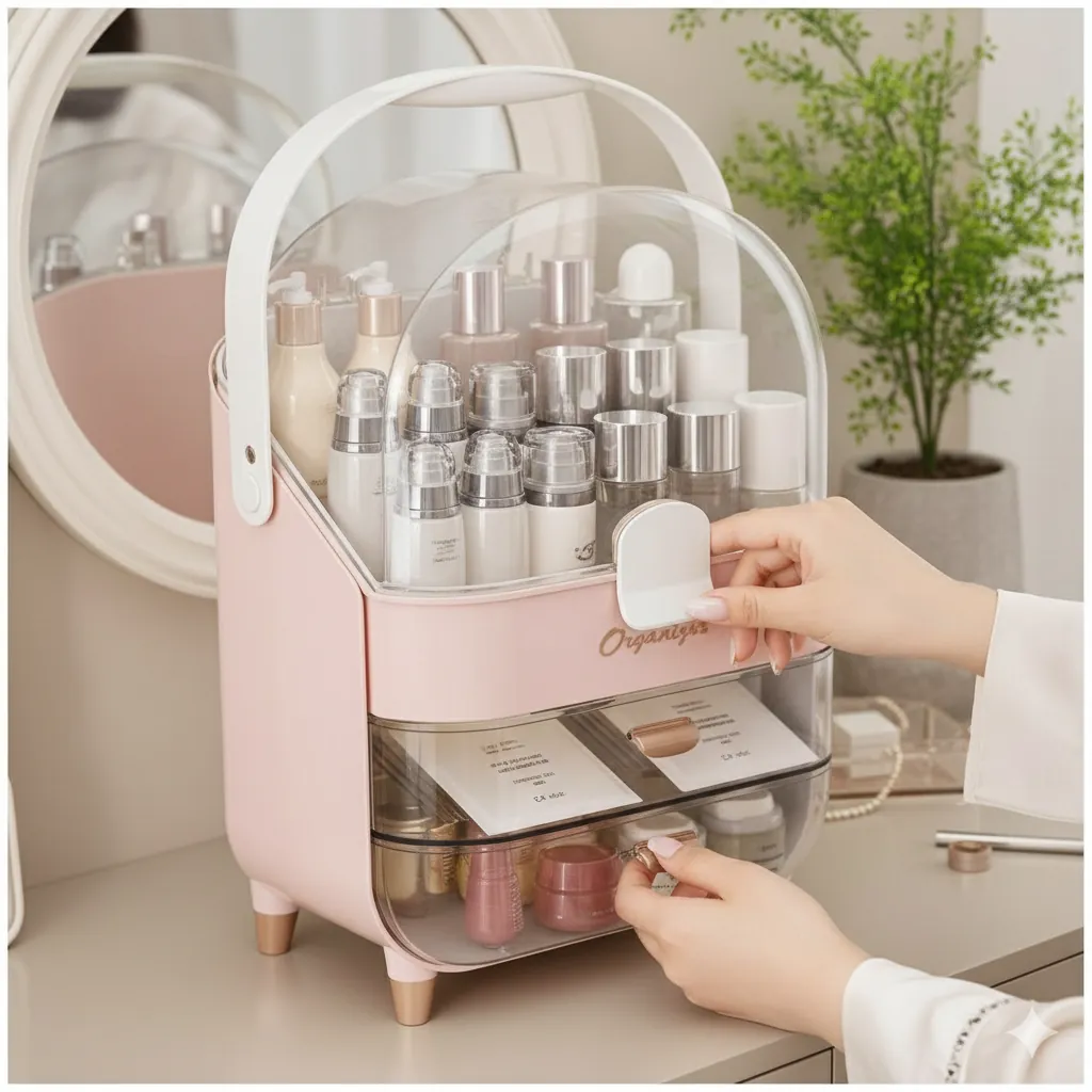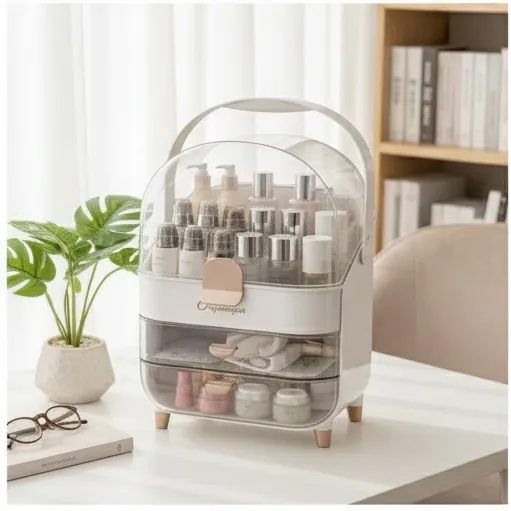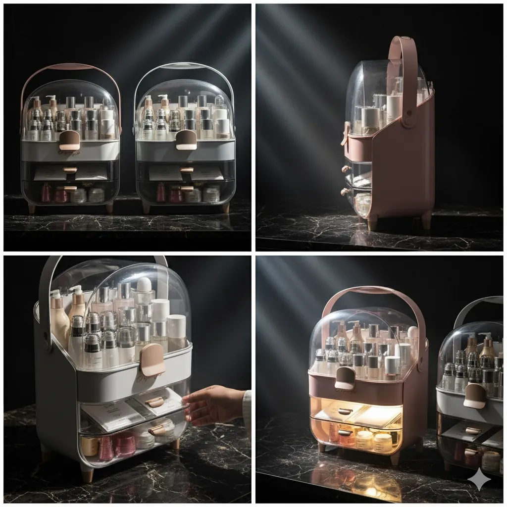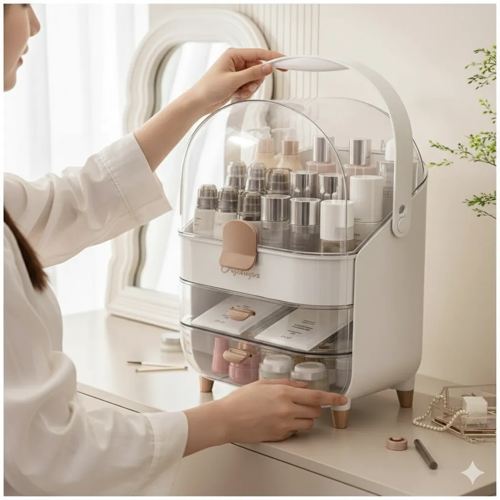 Crafted with a modern design and smooth finish, it features multiple compartments to neatly store your makeup, skincare products, brushes, jewelry, and accessories.