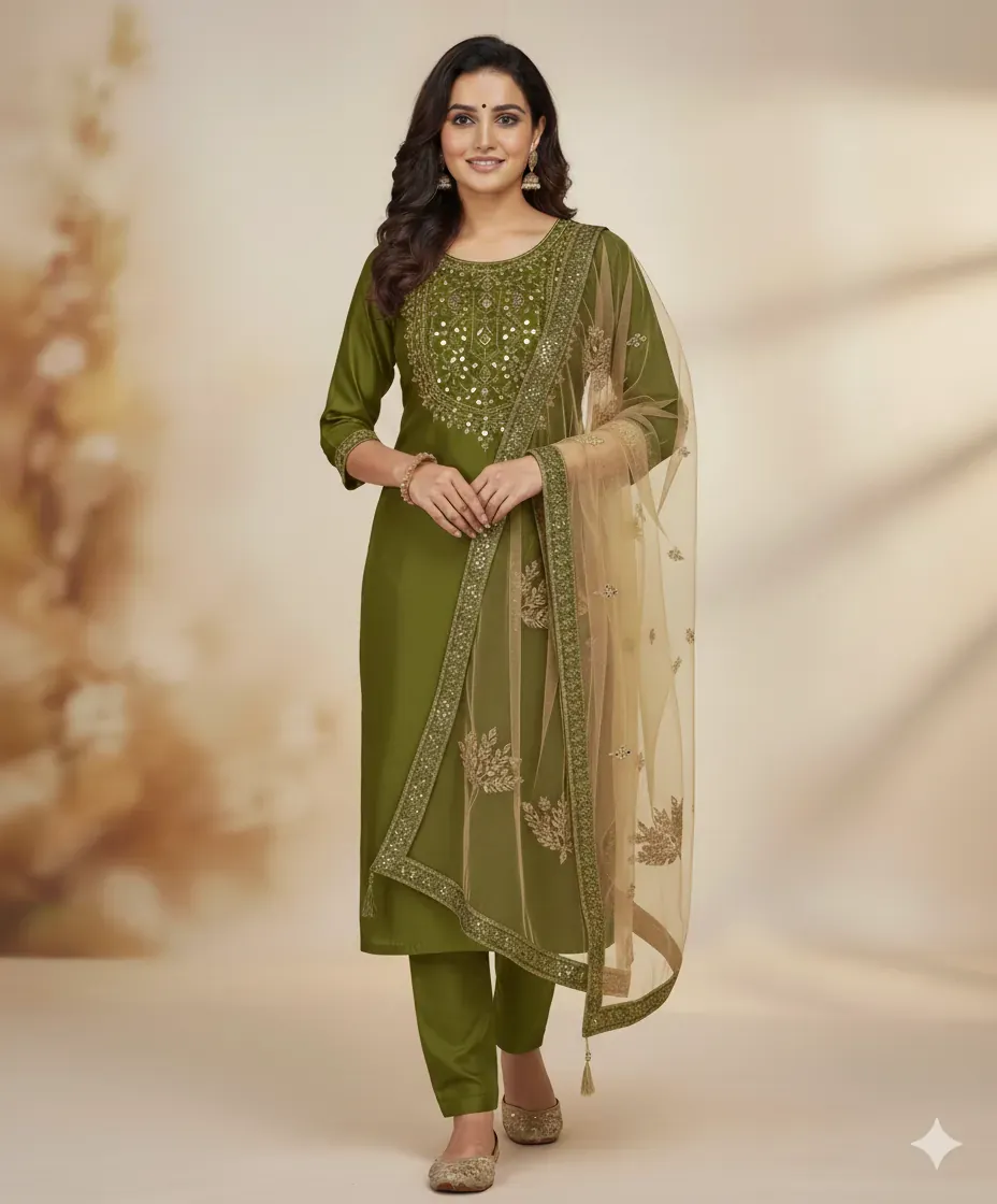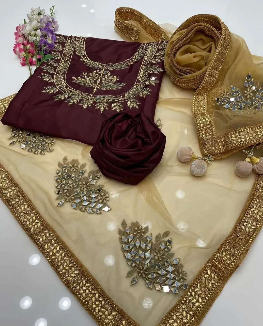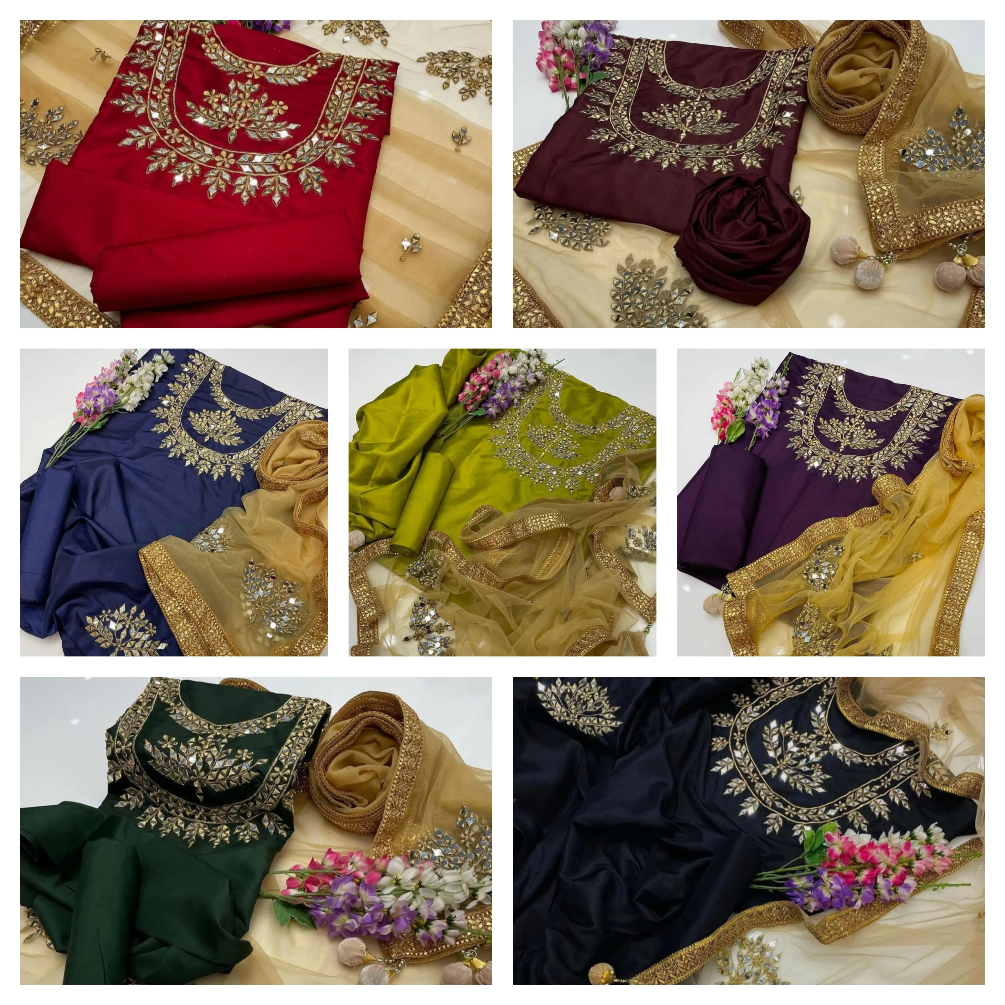 Introducing the trending 2K25 Heavy Mirror Collection – a true masterpiece for those who desire unmatched luxury and traditional craftsmanship. This premium ensemble features a fully embroidered shirt with original heavy mirror work, silver tilla, and gottah detailing crafted on rich imported Katan silk fabric.