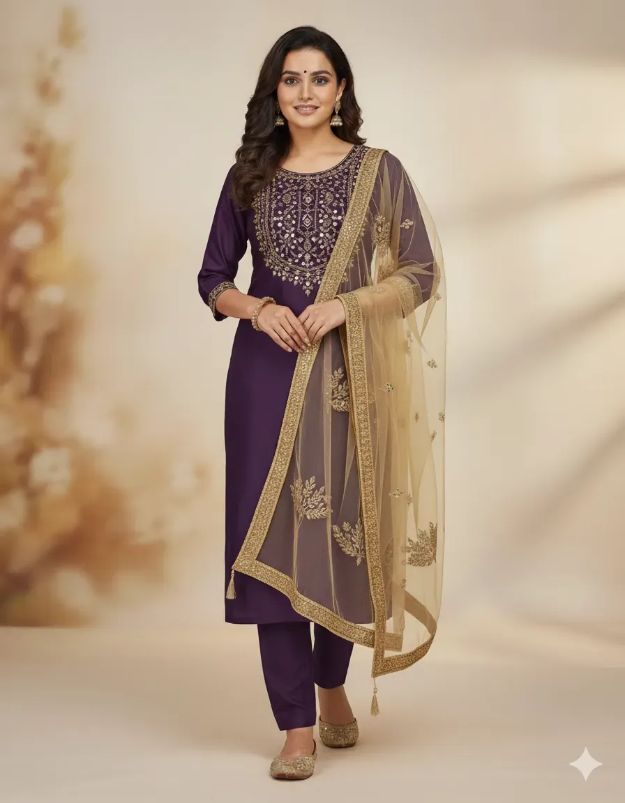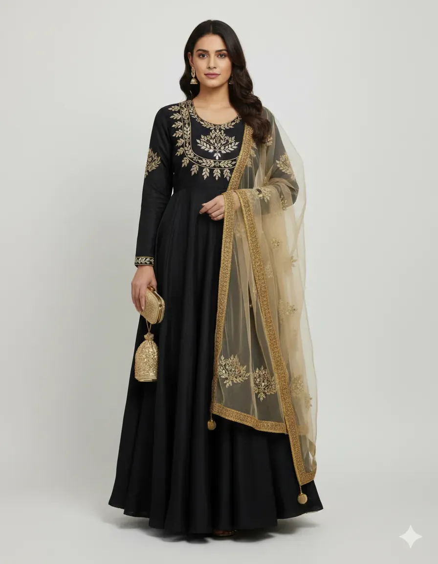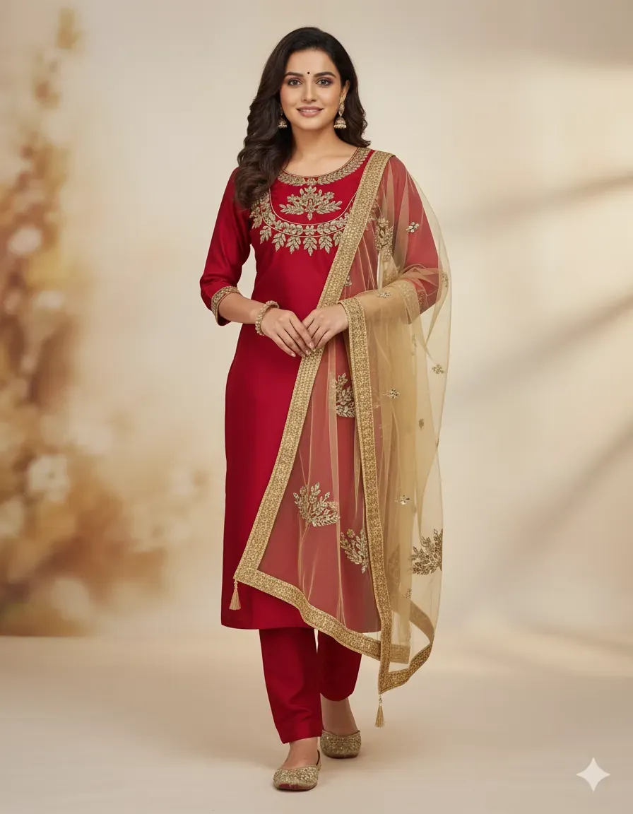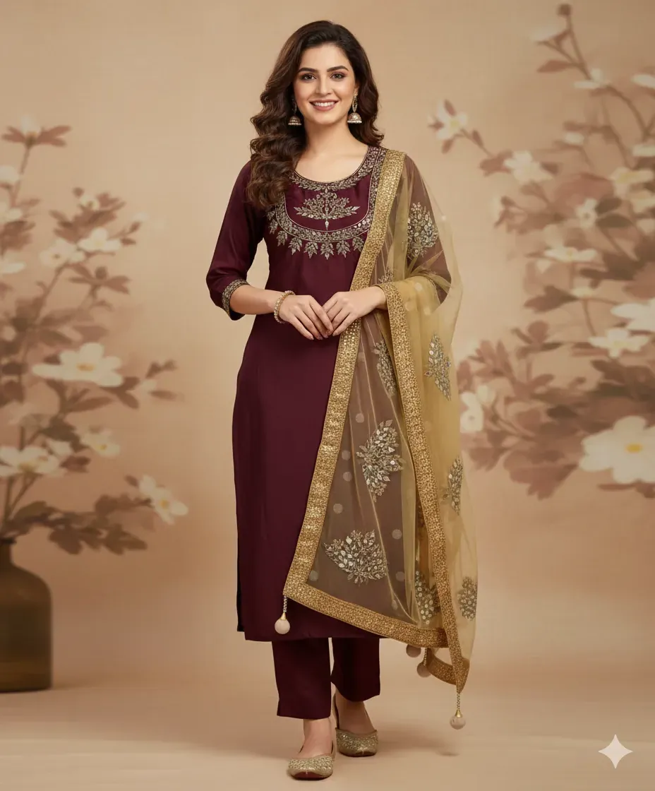 The ensemble is elevated by a breathtaking net Indian Banarsi dupatta, adorned with all-over embroidery, mirror accents, and finished with four-sided heavy fancy lace, making it the highlight of any festive occasion. Paired with a matching imported Katan silk trouser, this outfit blends tradition, class, and contemporary style.