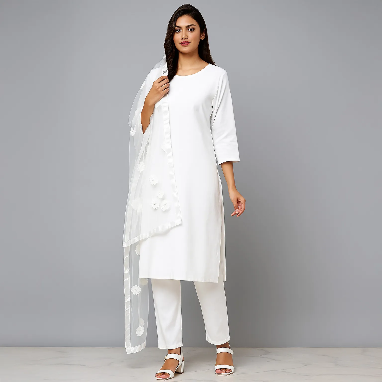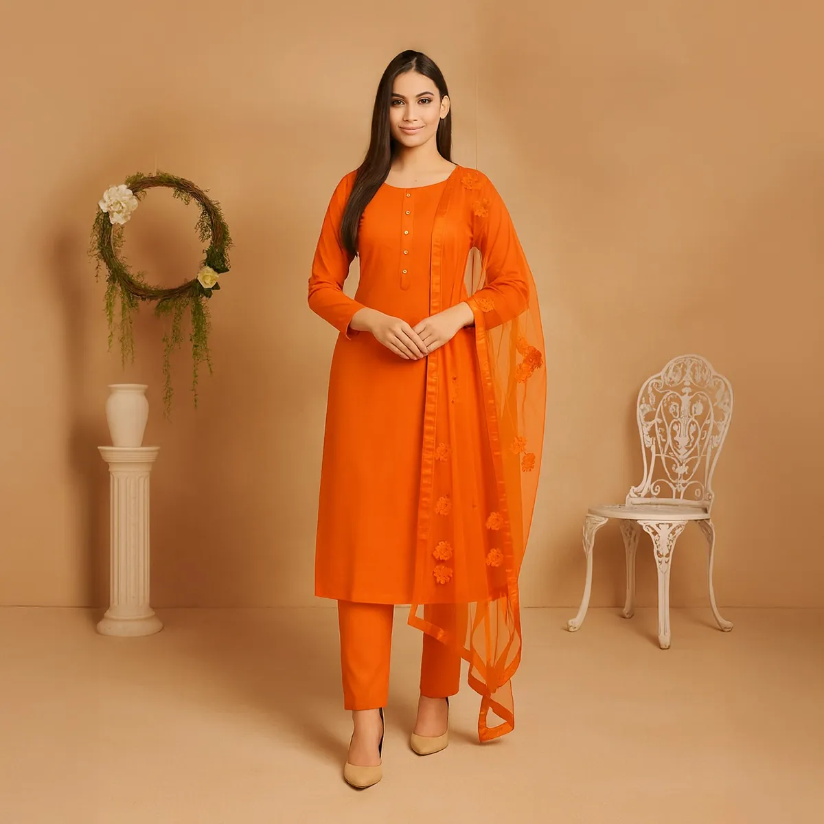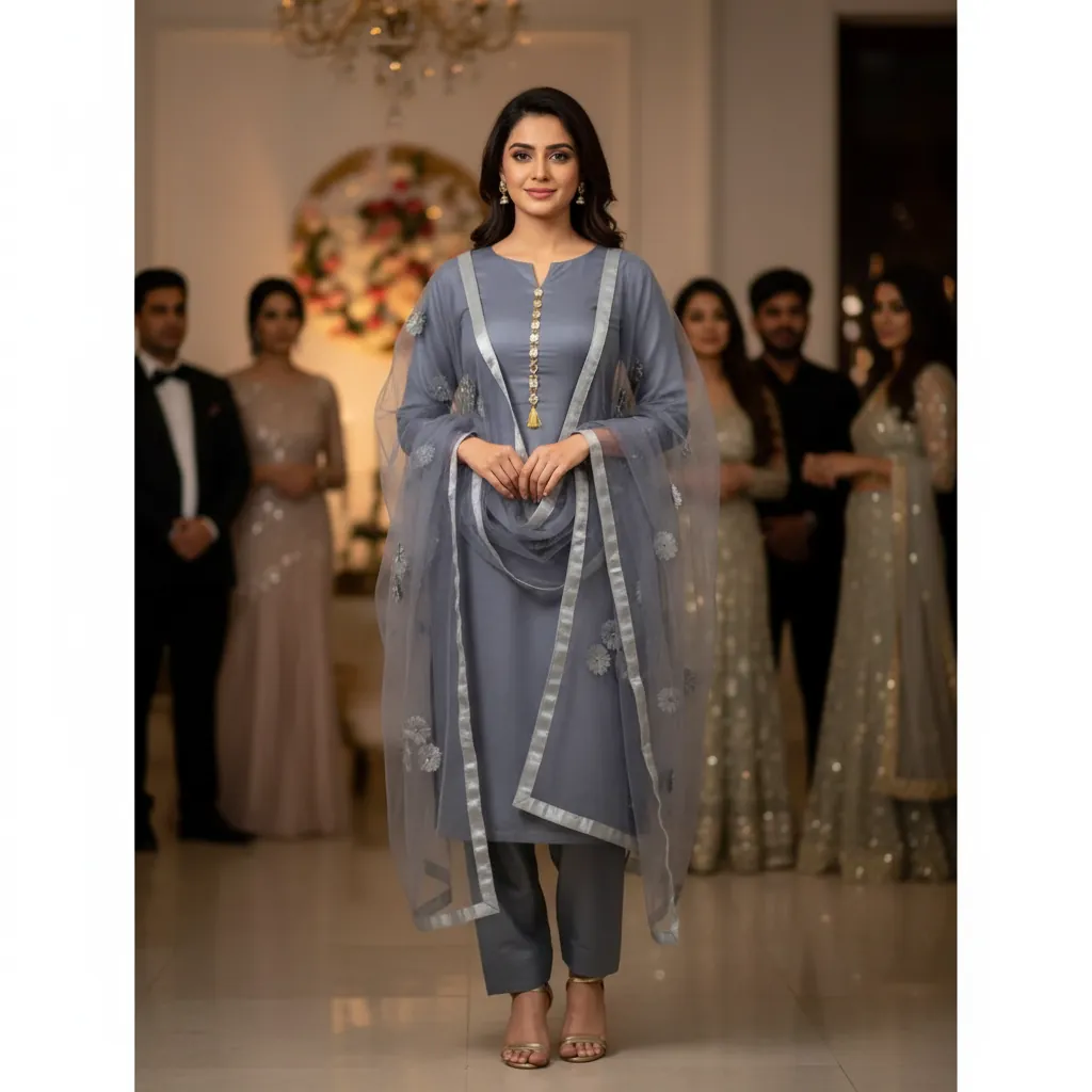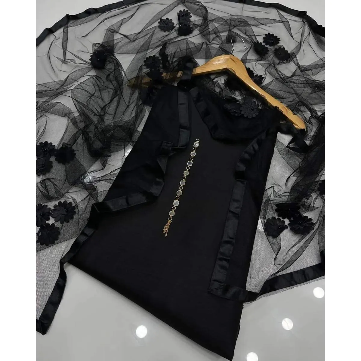 The highlight of this set is the Net Jamawar Dupatta, adorned with 3D floral embellishments, offering a stunning and luxurious finish — and it’s ready to wear, saving you stitching hassle while keeping your look effortlessly chic.