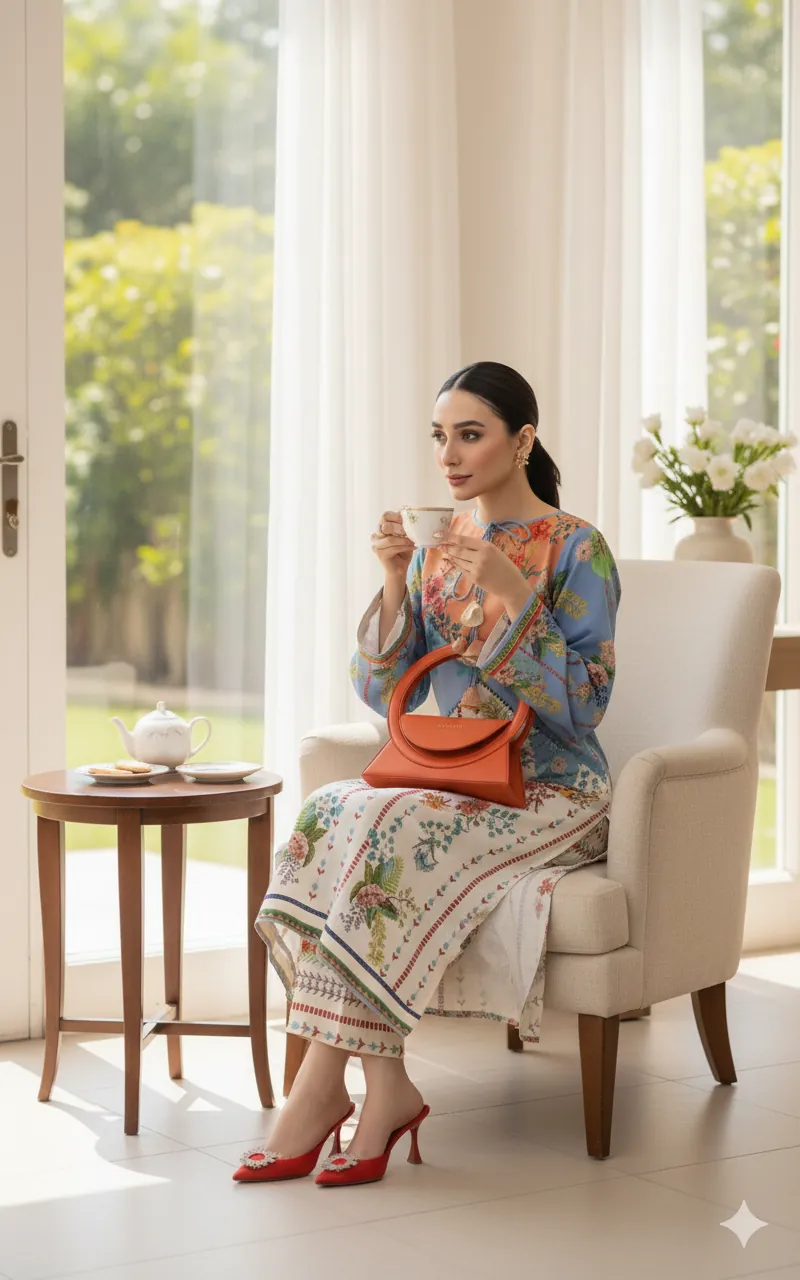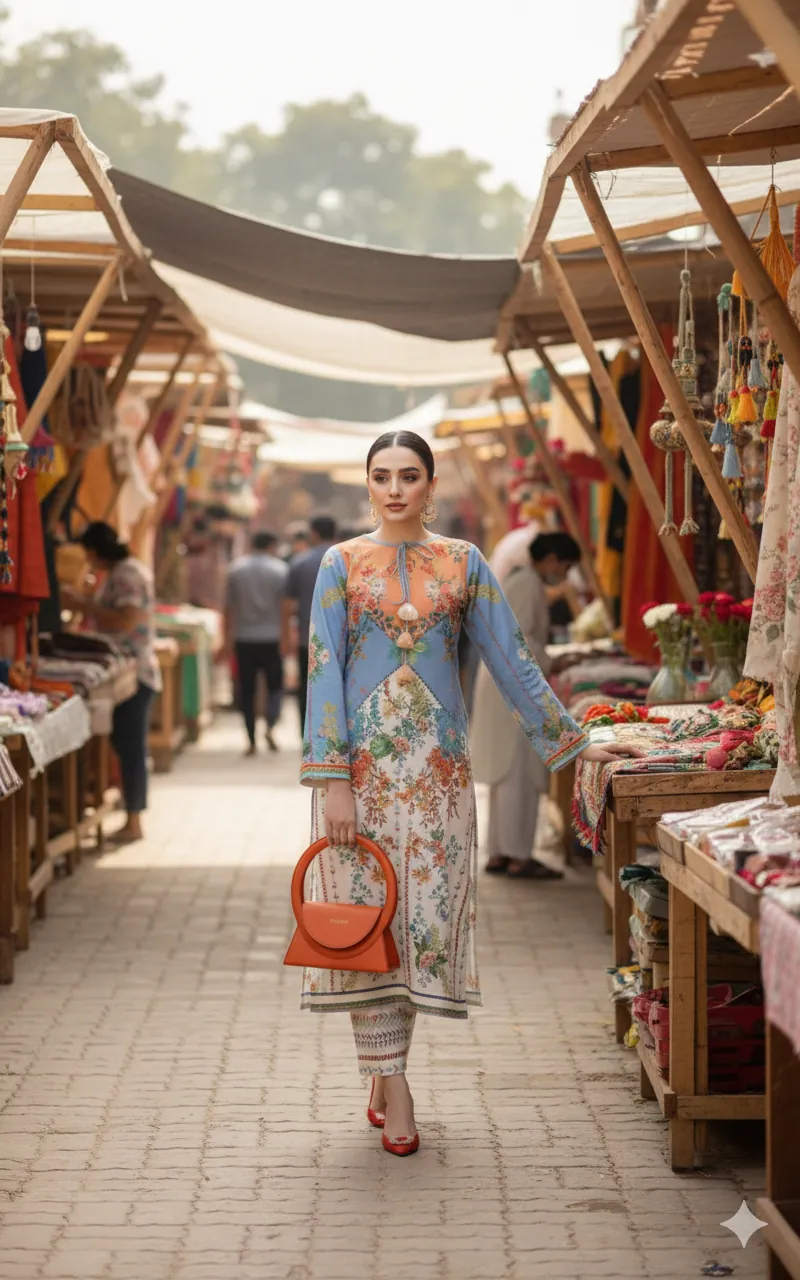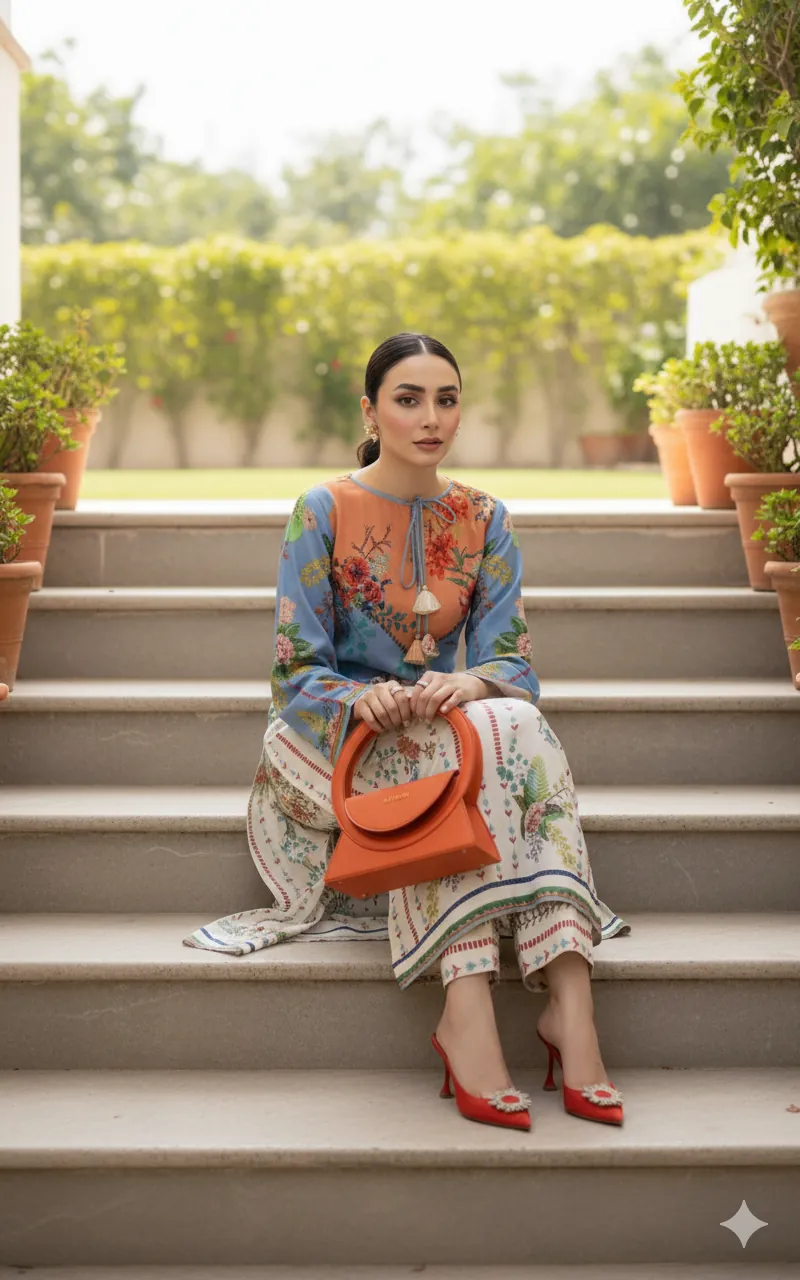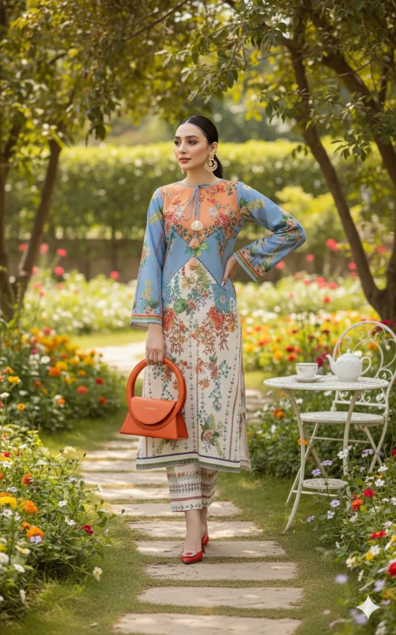 New Summer Collection Premium Grip Stitched 2-Piece Suit - Vibrant Floral Printed Tunic Shirt & Wide Trousers.Introducing the latest addition to our summer collection—a truly vibrant and stylish 2-piece stitched suit! This outfit is designed to make you feel beautiful and comfortable all season long.This unique ensemble is completely stitched and ready to wear right away, saving you the hassle of tailoring. It is made from high-quality premium grip fabric, which is known for its smooth texture, excellent drape, and ability to hold vibrant colors, making it perfect for daily wear or special gatherings.The design is a lively mix of prints. The top half of the shirt features a bold, bright multi-color floral design set against a cool blue and fiery orange block. This transitions beautifully to a softer, lighter print on the lower half of the shirt and the matching trousers. The long shirt (tunic) has an eye-catching tie-up neckline and long sleeves finished with neat borders, giving it a complete and chic look.