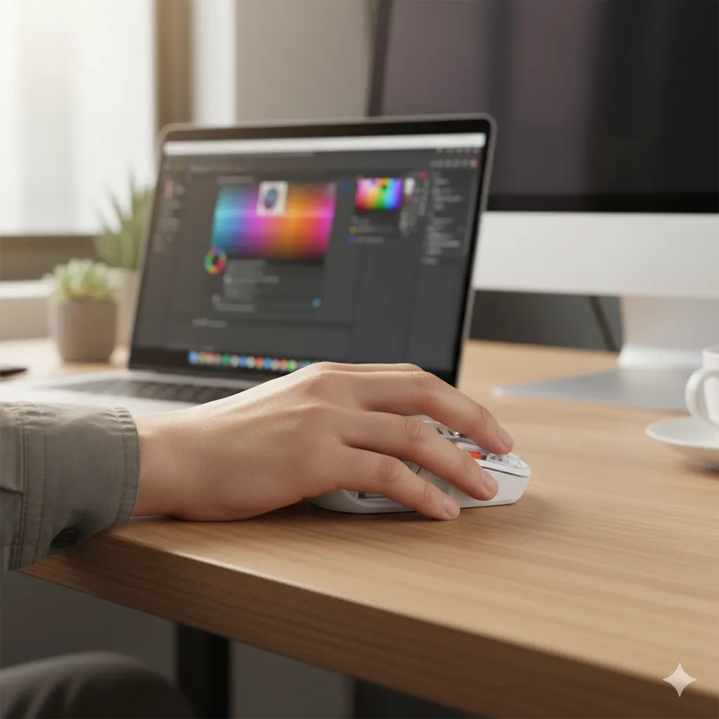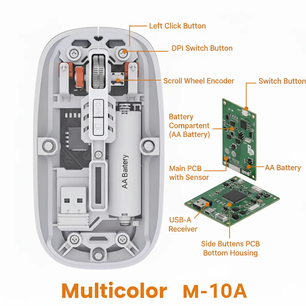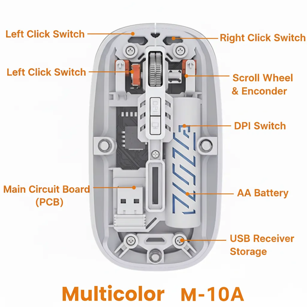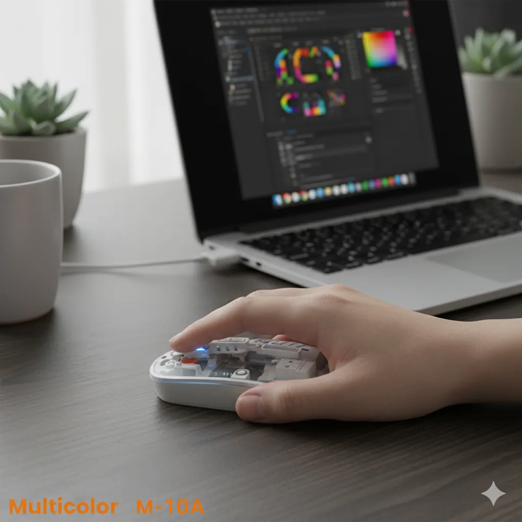 Introducing the NEW M-10A Transparent Wireless Mouse, the perfect blend of cutting-edge technology and unique aesthetics. Its fully transparent appearance sets it apart, giving your desk a modern, tech-forward look, while its high performance ensures smooth sailing for all your office and gaming needs. Seamless Triple-Device Multitasking: Equipped with 2.4G wireless and dual Bluetooth (BT1+BT2) connectivity, this mouse allows you to pair with up to three different computers, mobile devices, or tablets simultaneously. Effortlessly switch between devices using the mode switch at the bottom—a true game-changer for enhanced productivity. Convenient Power and Features: Say goodbye to disposable batteries! The M-10A has a built-in 400mAh rechargeable lithium battery and charges quickly via the included Type-C cable. Features like the battery display light and energy-saving mode help manage power efficiently. Plus, the unique "One-Click Desktop" button allows you to quickly hide your work and return to your main screen.