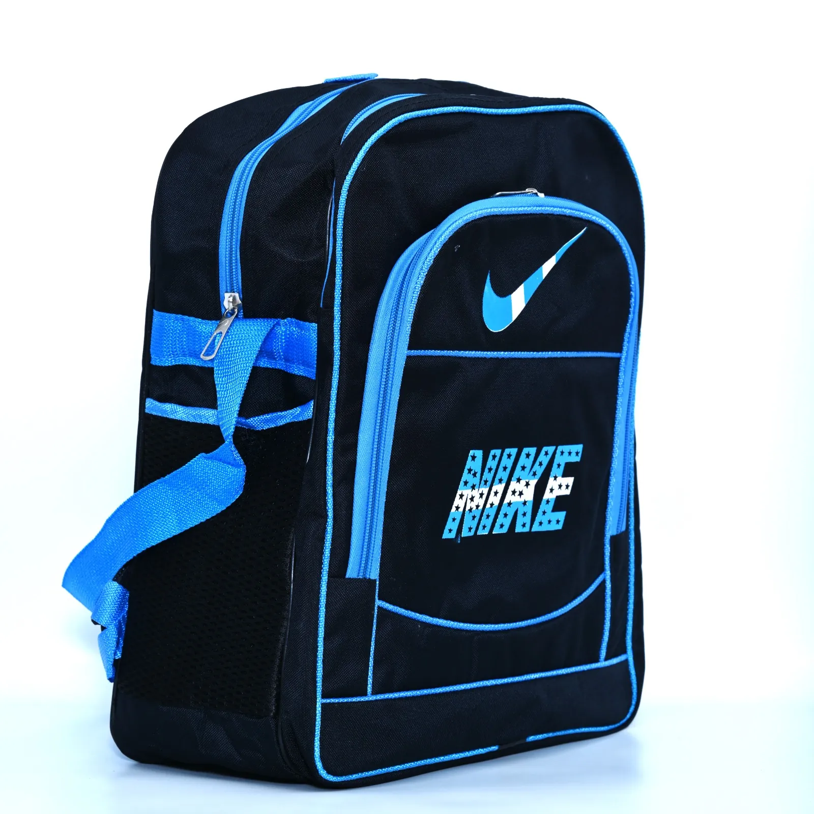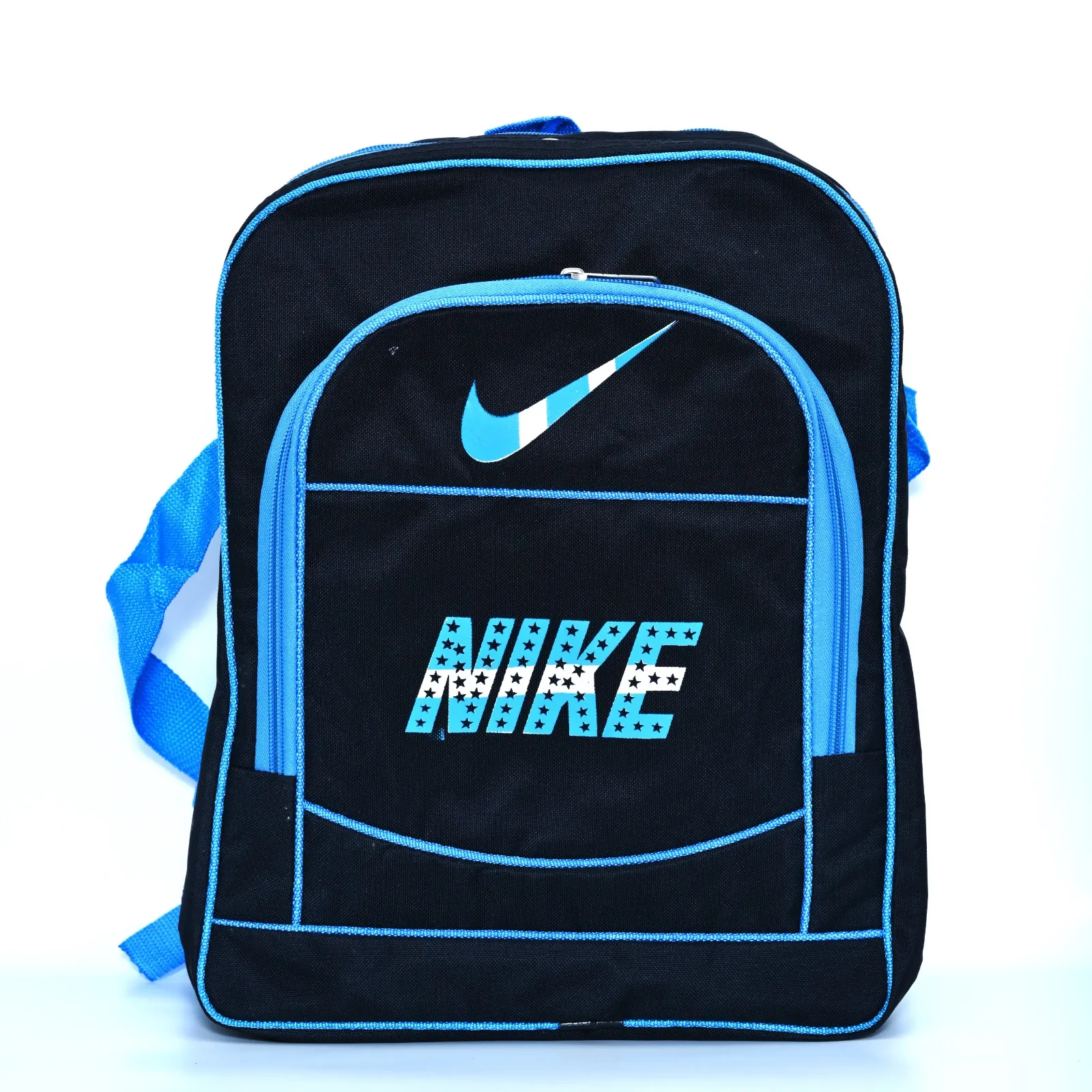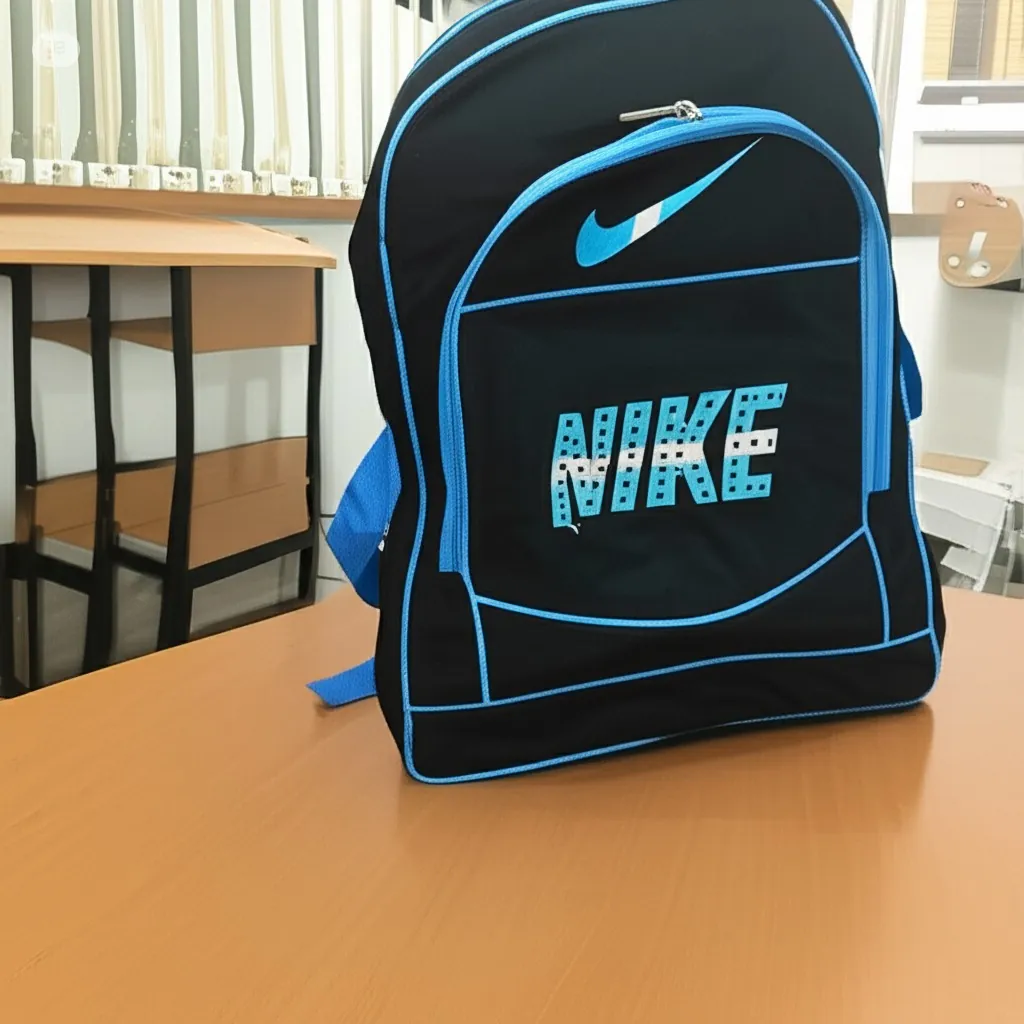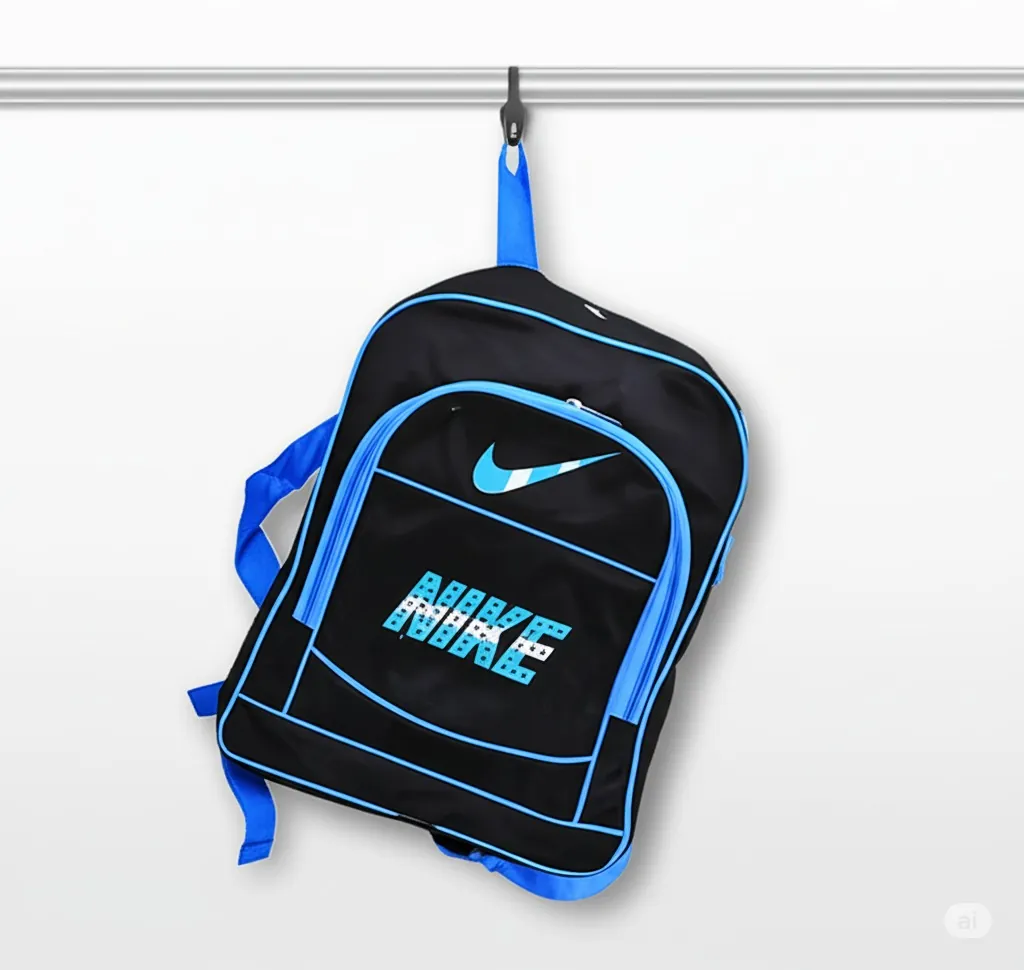 Carry your essentials in style with this distinctive black Nike backpack. Accented with bold blue details, including the iconic swoosh and "NIKE" lettering, this backpack offers both functionality and a sporty aesthetic. Its durable construction ensures long-lasting use, while the spacious main compartment and additional pockets provide ample storage for books, gear, and personal items. Comfortable shoulder straps make it perfect for students, athletes, and anyone on the go. Show your Nike pride with this versatile and reliable backpack.
