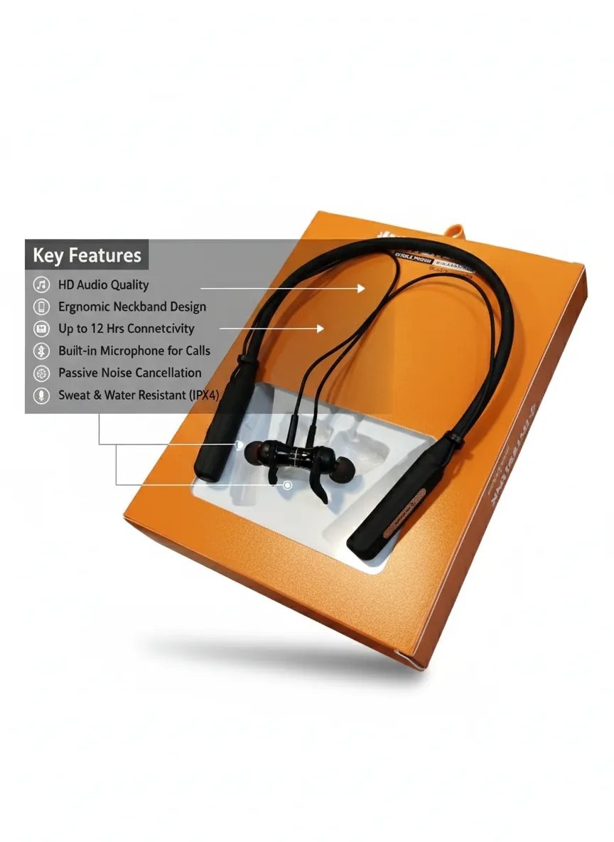 Noise Cancellation Neckband Earphones with Mic - 25 H Non-Stop Playtime.Cut the noise and immerse yourself in your favorite music with our premium neckband earphones. Designed for all-day comfort, the lightweight and flexible neckband sits securely around your neck, so you can enjoy your audio without any distractions.