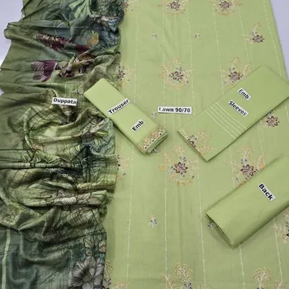 Embrace the essence of summer grace with this stunning 3-piece unstitched suit from our latest Summer Collection 2025. Meticulously designed for elegance and comfort, this ensemble is crafted from premium Lawn 90/70, a fabric renowned for its fine weave, lightweight feel, and superior breathability. The suit features a soothing pistachio green canvas, brought to life with delicate embroidery and a beautifully coordinated printed dupatta, making it a must-have for your seasonal wardrobe. This complete package provides everything you need to create a sophisticated and stylish outfit. The shirt front is adorned with intricate floral embroidery in subtle, contrasting shades, while a separate embroidered border is provided for the sleeves. The highlight of this ensemble is the artistic, digitally printed dupatta, which features an abstract blend of greens and purples, adding a contemporary flair to the classic design.