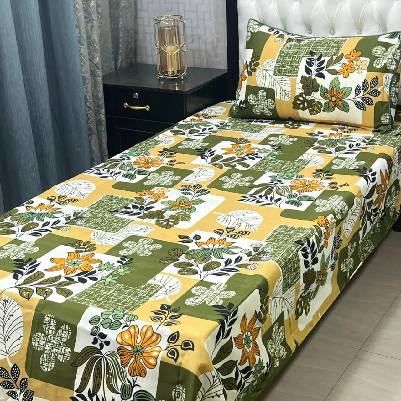 Elevate your bedding game with this 3D-Crystal Cotton Single Bedsheet Set, featuring a chic patch-style floral design in a unique blend of olive green, mustard yellow, and white. The modern nature-inspired pattern brings a calm, earthy vibe that perfectly suits minimalist or contemporary bedroom décor.