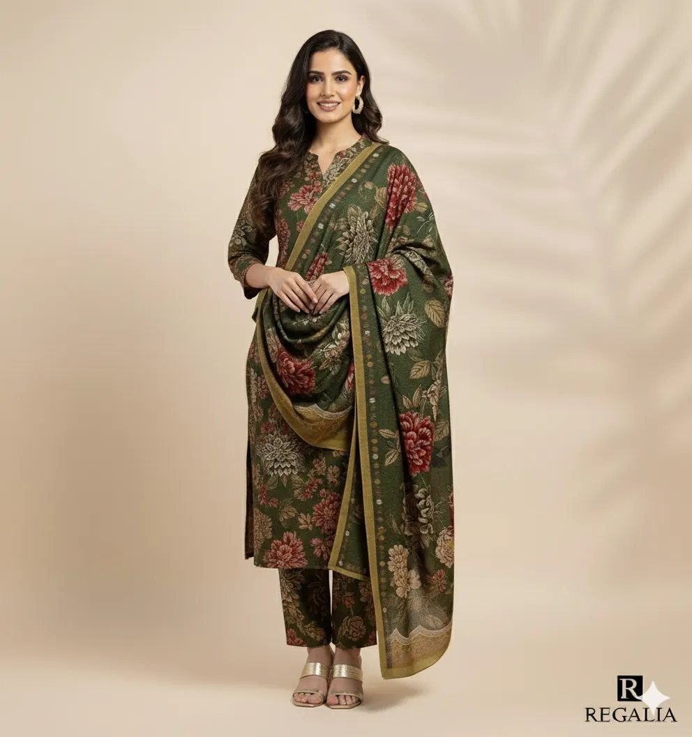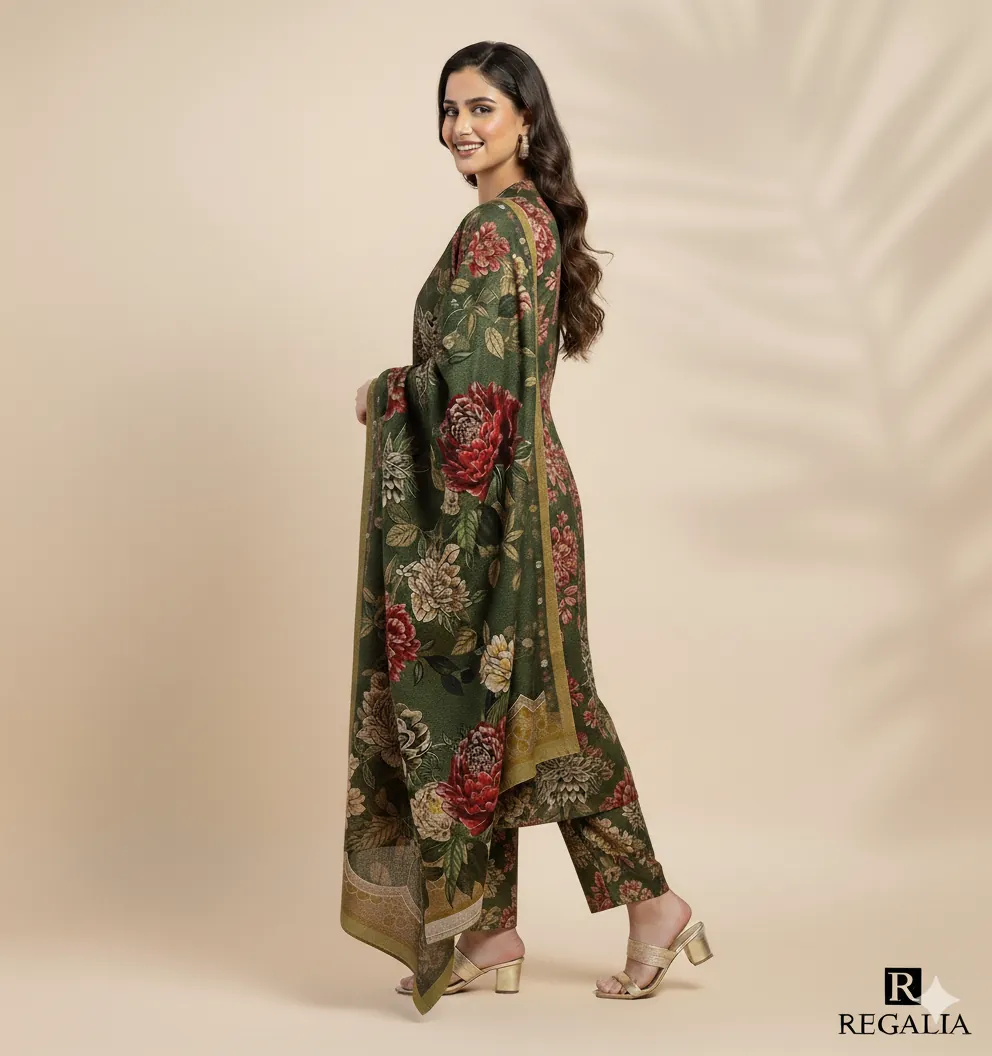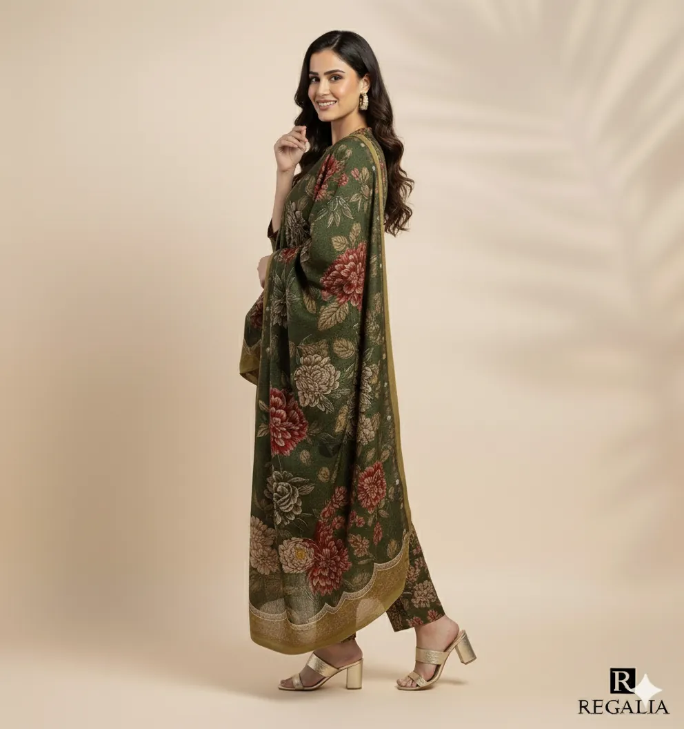 The base color is a sophisticated Olive Green, adorned with intricate digital prints of large floral motifs in contrasting Red, Cream, and Maroon. The shirt and trouser feature the same matching print for a contemporary, head-to-toe coordinated look. The expansive shawl drapes beautifully and is finished with an accent Mustard/Yellow border, adding a subtle pop of contrast. This suit is the ideal choice for semi-formal events, outdoor winter gatherings, and everyday elegance.