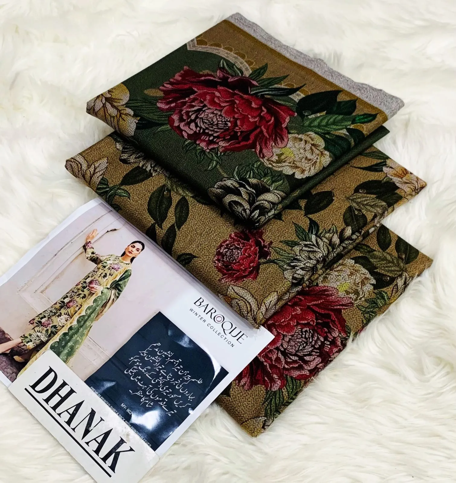 Olive Green & Red Floral Digital Print Dhanak 3-Piece Suit | Coordinated Winter Set. Rich Olive Green Digital Printed 3-Piece Suit featuring gorgeous red and cream florals. This coordinated Dhanak set is perfect for a warm, stylish winter look, complete with a beautifully bordered shawl.