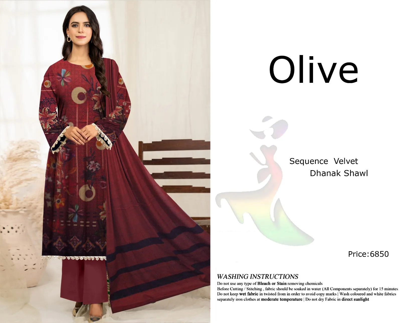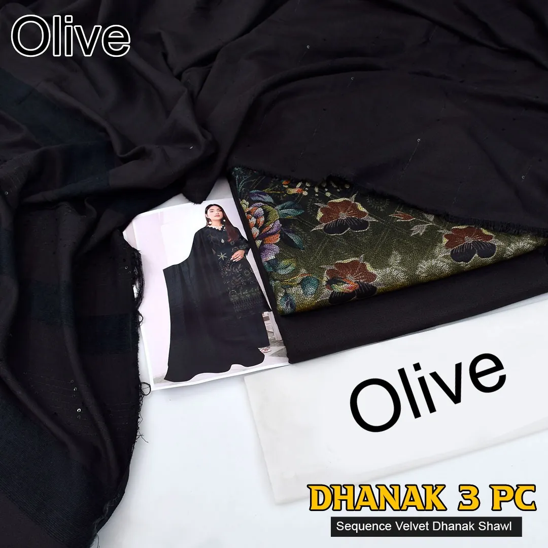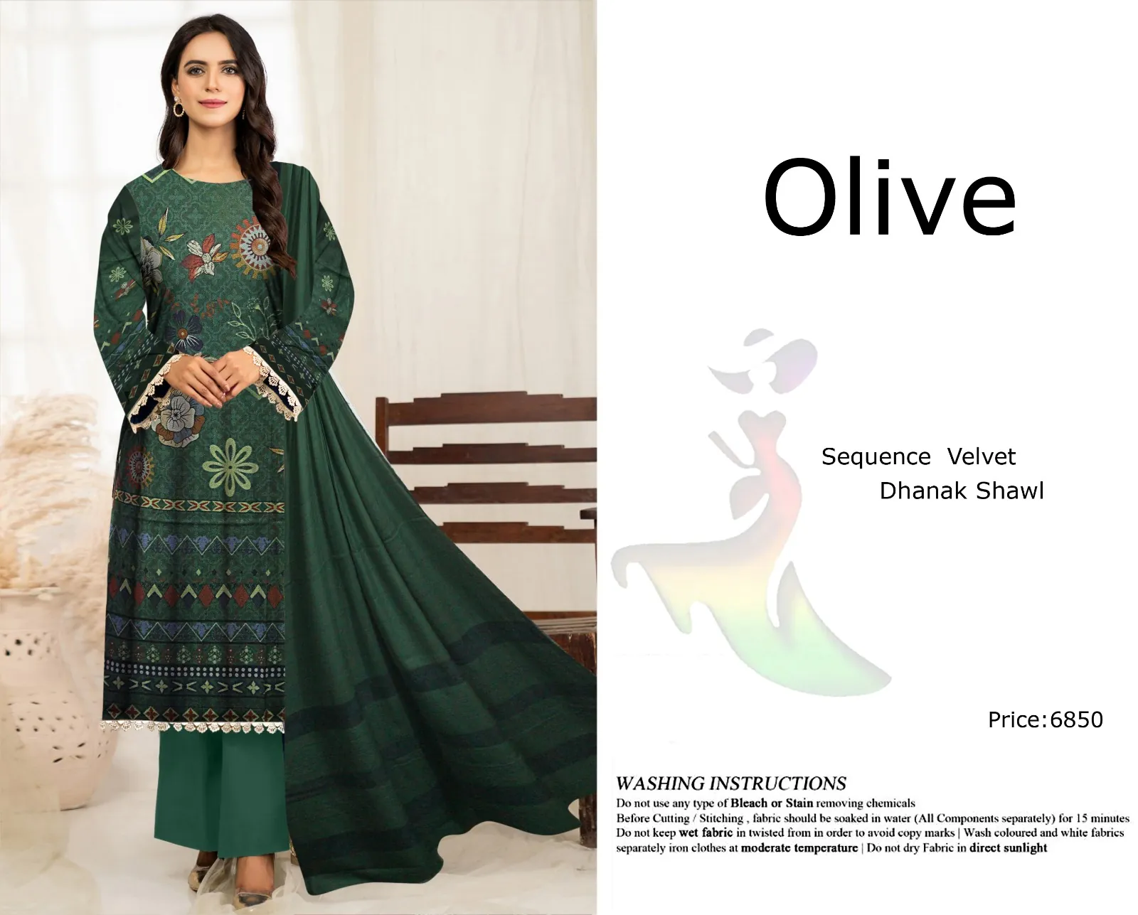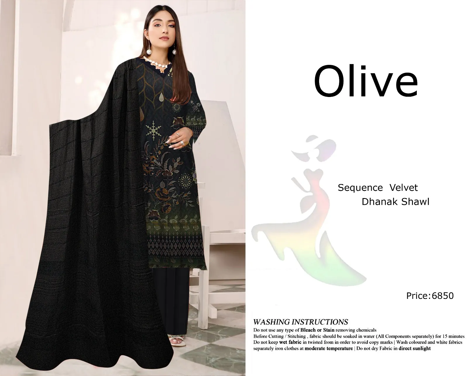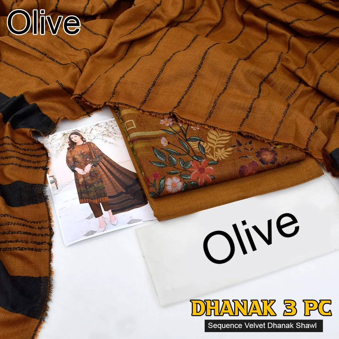 OLIVE Original Digital Printed Dhanak 3-Piece Suit with Velvet & Sequence Shawl