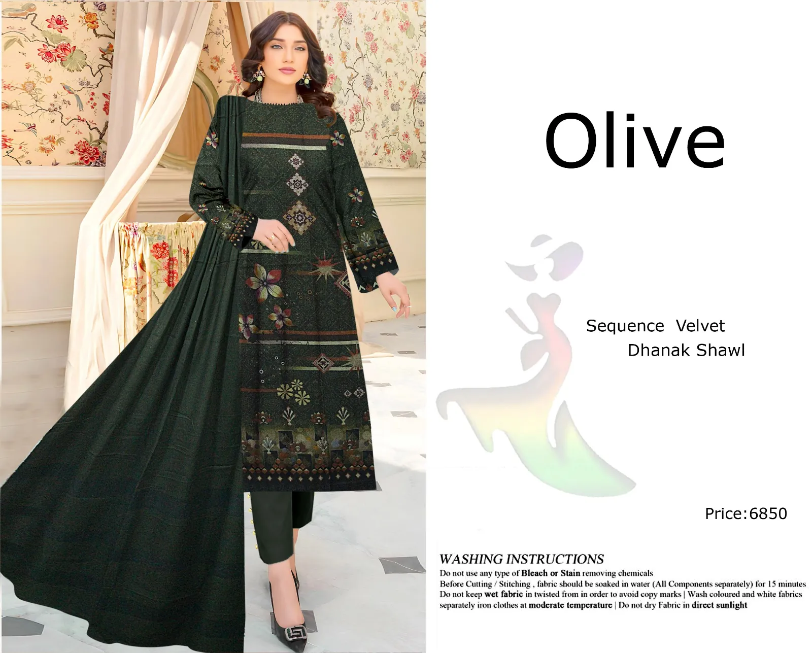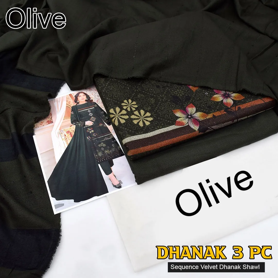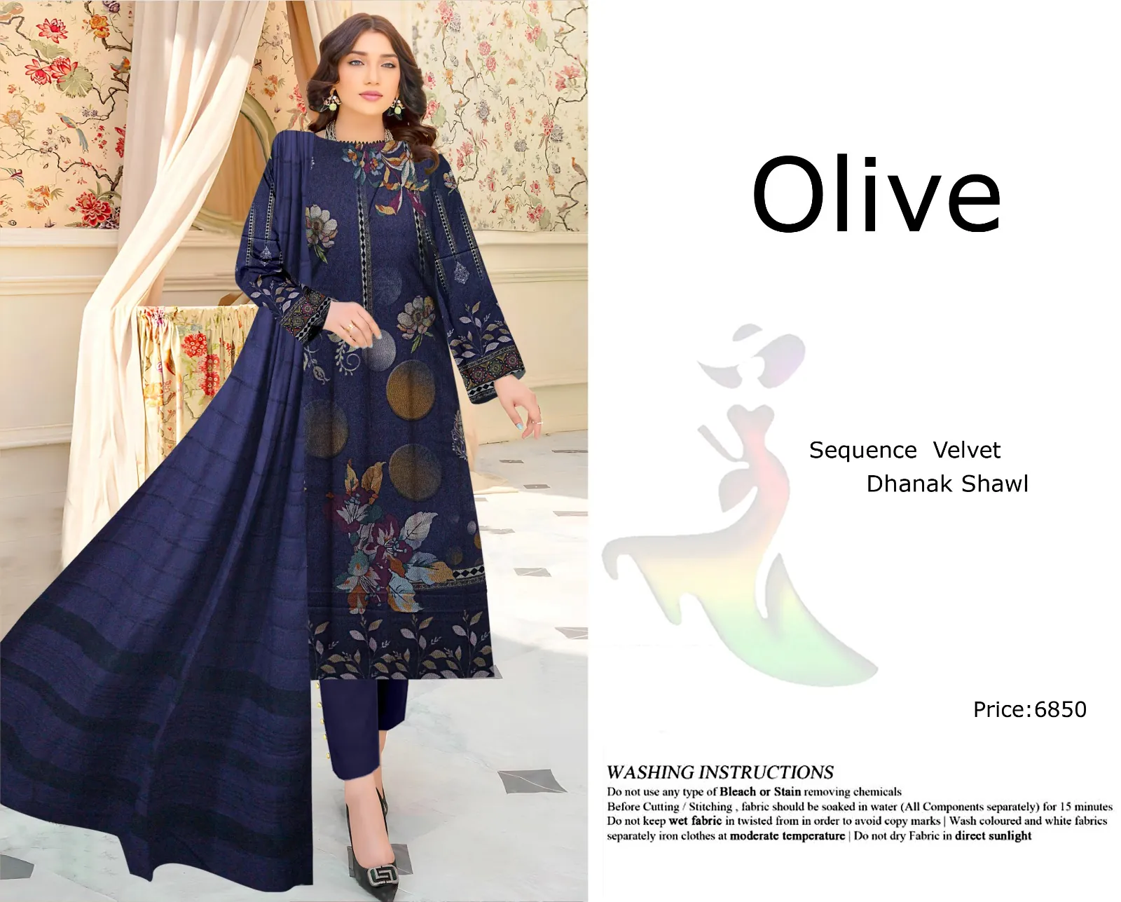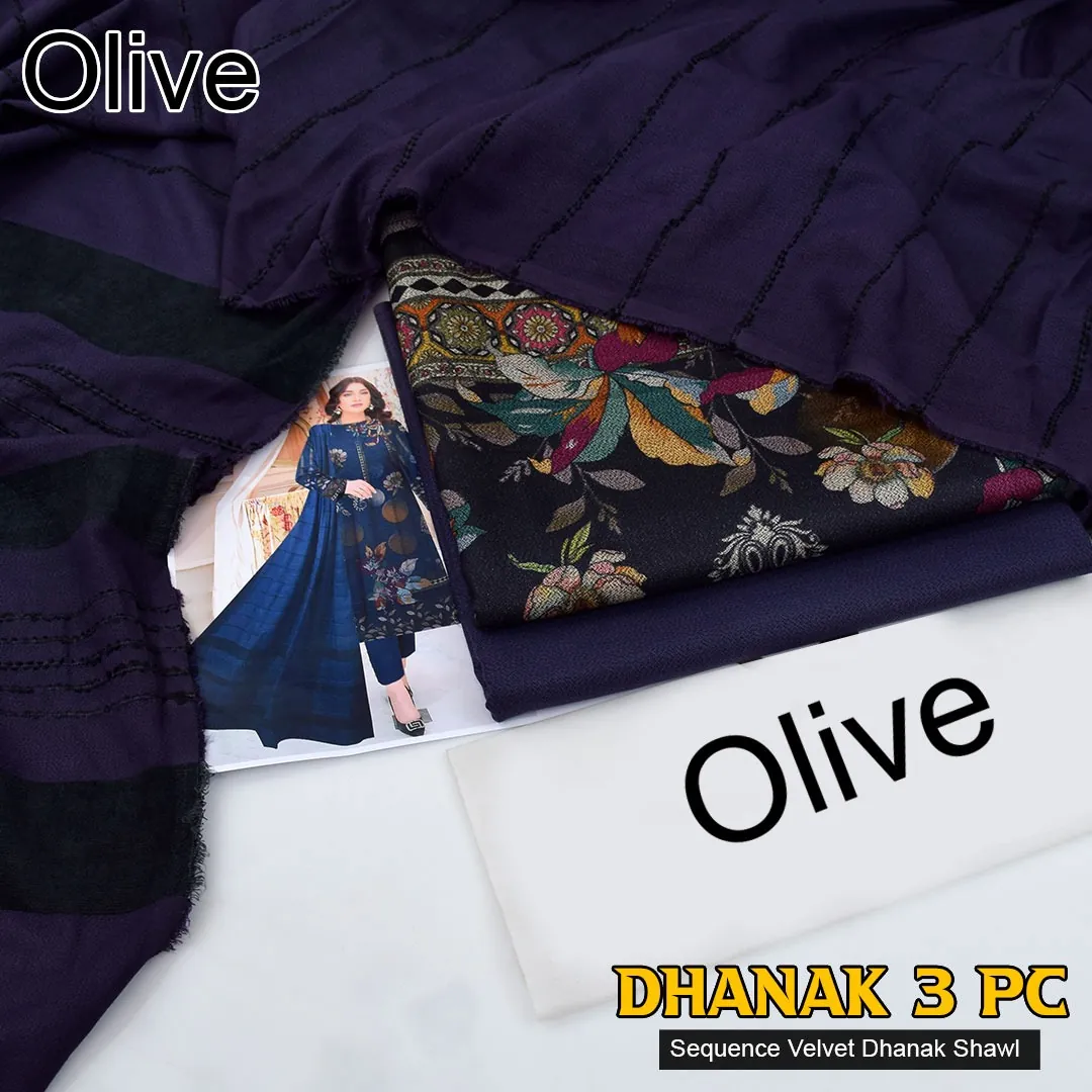 OLIVE Original Digital Printed Dhanak 3-Piece Suit with Velvet & Sequence Shawl