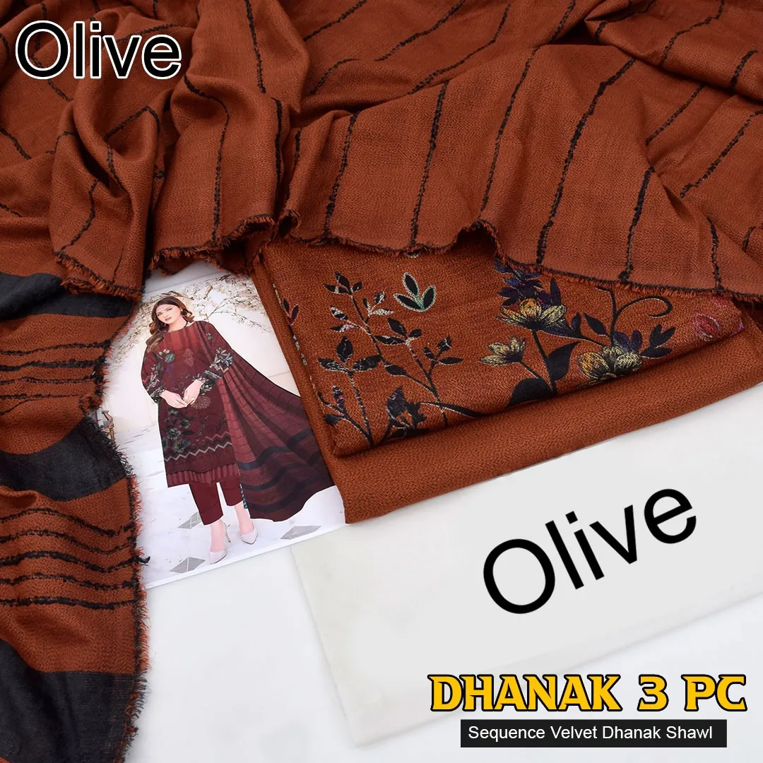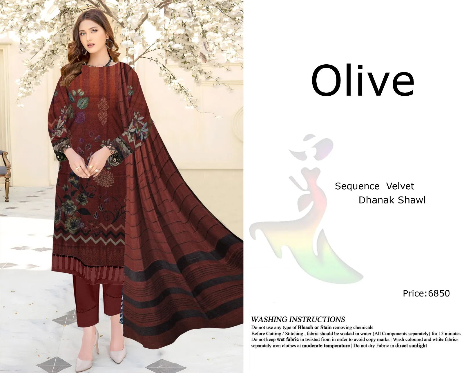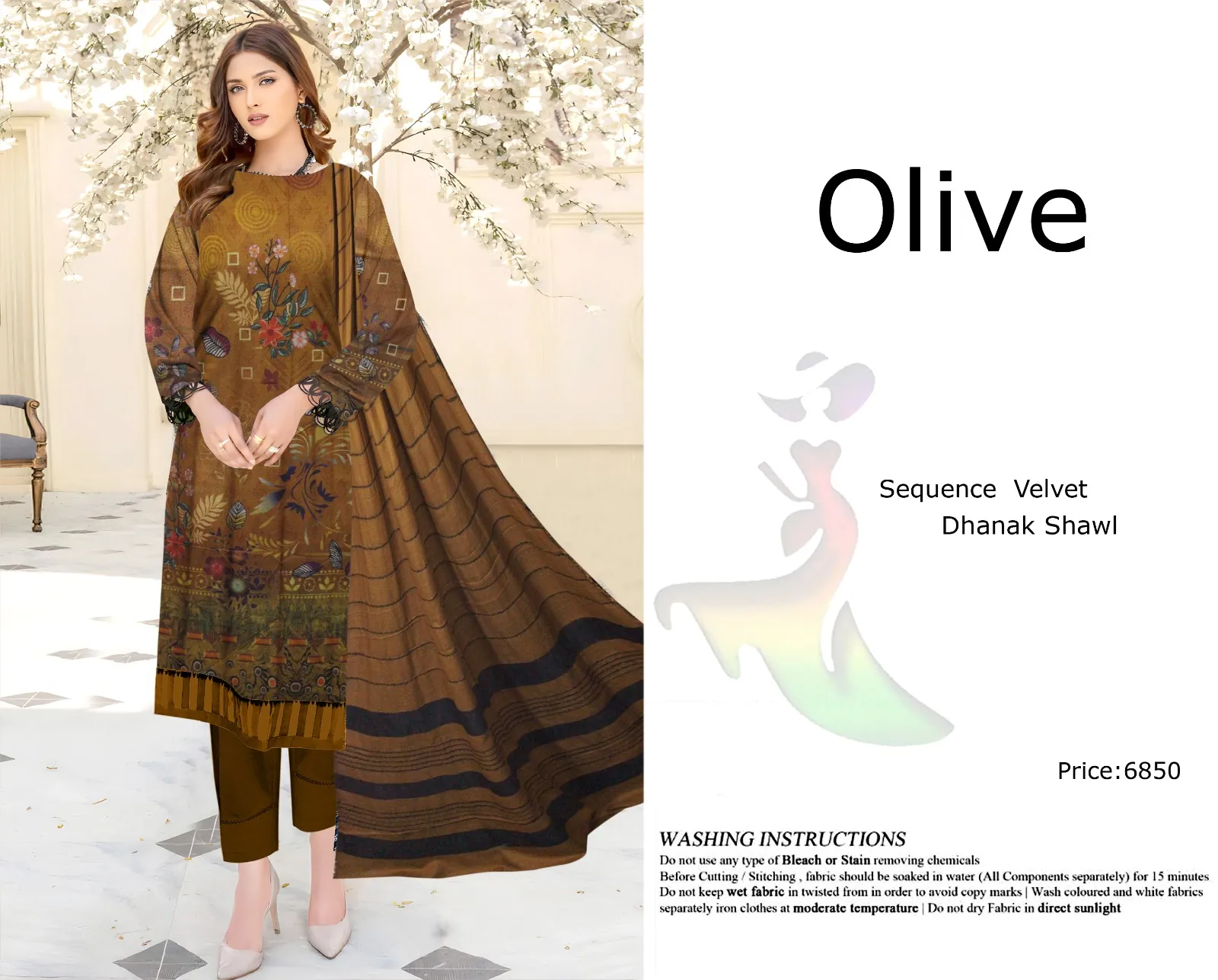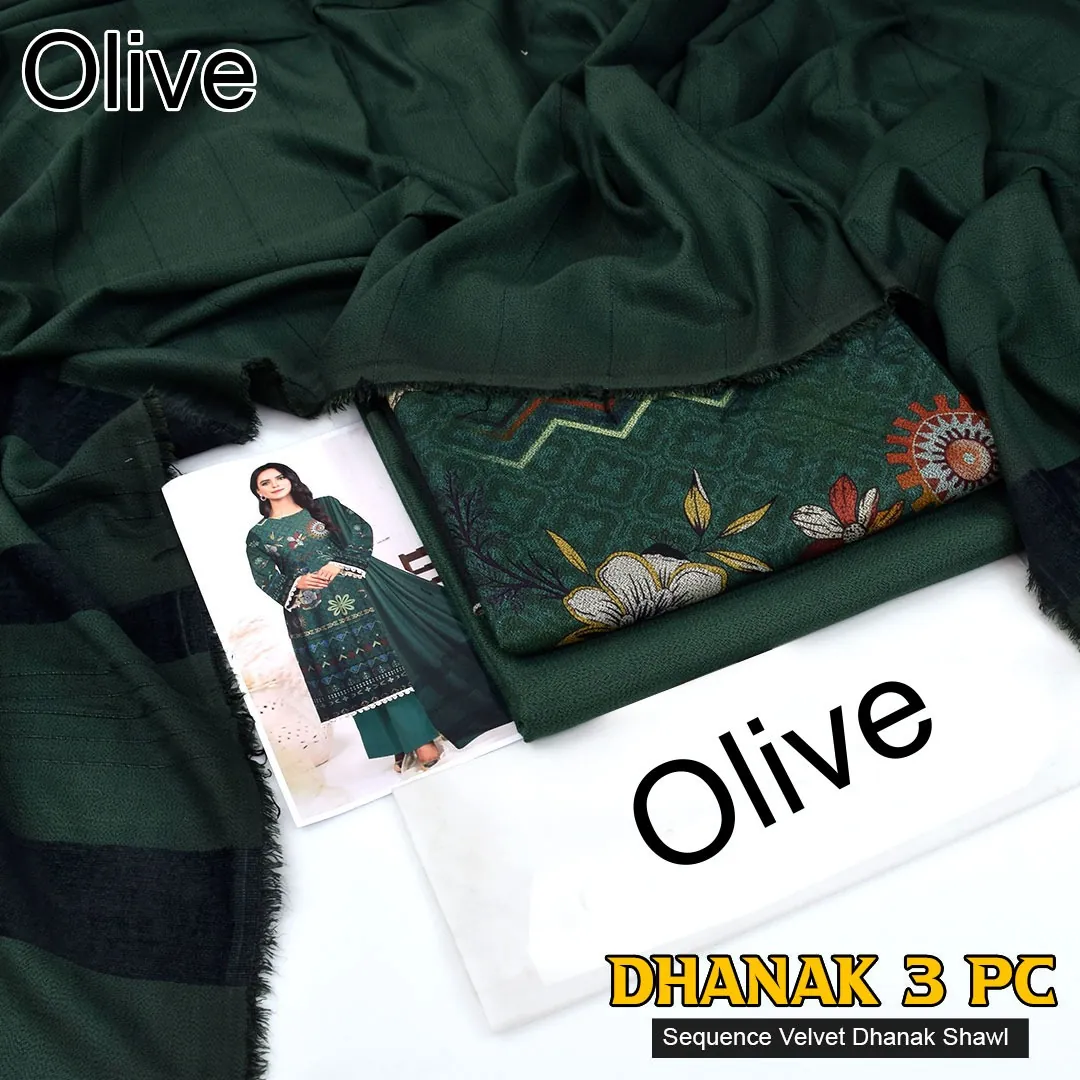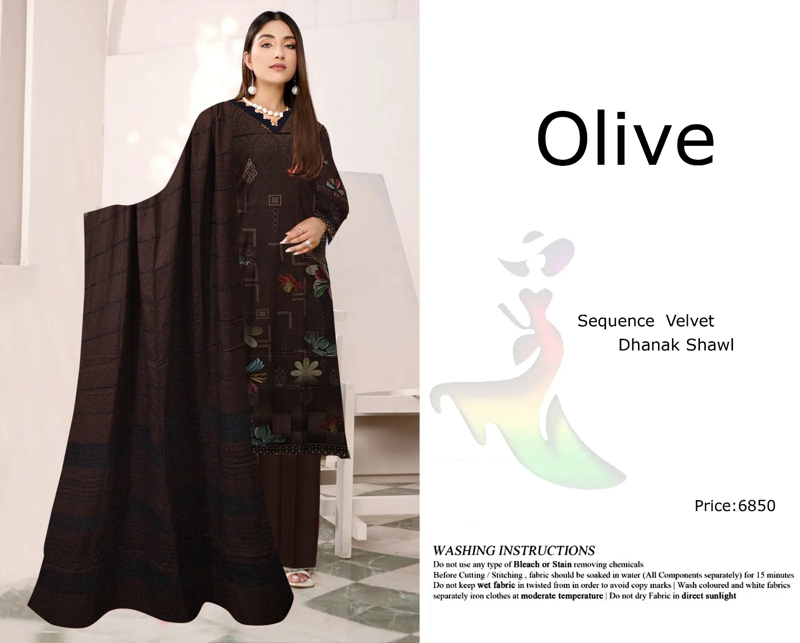 OLIVE Original Digital Printed Dhanak 3-Piece Suit with Velvet & Sequence Shawl