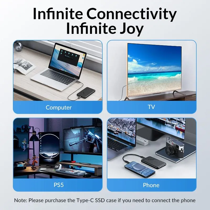 Equipped with USB 3.0 interface supporting up to 5Gbps transfer rate and UASP protocol for enhanced read/write performance.