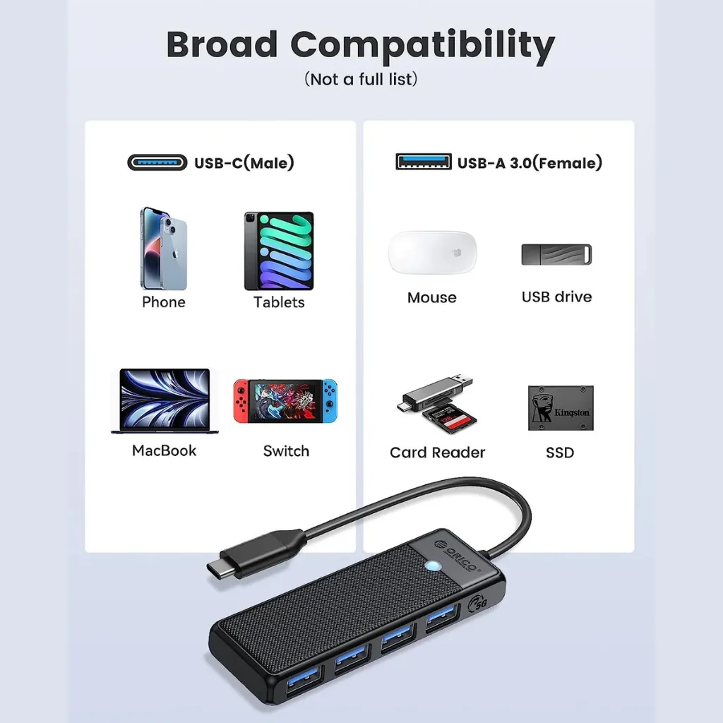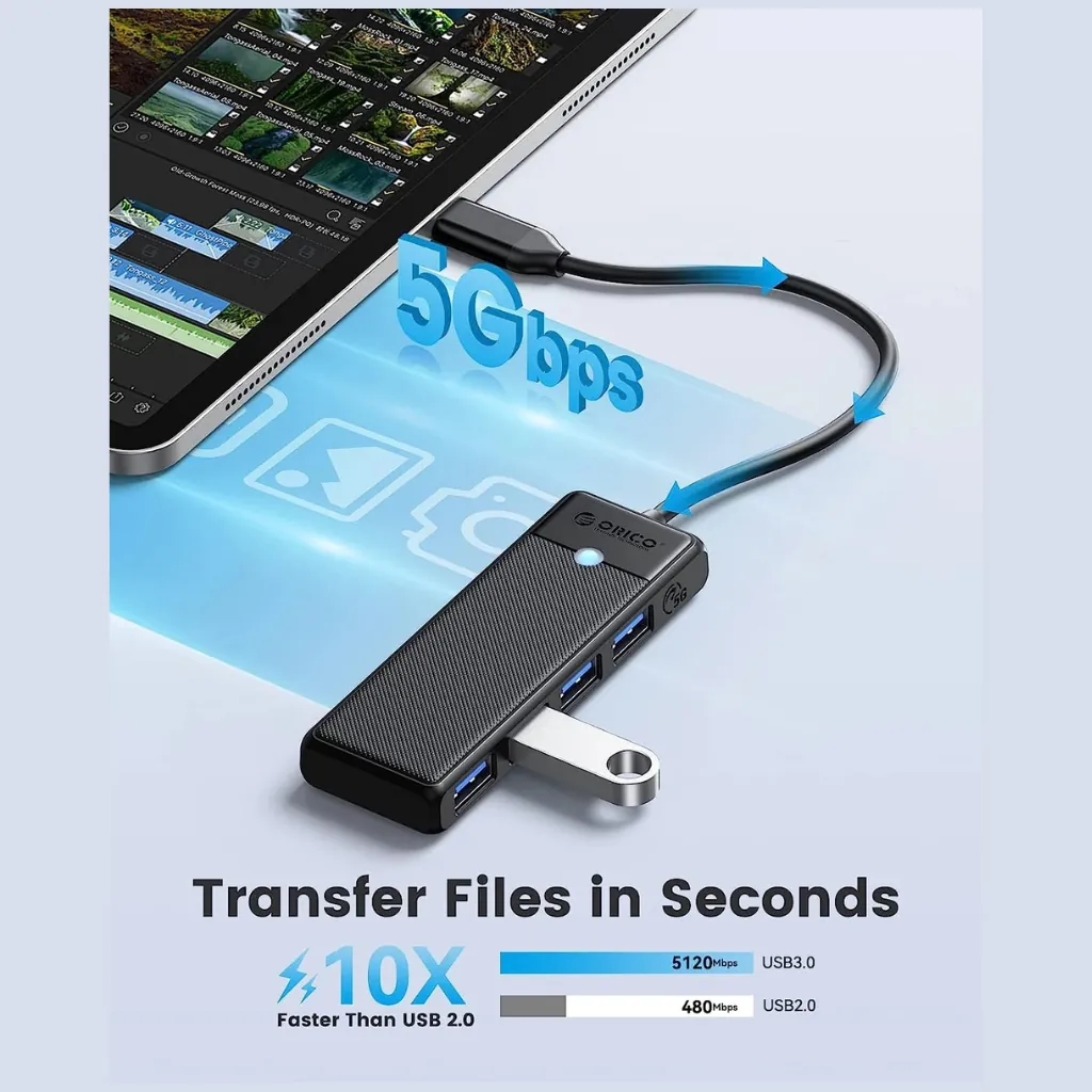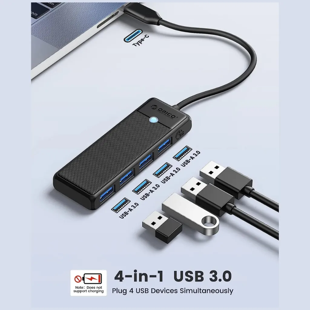 The ORICO Type-C to USB 3.0 4-Port HUB expands a single Type-C port into 4 high-speed USB 3.0 ports with 5Gbps data transfer, perfect for connecting multiple devices to your laptop or PC.