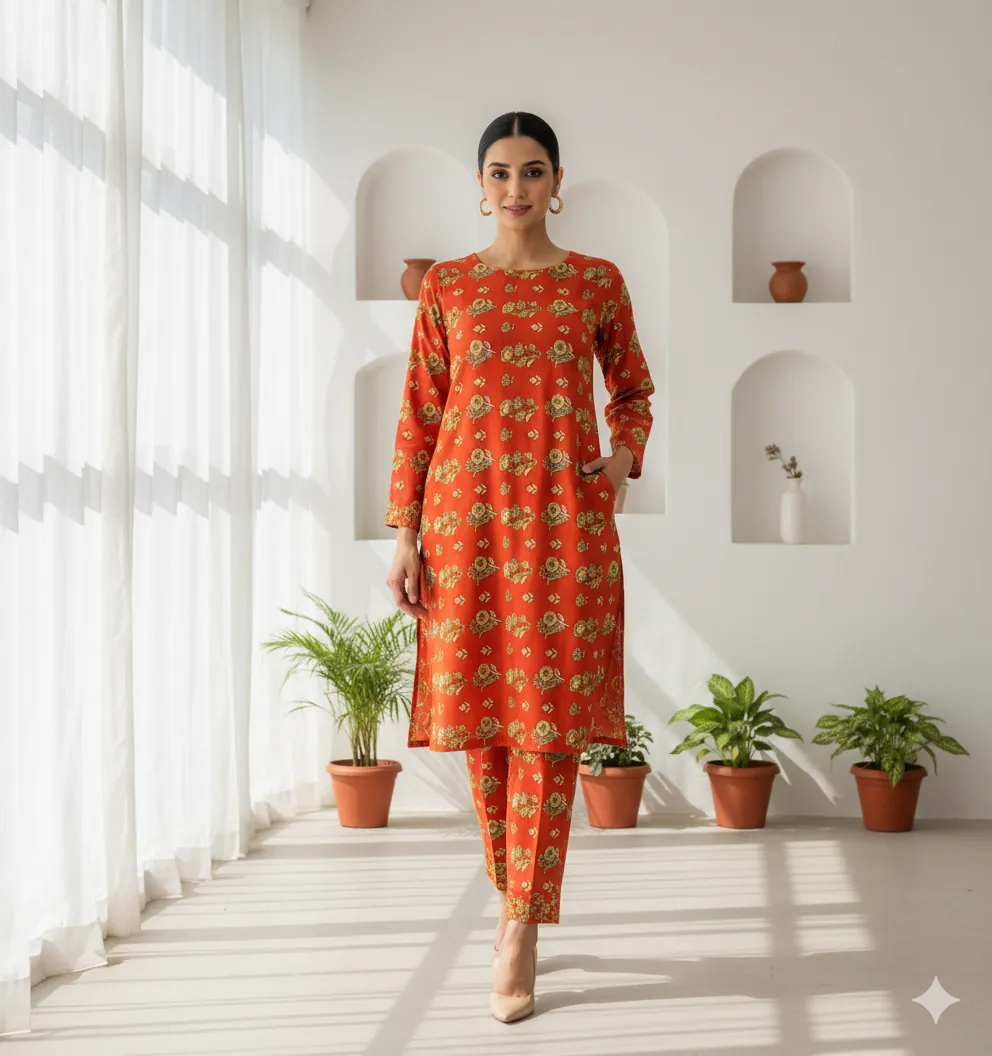 Orient | Autumnal Rust Orange & Green Traditional Floral Khaddar 2-Piece Unstitched Suit | Winter '25. Embrace the warm, earthy palette of the autumn season with this exquisite rust-orange suit from the Orient Winter '25 Collection. It's a celebration of traditional design and contemporary comfort, perfect for the modern Pakistani woman who values both style and substance.