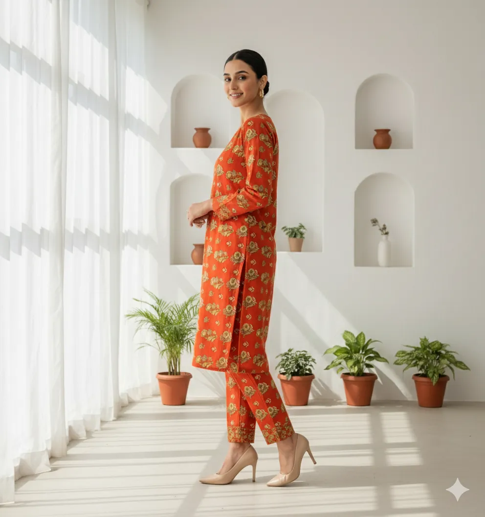 The suit features a classic all-over floral print, reminiscent of traditional block-printing techniques. The elegant motifs, in shades of olive green and beige, create a harmonious and sophisticated pattern against the rich rust-orange background. The matching fabric for the trousers ensures a complete, elegant co-ord set that is effortlessly stylish.