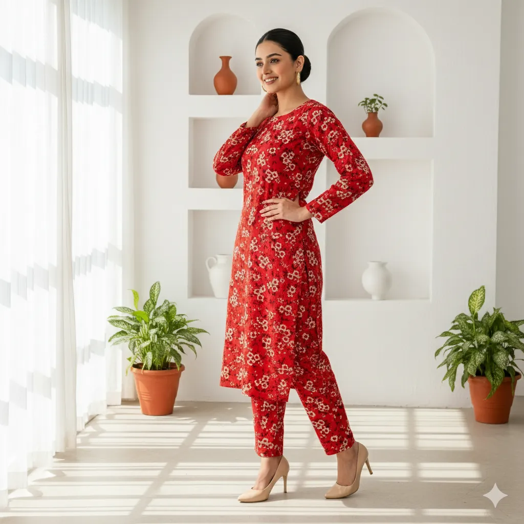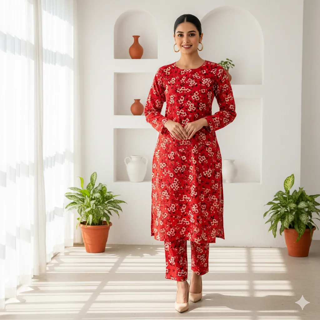 The design features a timeless all-over floral print in a lovely cream shade, set against a classic red base. This color combination is known to flatter all skin tones and is perfect for both daytime and evening events. The matching printed trouser fabric creates a complete and fashionable co-ord set.