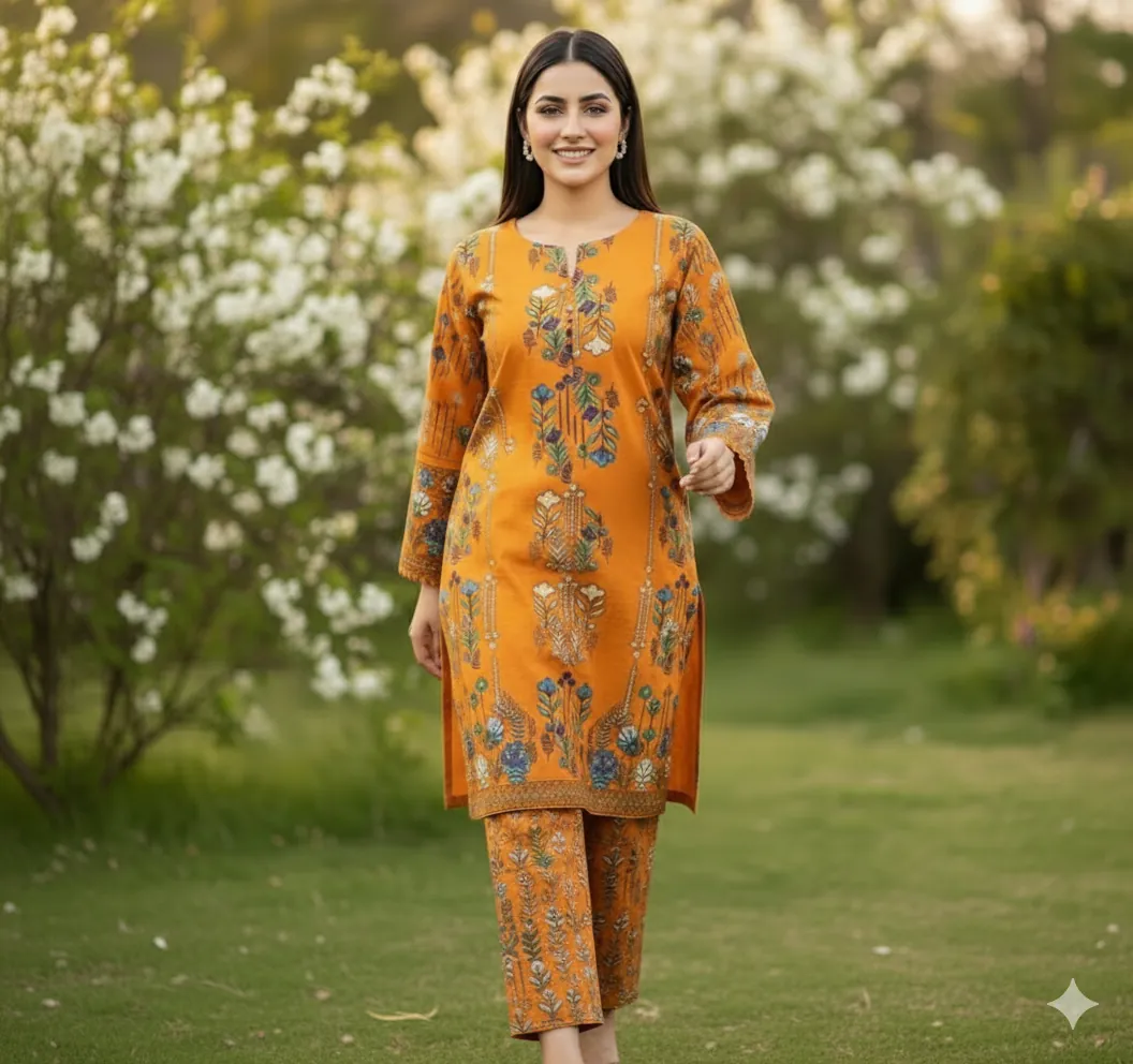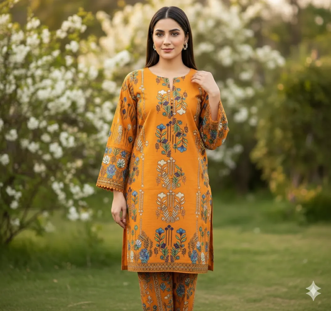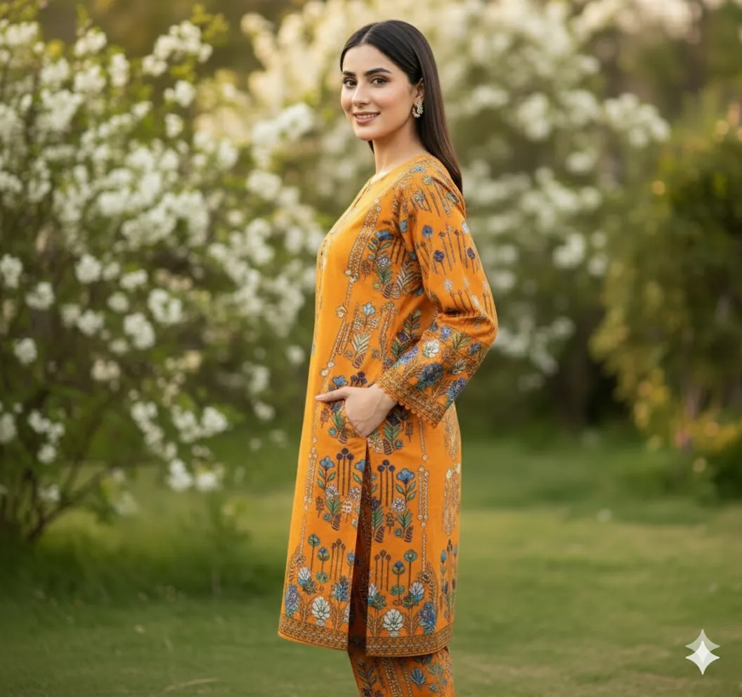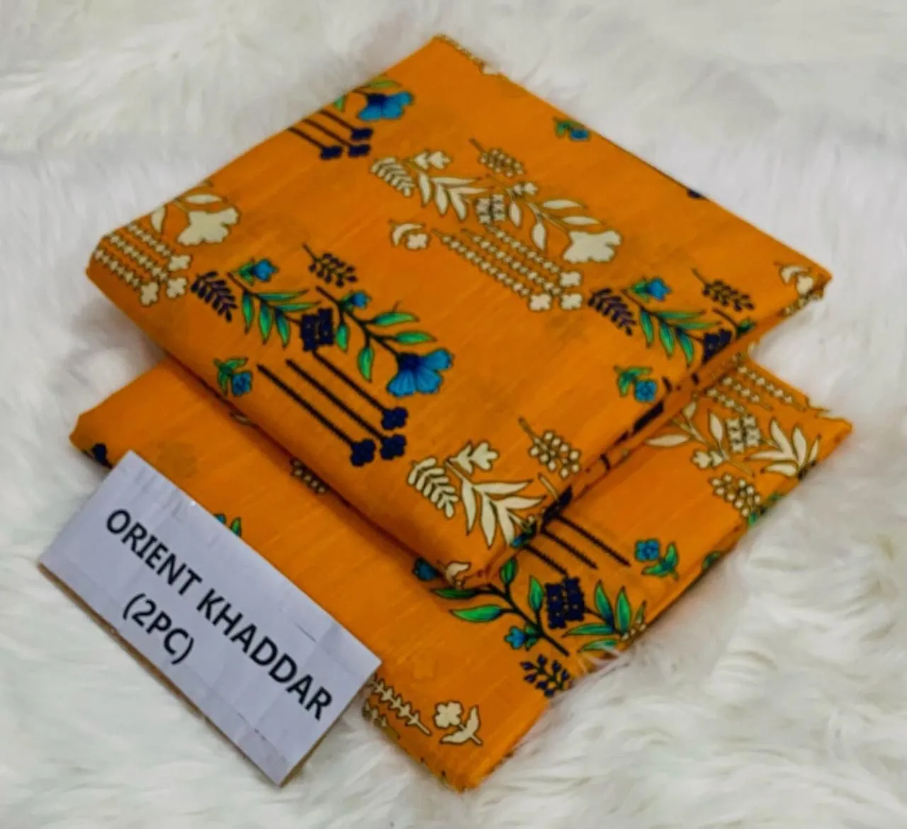 Orient | Marigold Orange & Blue Botanical Panel Print Khaddar 2-Piece Unstitched Suit | Winter '25 Collection.Step into the winter season with unparalleled elegance. Orient presents this exquisite 2-piece suit, a perfect blend of traditional artistry and contemporary fashion from our exclusive Winter 2025 collection.