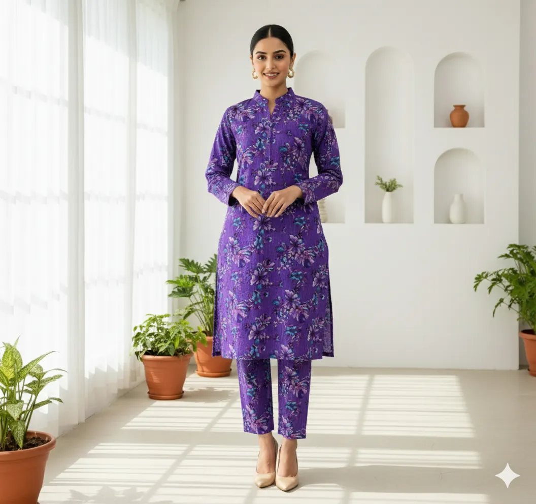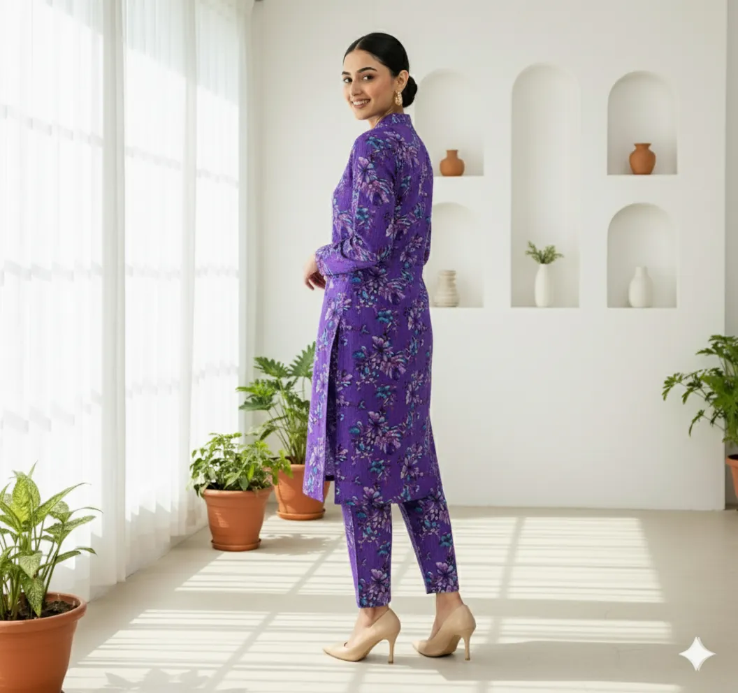 The soul of this suit lies in its captivating, painterly floral print. The base color is a magnificent royal violet (جامنی), a hue associated with luxury and confidence. Upon this rich canvas, abstract flowers bloom in tonal shades of lavender and purple, creating a deep, cohesive look. The design is given a fresh, contemporary twist with brilliant pops of teal (firozi) foliage, which makes the entire print stand out. This unique color combination is incredibly versatile; it shines beautifully in the bright Sargodha morning light and transitions perfectly into an elegant choice for evening events. The seamless all-over print on both the shirt and trouser fabric makes for a truly striking and fashionable co-ord set.