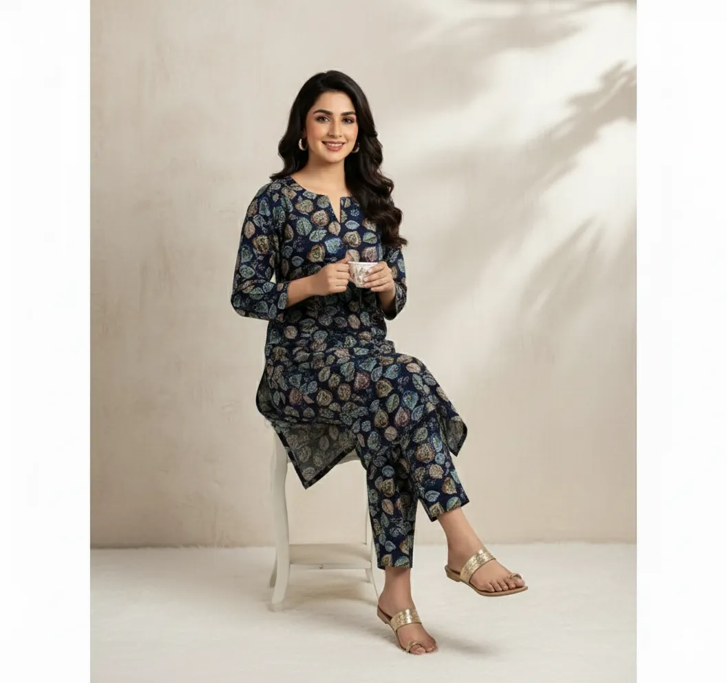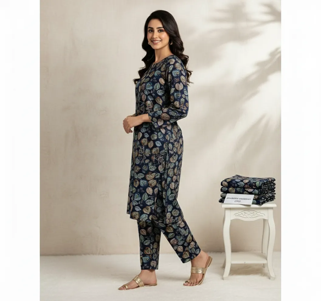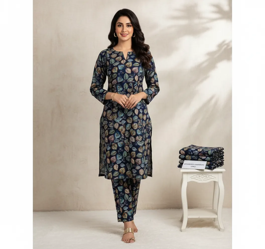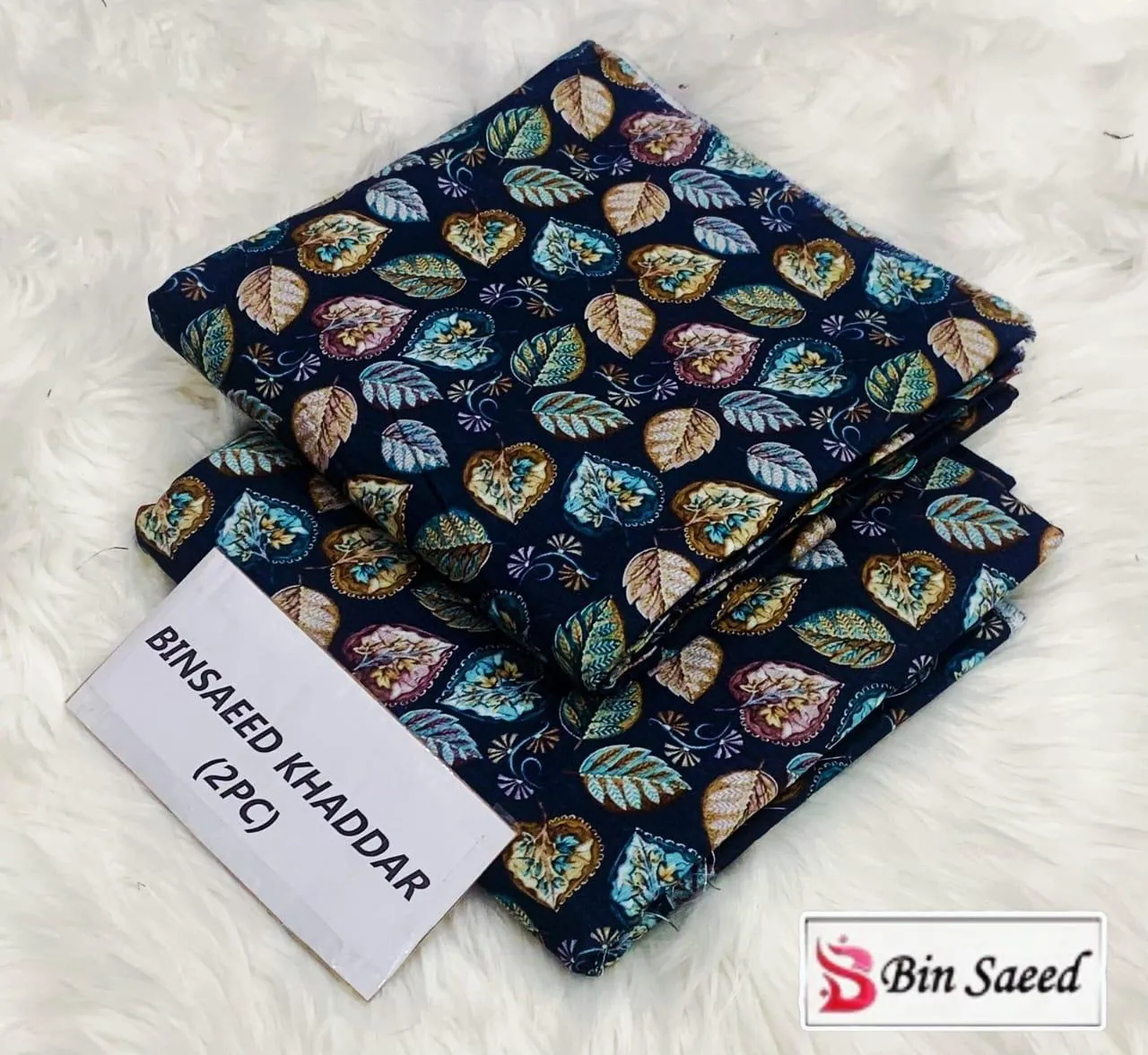Original Bin Saeed 2-Piece Khaddar Suit in Navy Blue with Multi-Color Leaf Print | Unstitched. This eye-catching design from the Bin Saeed winter collection features a sophisticated navy blue canvas brought to life with an artistic, all-over leaf print. The leaves are rendered in a beautiful and diverse palette of teal, rust, beige, and soft pink, creating a unique and modern look that moves beyond typical florals.