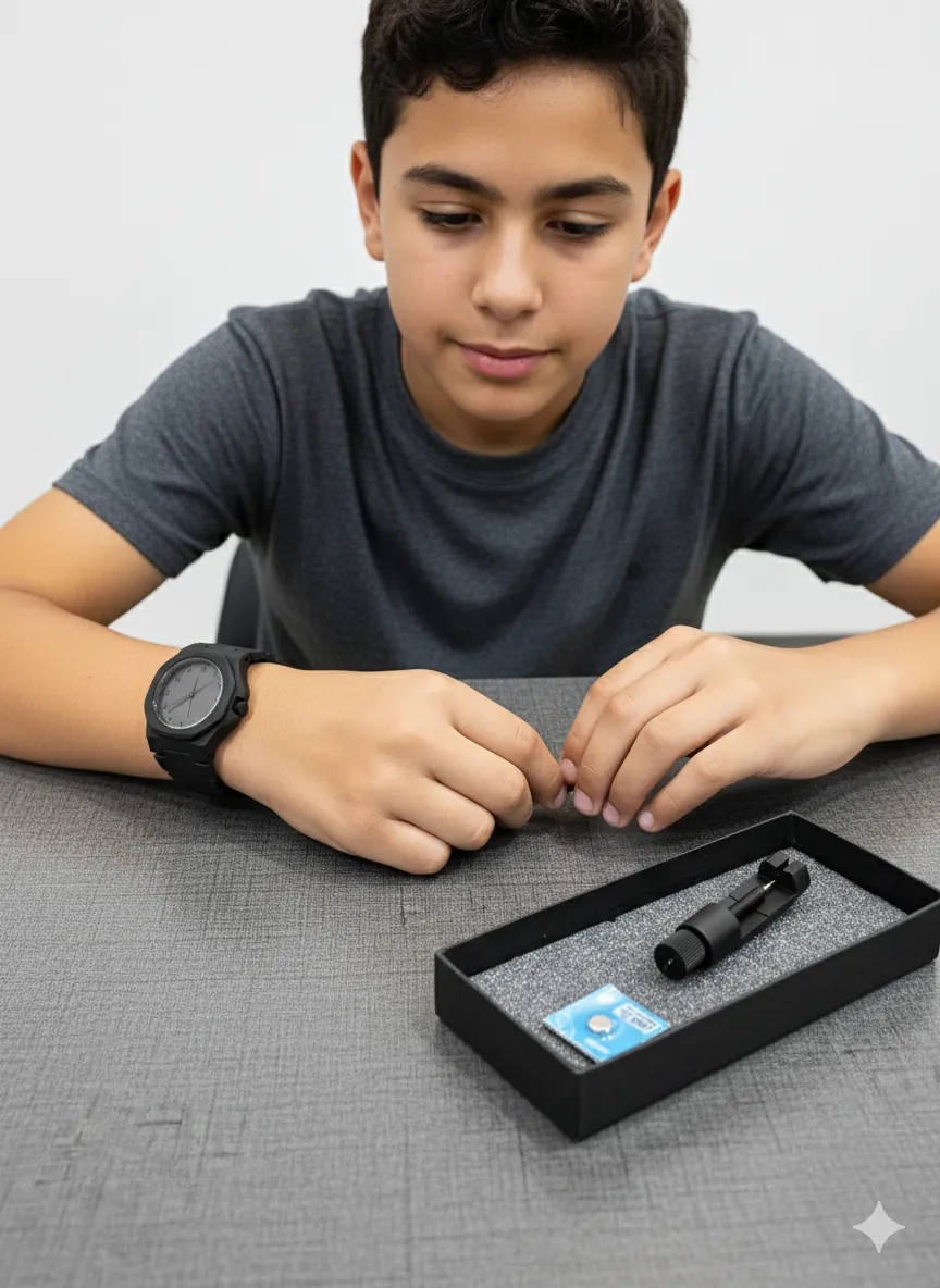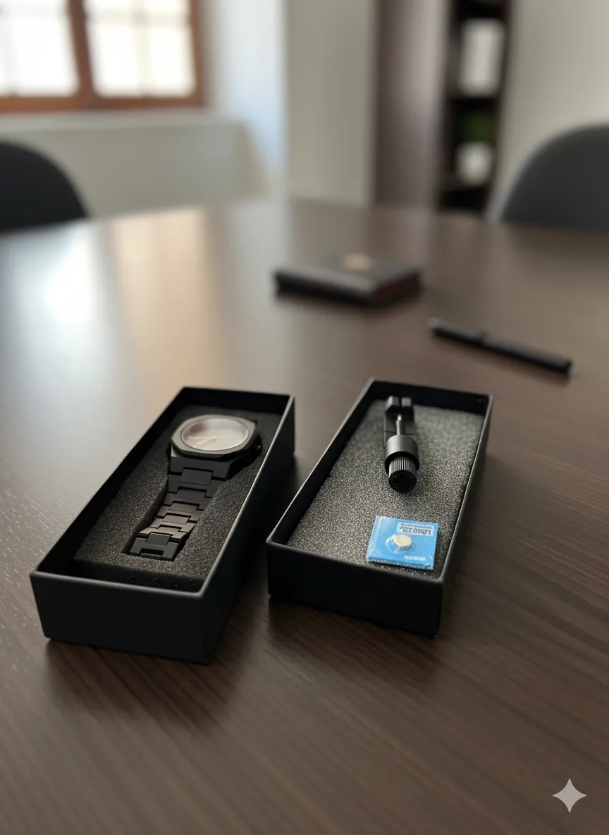 The watch features a durable, black chain link strap that complements its unique face. It's designed for a perfect fit, and with the included chain adjustable tool, you can easily customize the size to your wrist at home.The package comes complete with everything you need: the watch itself in its original box, the chain adjustable tool, and a bonus extra battery cell, ensuring your timepiece keeps ticking for a long time. Whether for a casual outing or a formal event, the Aura Watch is the ideal accessory to complete your look.