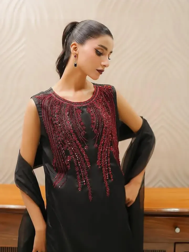 Original FPL 2K25 Black and Red Handwork Organza Suit with Katan Silk Trouser | Wedding Partywear