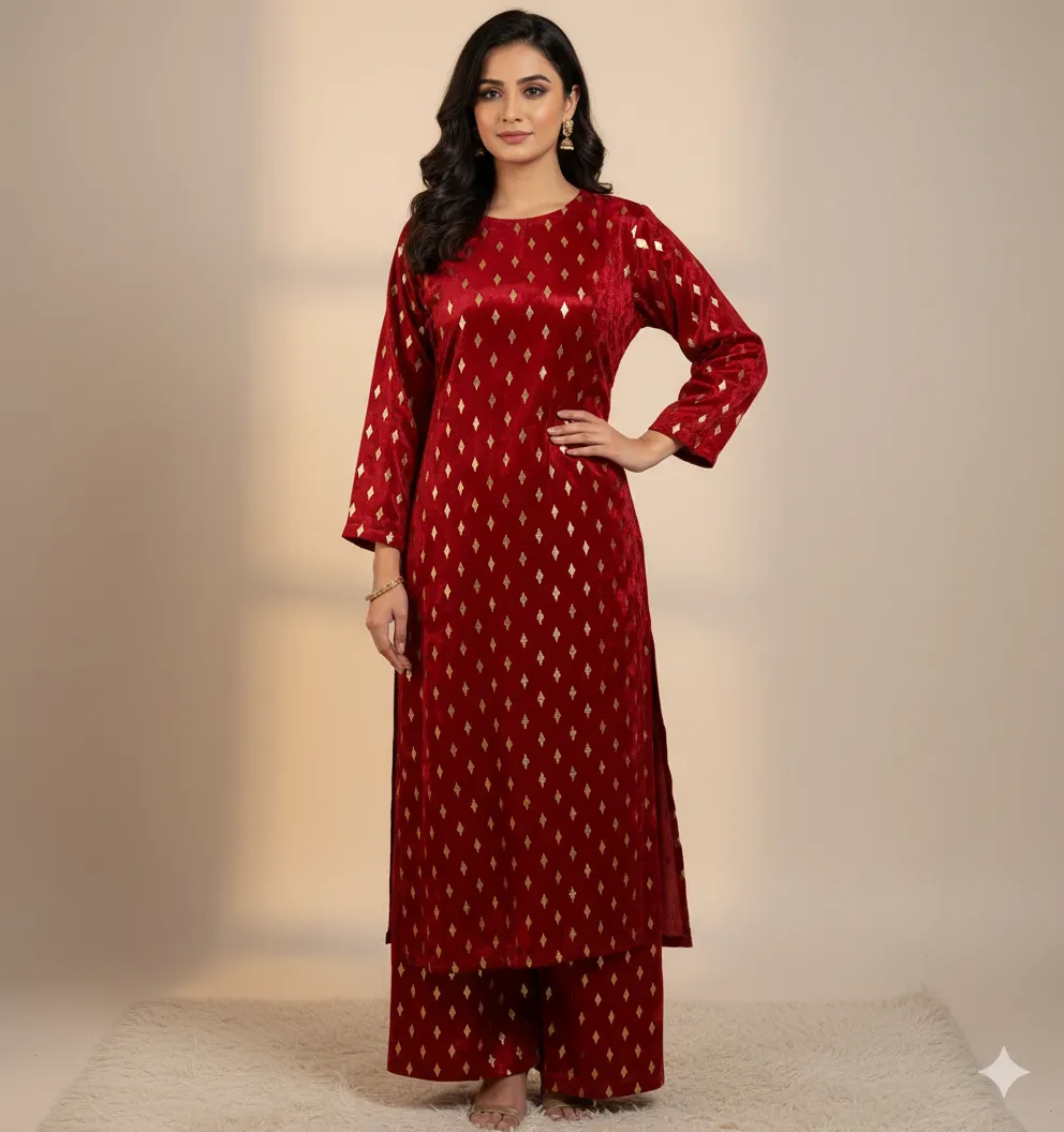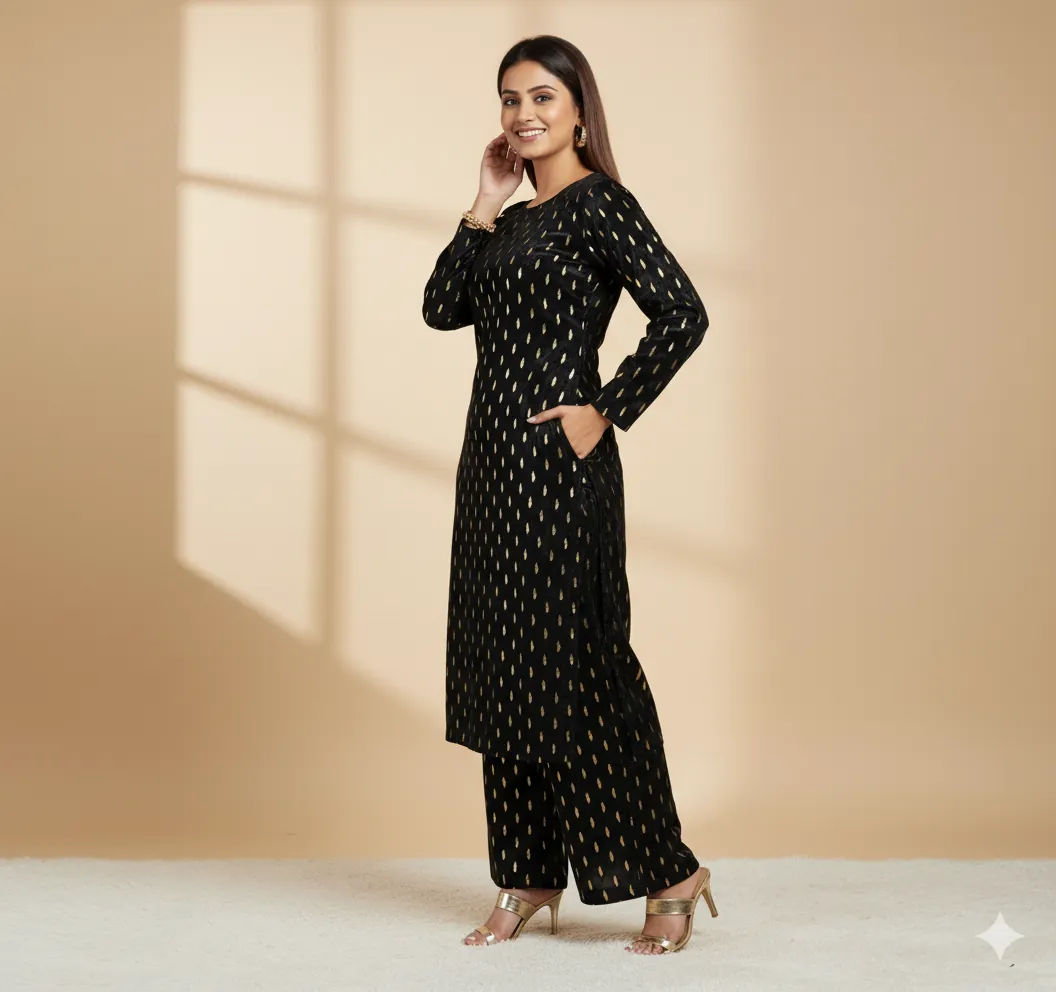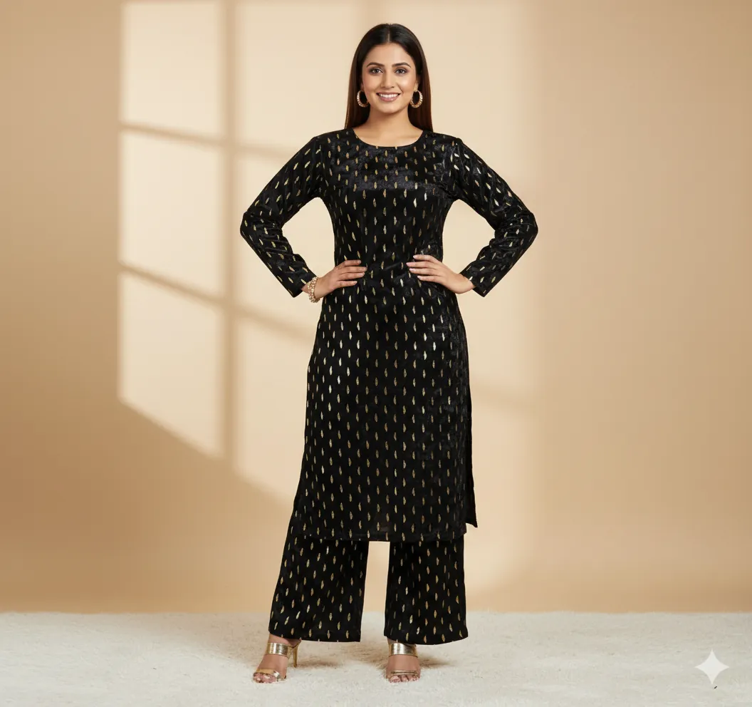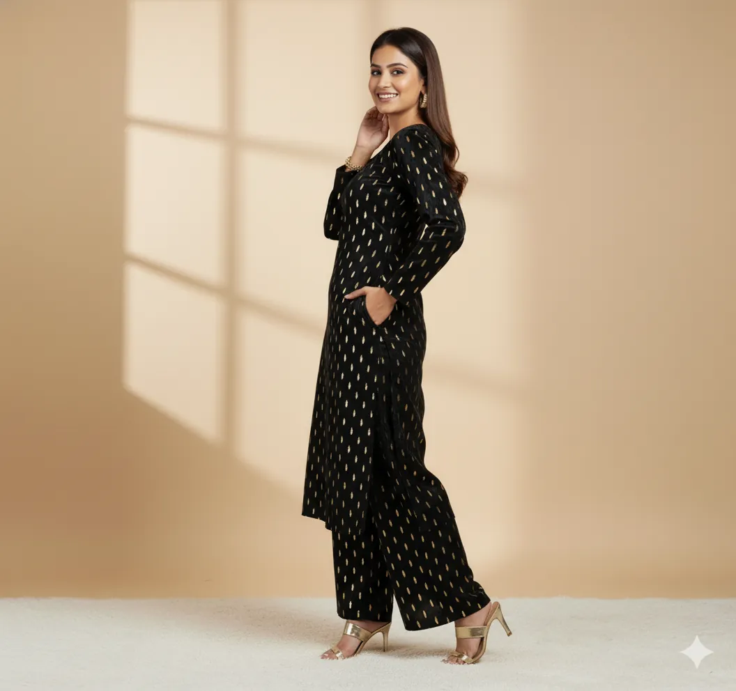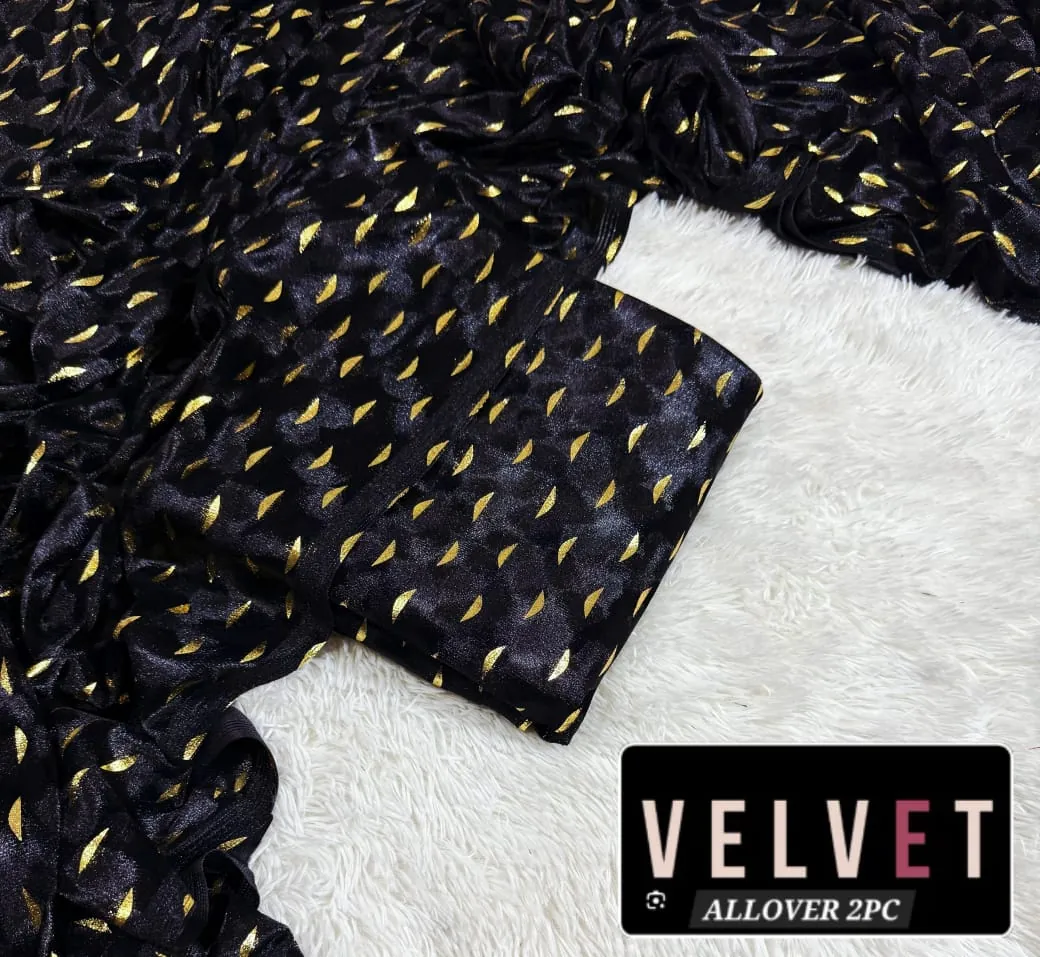 Outclass Black Velvet 2-Piece Suit | Fancy 3-Yard Unstitched Fabric with 58" Arazz. Elevate your wardrobe with the unparalleled elegance of this Black Fancy Velvet 2-Piece Suit by Outfitters. Designed for those who demand outclass quality with absolutely no compromise, this unstitched ensemble is a must-have for any festive or formal occasion. The rich, soft velvet fabric drapes beautifully and features a shimmering foil print, capturing light perfectly. Each suit comes with a 3-yard standard cutting, giving you ample material to tailor a comfortable and perfectly sized outfit. The 58-inch arazz (width) makes it ideal for designing broad, flowing silhouettes like palazzo pants or wide kurtas. Although this piece is a classic black, our full collection is available in a magnificent volume of different colors to suit every taste. Shop now for a luxurious suit that offers both supreme comfort and lasting quality.