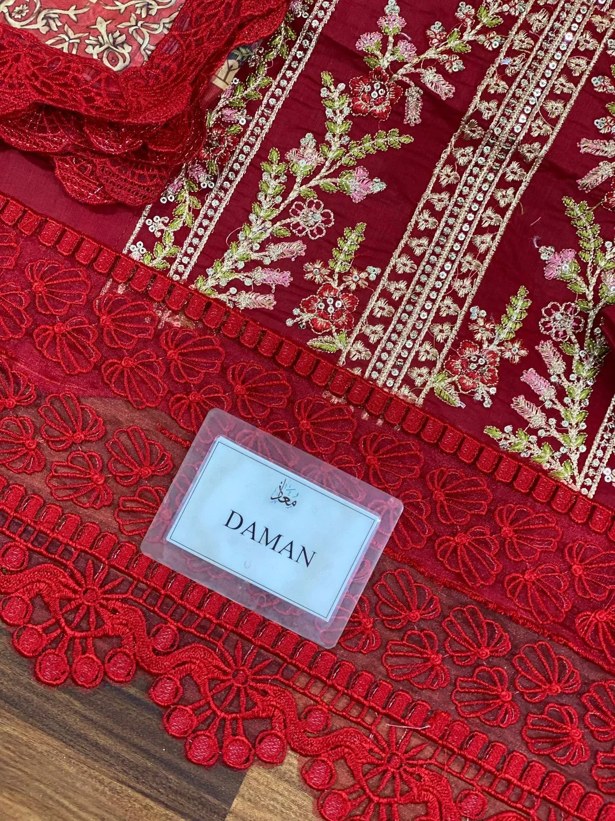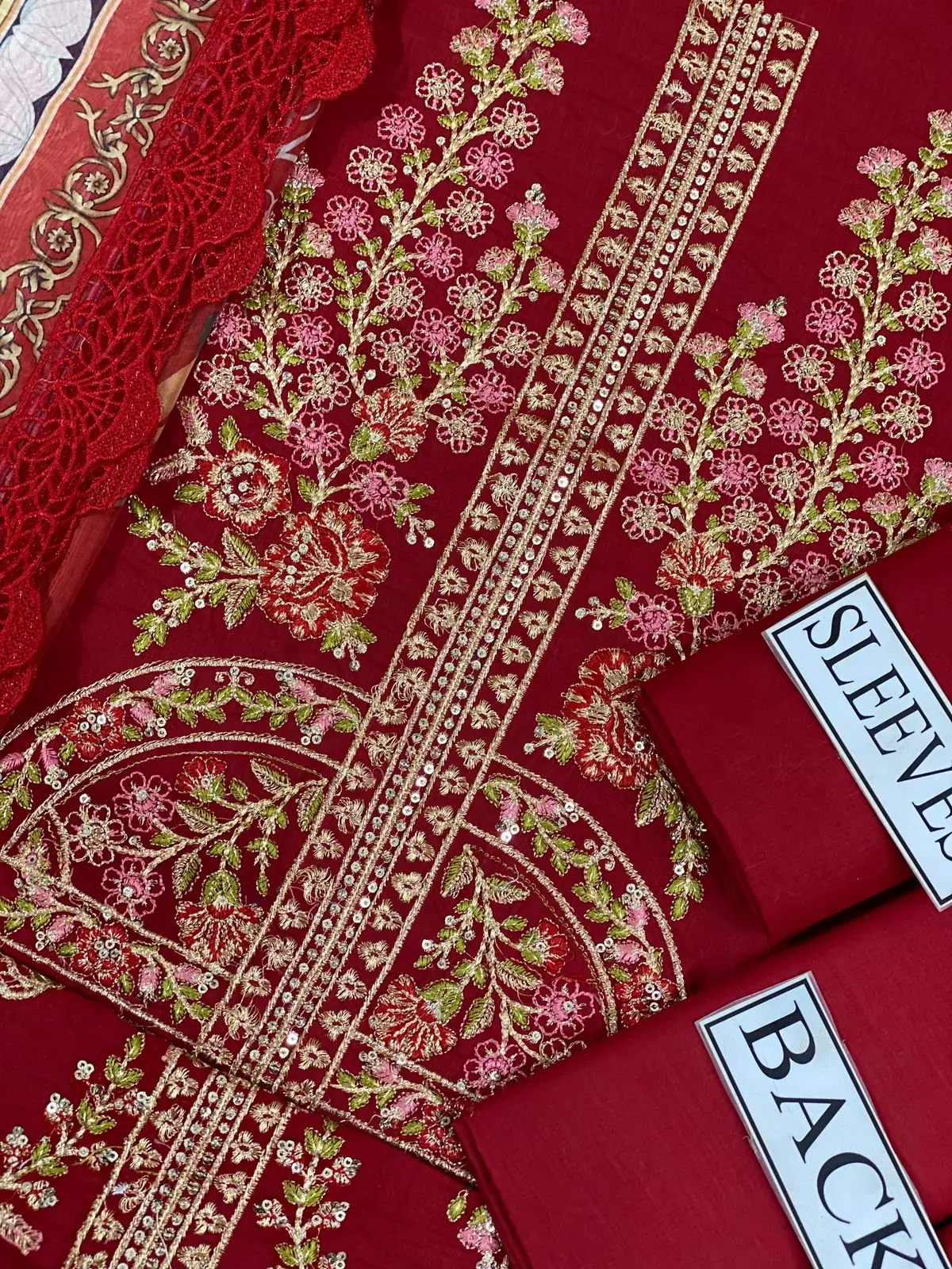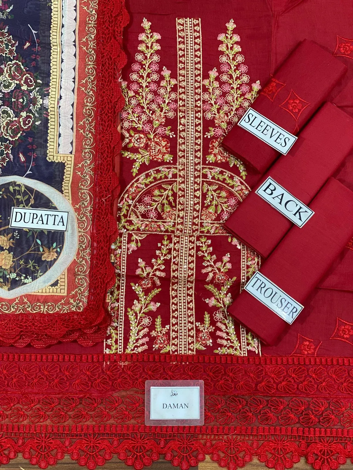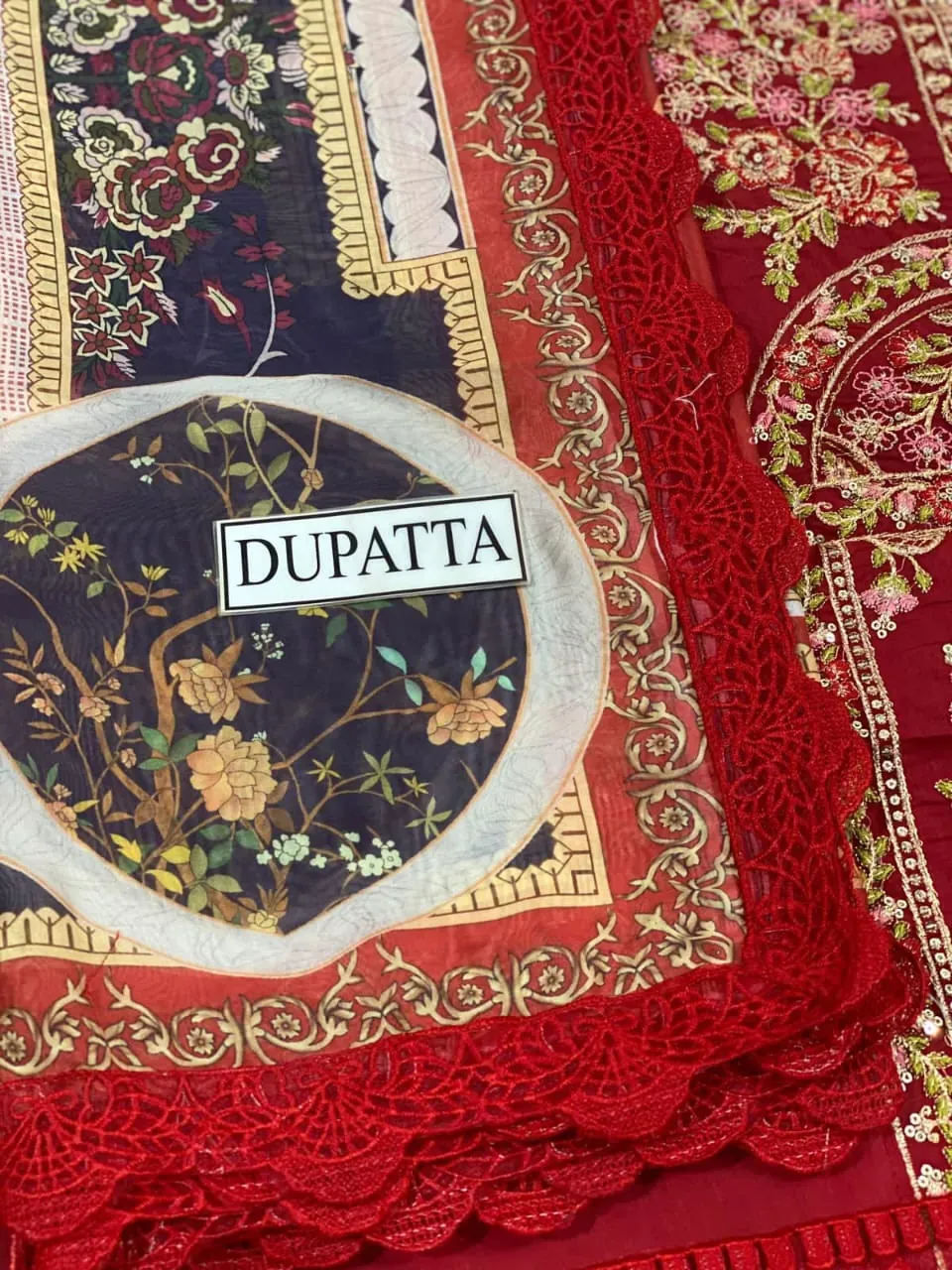 Pakistani Festive Red Embroidered Three-Piece Suit with Digital Printed Dupatta