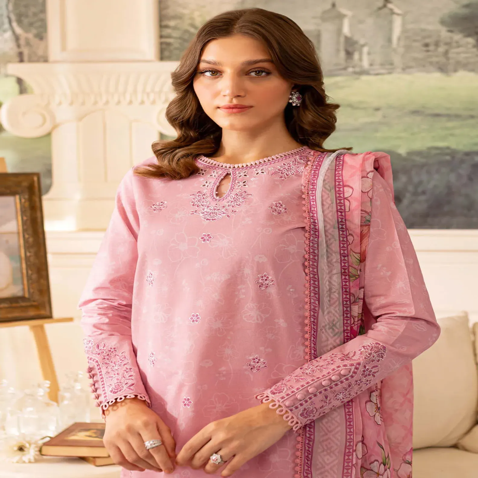 Pink Embroidered Lawn Suit with Floral Chiffon Dupatta, A beautiful three-piece unstitched lawn suit in solid pink with detailed embroidery. The set includes a lawn shirt, trousers, and a floral chiffon dupatta, along with embroidered patches for the neck, sleeves, and daman.