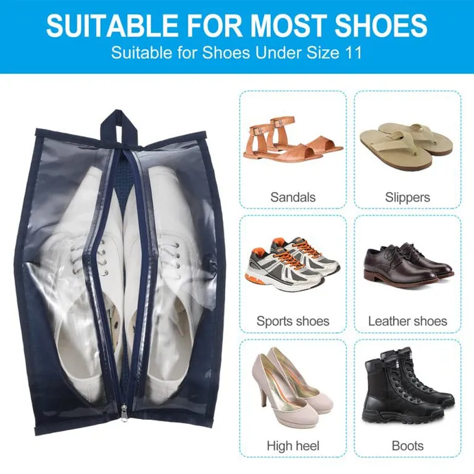 These waterproof shoe pouches are a practical solution for organizing and protecting your footwear during travel or at home. Made from durable PVC material with a secure zipper closure, they keep shoes separate from clean clothes and prevent dirt and moisture from spreading. The clear design allows you to easily identify the shoes inside. With convenient carrying handles, these pouches are perfect for packing in luggage or storing shoes neatly in closets. They can accommodate various shoe types, including sneakers, sandals, and boots.