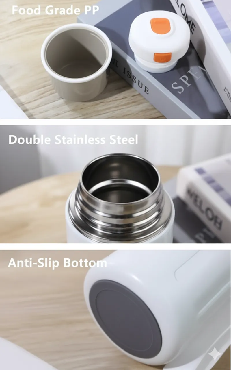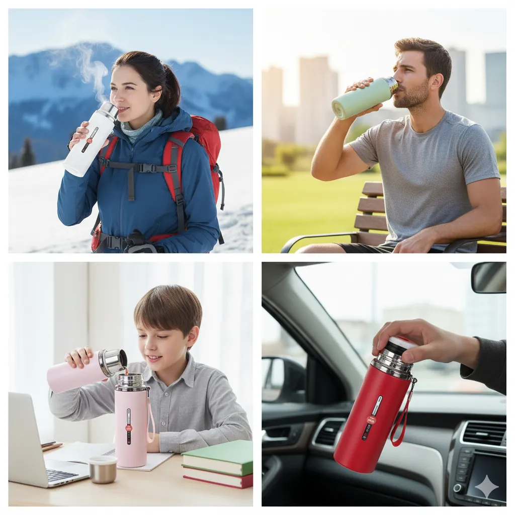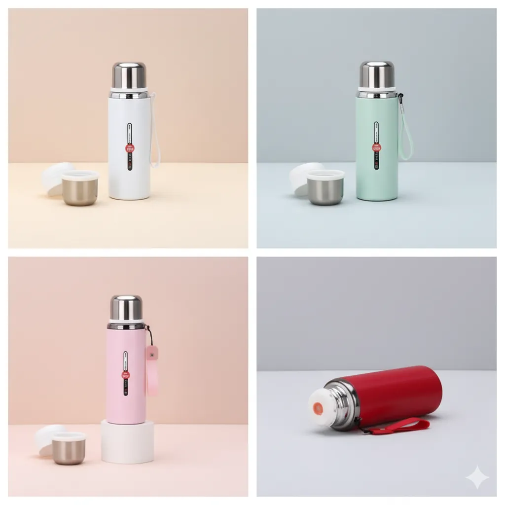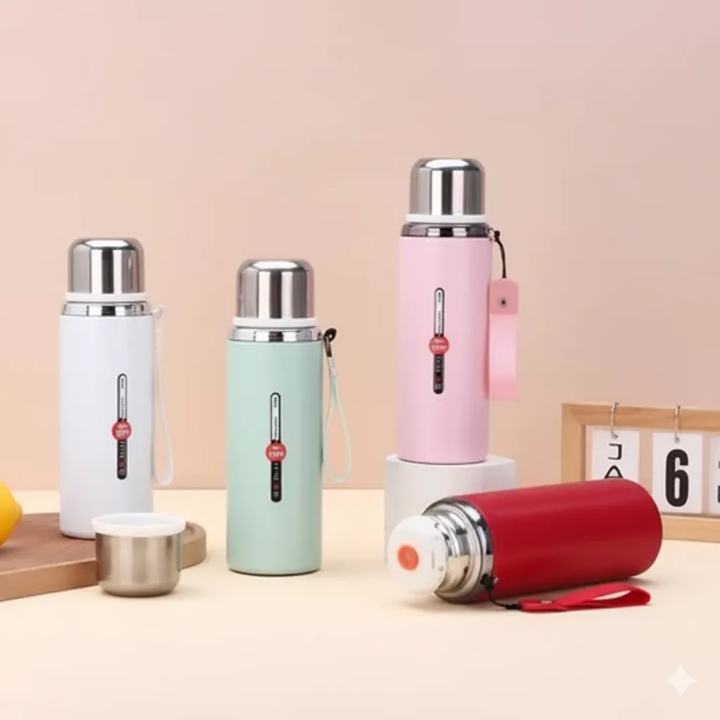 Each thermos features a clever integrated cup as its lid, allowing you to easily pour and enjoy your drink on the go without needing extra accessories. The leak-proof design ensures no spills in your bag, making it ideal for daily commutes, school, office, gym, hiking, or travel. Available in a range of attractive colors, these flasks are not only functional but also make a chic accessory for any lifestyle. The included carry strap (or sleeve, depending on the variant) adds an extra layer of portability and ease.