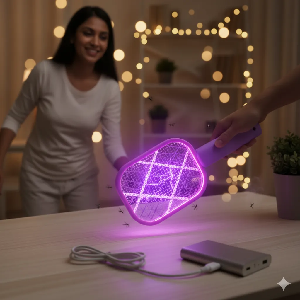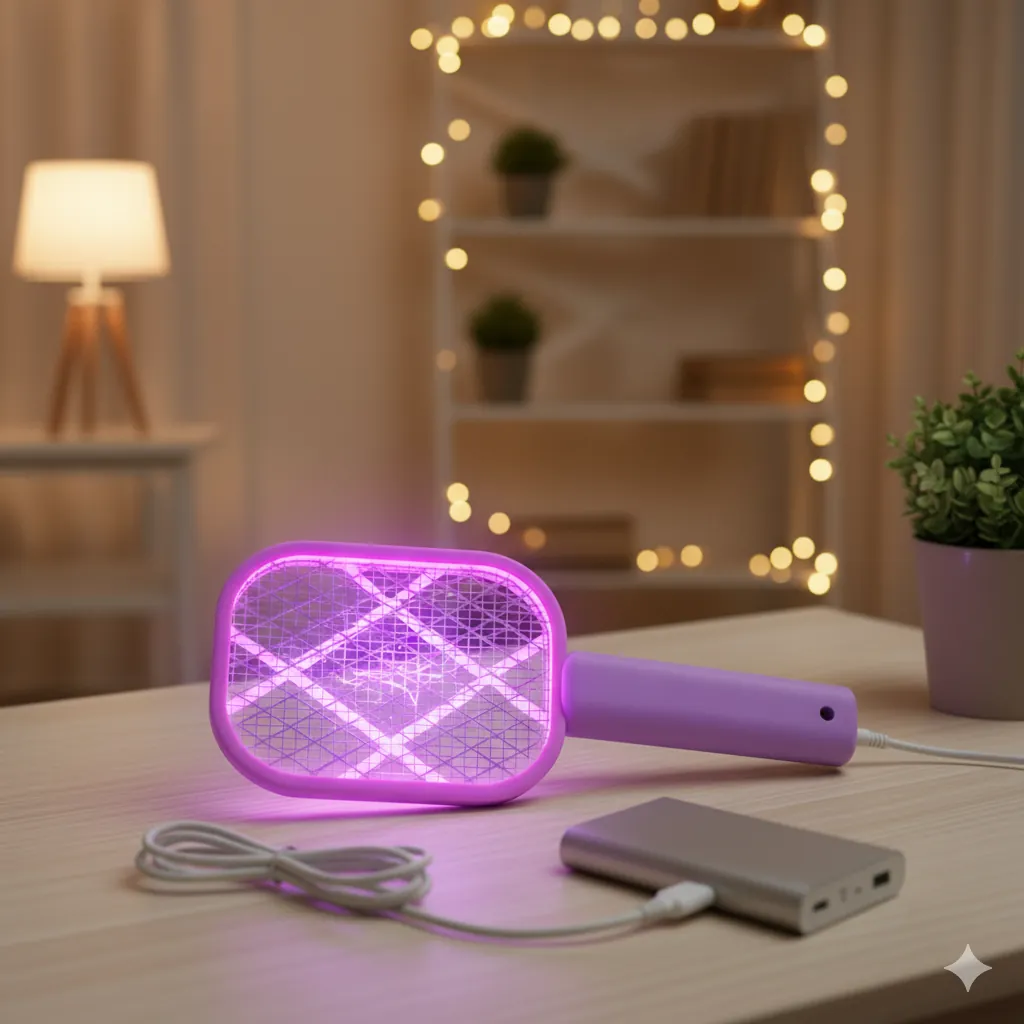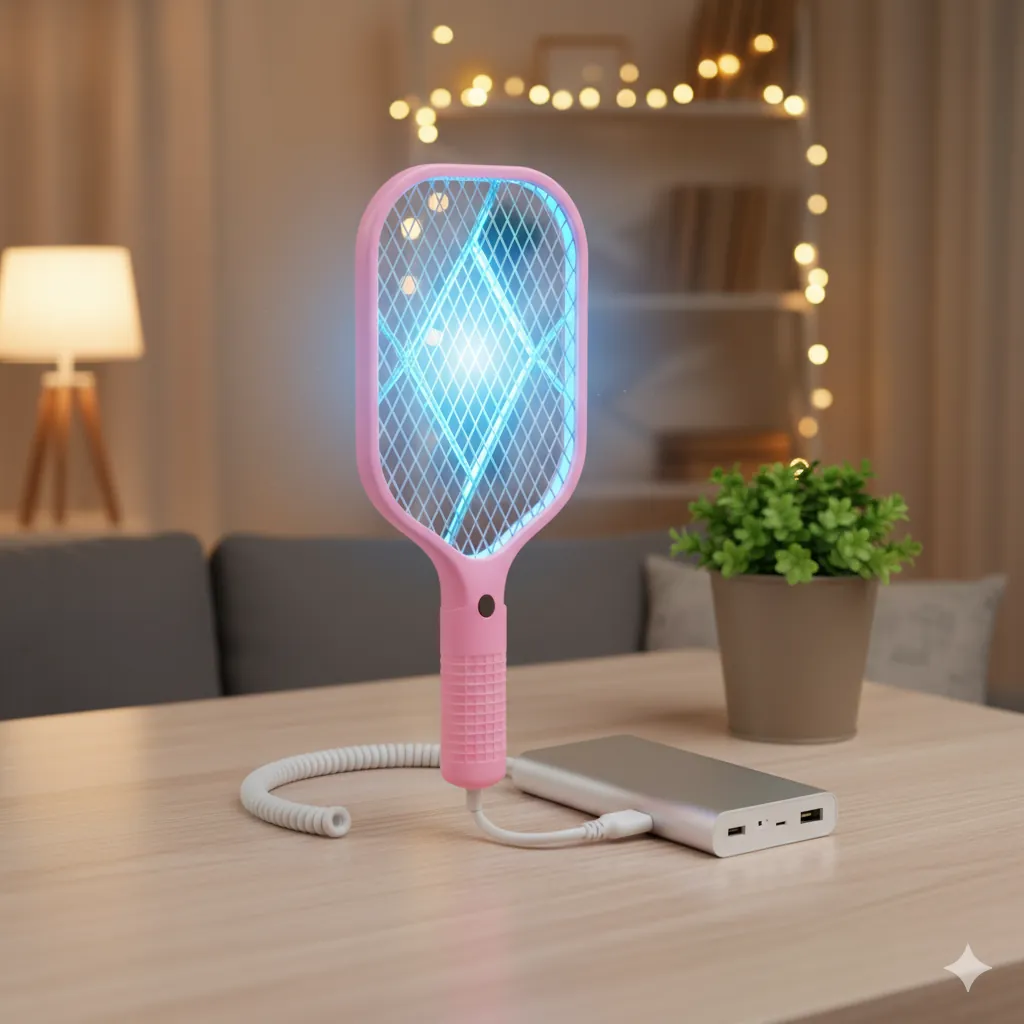 Powerful USB Rechargeable Electric Mosquito Swatter with UV Light Trap | Insect Racket Killer for Home & Outdoor Use. Take back your space with this powerful and rechargeable electric mosquito and insect swatter. Engineered for efficiency, it features a large surface area and a high-voltage grid to instantly stun and kill mosquitoes and other flying insects with just "one hit." Beyond manual swatting, the swatter includes a built-in UV light trapping function which can be used to attract pests, turning it into a stationary insect killer. It's USB rechargeable, making it portable and easy to power up using a power bank, charger, or laptop (as shown in the images). Ideal for use in homes, patios, gardens, or while camping. Its safe-to-touch 3-layer safety mesh design protects users while delivering powerful insect control.
