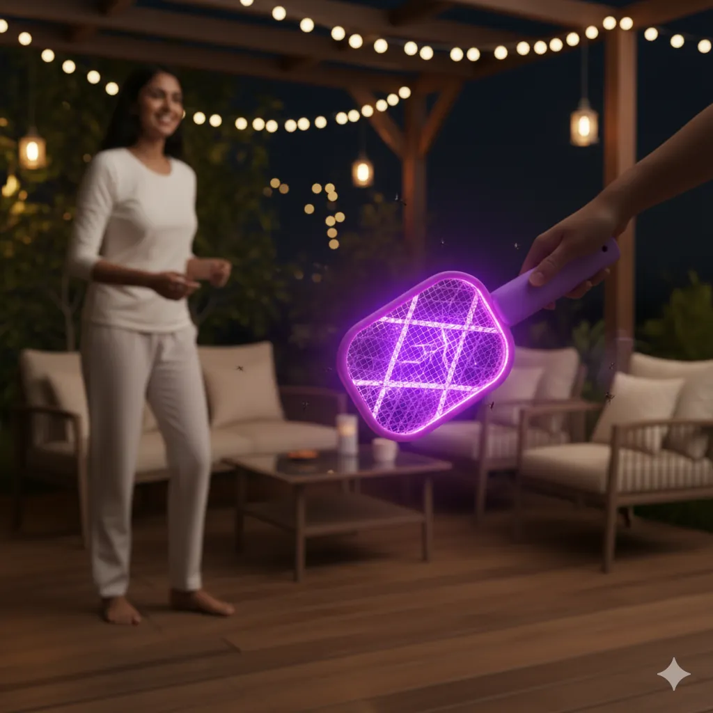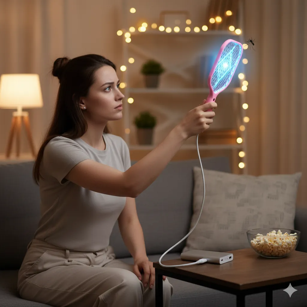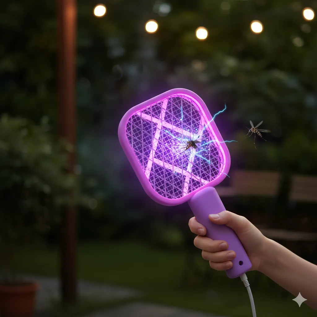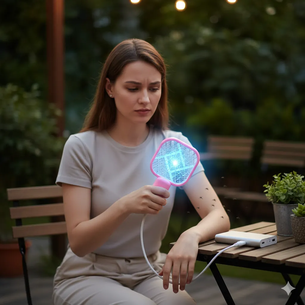 Powerful USB Rechargeable Electric Mosquito Swatter with UV Light Trap | Insect Racket Killer for Home & Outdoor Use. Take back your space with this powerful and rechargeable electric mosquito and insect swatter. Engineered for efficiency, it features a large surface area and a high-voltage grid to instantly stun and kill mosquitoes and other flying insects with just "one hit." Beyond manual swatting, the swatter includes a built-in UV light trapping function which can be used to attract pests, turning it into a stationary insect killer. It's USB rechargeable, making it portable and easy to power up using a power bank, charger, or laptop (as shown in the images). Ideal for use in homes, patios, gardens, or while camping. Its safe-to-touch 3-layer safety mesh design protects users while delivering powerful insect control.