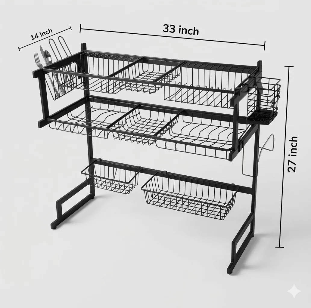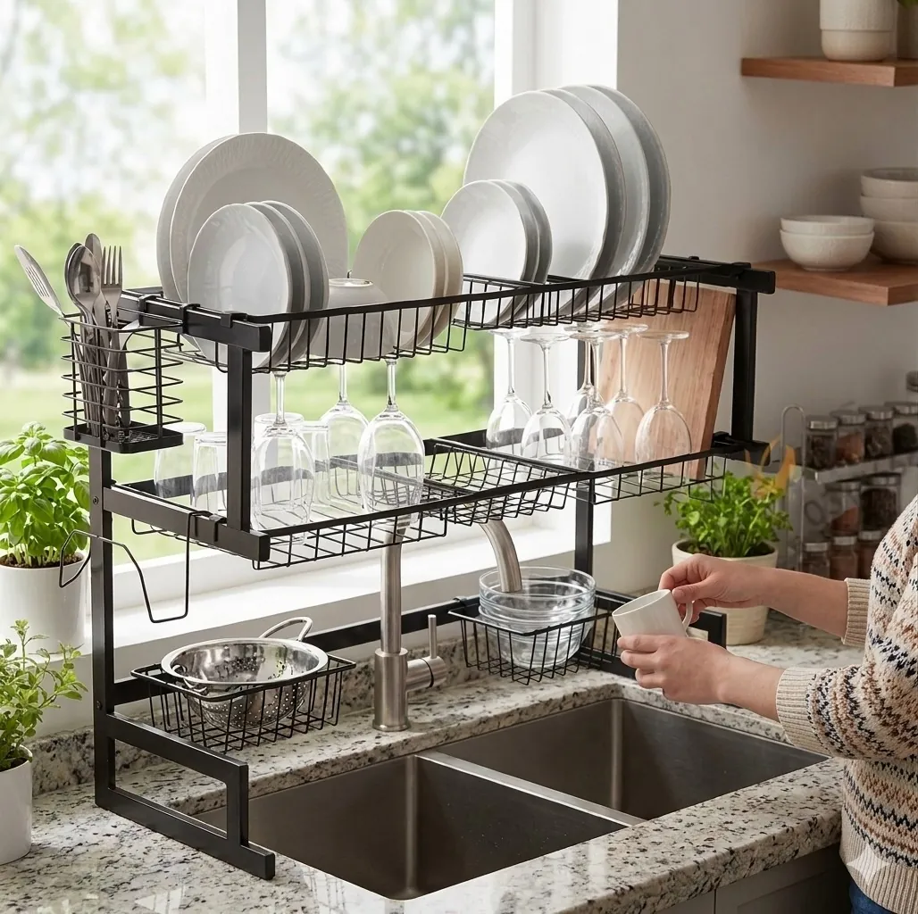 Transform your kitchen organization with the ultimate Space-Saving Over-the-Sink Drying Rack. Designed to fit over most standard sinks, this two-tier organizer utilizes vertical space to dry your dishes without cluttering your countertops. Crafted from high-grade, rust-proof carbon steel, the sturdy frame supports a full load of dishes, including heavy stoneware and pots.