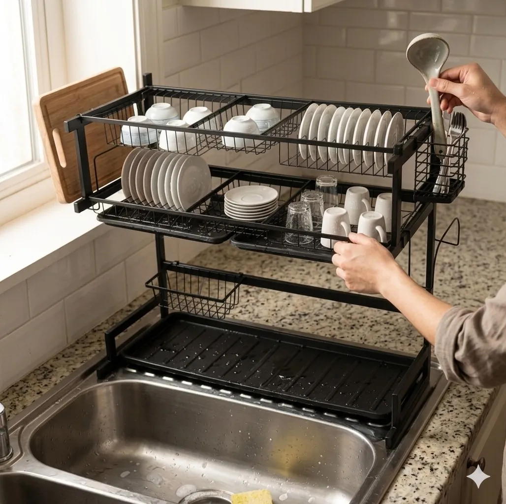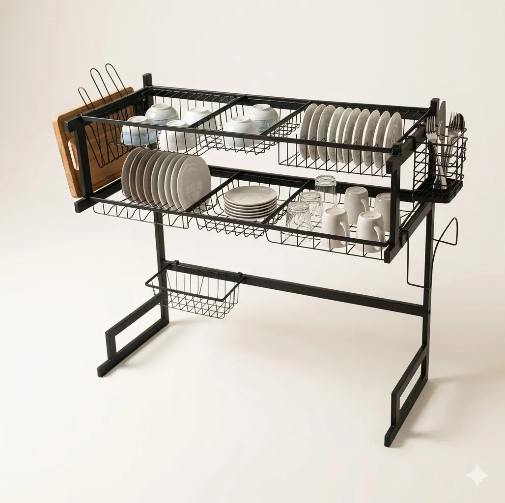The modular design includes specialized zones: a top tier for large plates and bowls, a bottom tier for cups and saucers, and side attachments for a cutting board, knives, and silverware. By draining water directly into the sink, it keeps your kitchen surfaces bone-dry and hygienic. Itโs the perfect solution for small apartments, busy households, and modern minimalist kitchens.