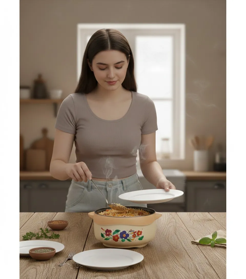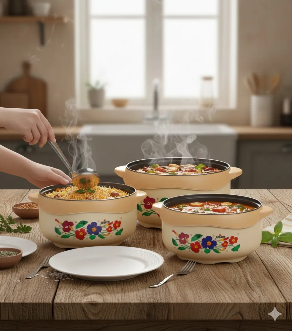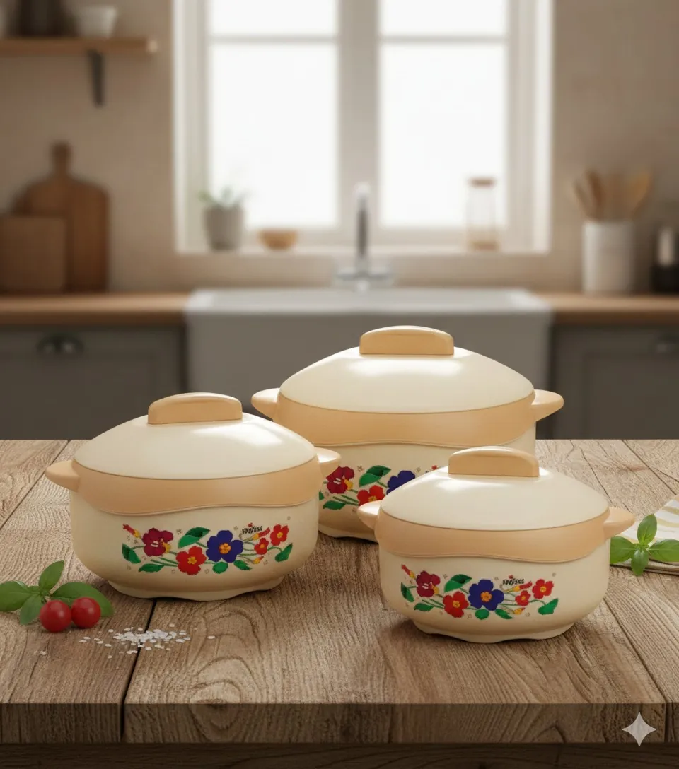 Elevate your dining experience with our Elegant Floral Insulated Hot Pot Set. This 3-piece collection is designed for the modern kitchen, blending aesthetic appeal with high-performance heat retention. Each casserole is crafted with a high-quality stainless steel inner lining and a durable, BPA-free plastic exterior, separated by high-grade PUF insulation.