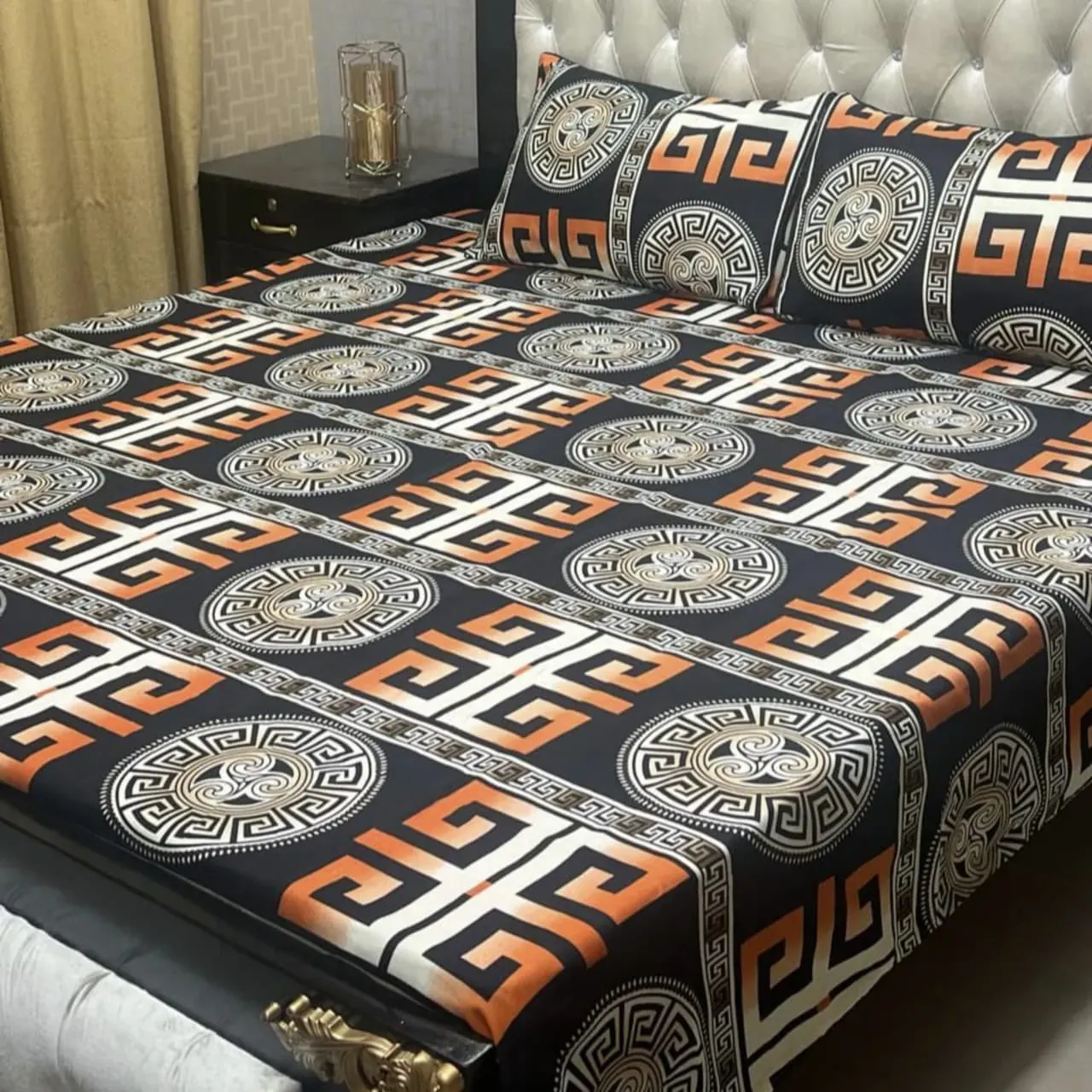 Upgrade your bedroom décor with this luxurious 3D-Crystal cotton king size bedsheet set. Crafted from high-quality cotton fabric, this bedsheet offers exceptional comfort, breathability, and durability. The vibrant geometric pattern, featuring bold black, orange, and white hues, adds a modern touch to your space while complementing various interior styles. Included in the set are two matching pillow