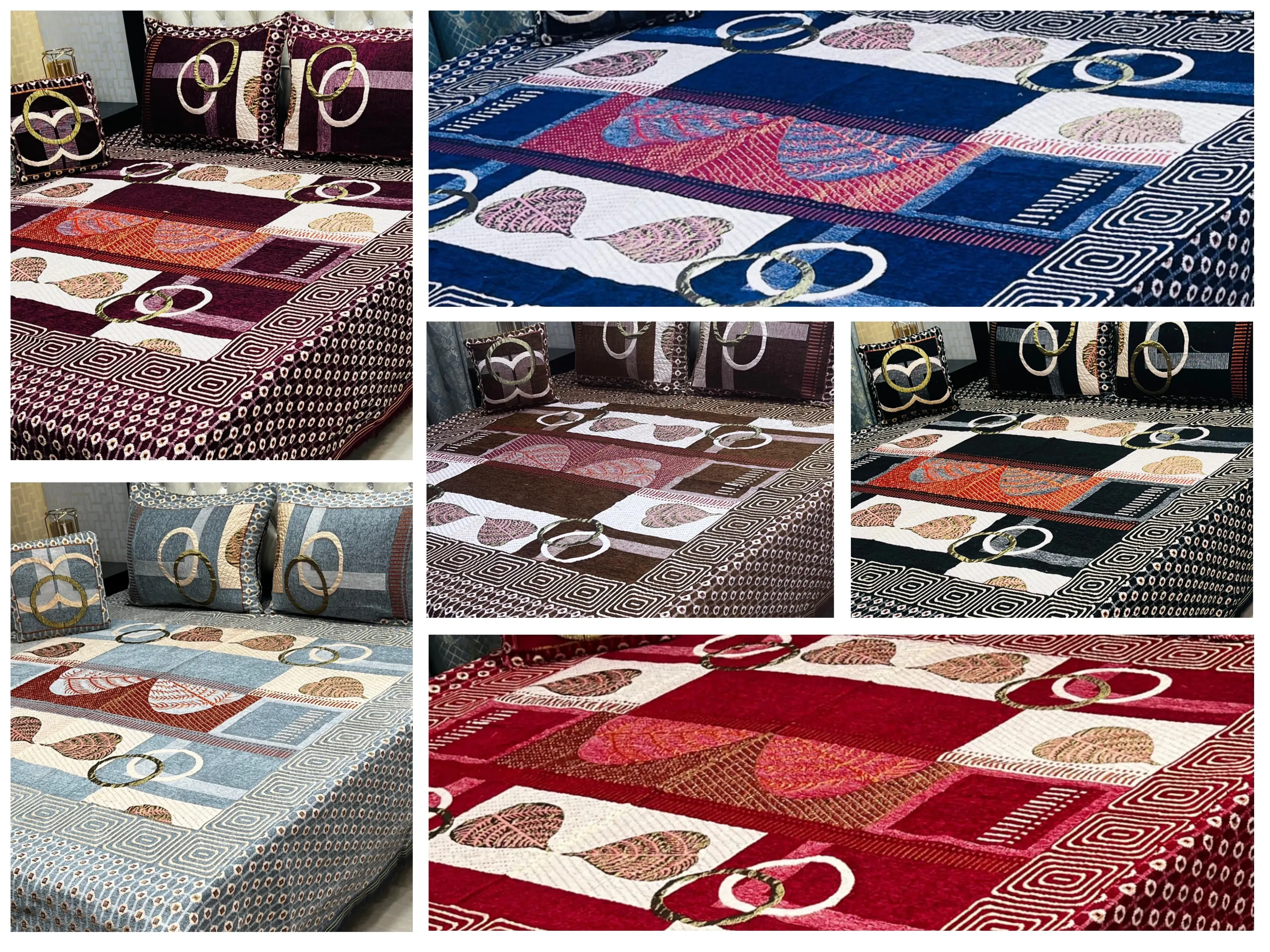Premium 4Pc King Size Velvet Jacquard Bedsheet Set – Geometric Design | 1 Bedsheet + 2 Pillow Covers + 1 Cushion Cover | 100% Color Guarantee